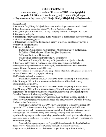 OGŁOSZENIE zawiadamiam, że w dniu 30 marca 2007 roku (piątek) o godz.13:00 w sali konferencyjnej Urzędu Miejskiego w Bojanowie odbędzie się VII Sesja Rady Miejskiej w Bojanowie =============================================== Porządek sesji: 1. Otwarcie Sesji Rady Miejskiej oraz stwierdzenie prawomocności obrad. 2. Przedstawienie porządku obrad VII Sesji Rady Miejskiej. 3. Przyjęcie protokółu Nr VI/07 z sesji odbytej w dniu 28 lutego 2007 roku. 4. Zapytania radnych. 5. Informacja Przewodniczącego Rady Miejskiej o działaniach podejmowanych w okresie międzysesyjnym. 6. Informacja Burmistrza Bojanowa o pracy w okresie międzysesyjnym i o wydanych zarządzeniach. 7. Ocena działalności: 1/ Zakładu Gospodarki Komunalnej i Mieszkaniowej w Gołaszynie, 2/ Zakładu Wodociągów i Kanalizacji w Bojanowie, 3/ Domu Kultury w Bojanowie, 4/ Miejskiej Biblioteki Publicznej w Bojanowie, 5/ Ośrodka Pomocy Społecznej w Bojanowie – podjęcie uchwały. 8. Przyjęcie informacji z realizacji gminnego programu profilaktyki i rozwiązywania problemów alkoholowych, przeciwdziałania narkomanii na terenie Gminy Bojanowo za 2006 rok. 9. Sprawozdanie z realizacji „Planu gospodarki odpadami dla gminy Bojanowo na lata 2004 – 2011” – podjęcie uchwały. 10. Podjęcie uchwał w sprawie: 1/ zmiany Uchwały Nr XXVII/192/05 Rady Miejskiej w Bojanowie z dnia 24 lutego 2005 roku w sprawie nadania Statutu Ośrodka Pomocy Społecznej w Bojanowie, 2/ zmiany Uchwały Nr XXVII/194/05 Rady Miejskiej w Bojanowie z dnia 24 lutego 2005 roku w sprawie szczegółowych warunków przyznawania i odpłatności za usługi opiekuńcze i specjalistyczne usługi świadczone przez Ośrodek Pomocy Społecznej w Bojanowie, 3/ ustalenia najniższego wynagrodzenia i wartości jednego punktu w tabeli stawek wynagrodzenia zasadniczego dla pracowników Ośrodka Pomocy Społecznej w Bojanowie, 4/ zmiany Uchwały nr V/36/97 Rady Miejskiej w Bojanowie z dnia 30 stycznia 2007 roku w sprawie Regulaminu określającego wysokość oraz szczegółowe warunki przyznawania nauczycielom dodatków motywacyjnego, funkcyjnego i za warunki pracy oraz szczegółowy sposób obliczania i wypłacania wynagrodzenia za godziny ponadwymiarowe i godziny doraźnych zastępstw oraz wysokość i warunki wypłacania innych świadczeń wynikających ze stosunku pracy, 5/ nieodpłatnego przejęcia od Agencji Nieruchomości Rolnych Oddział Terenowy w Poznaniu na rzecz Gminy nieruchomości zabudowanej oczyszczalnią ścieków wraz z infrastrukturą techniczną w Zaborowiach, 6/ zmian w budżecie gminy Bojanowo na rok 2007, 7/ zaciągnięcia zobowiązań w zakresie inwestycji p.n. ”Budowa kanalizacji sanitarnej z przykanalikami we wsi Zaborowice”, 8/ zaciągnięcia zobowiązań w zakresie inwestycji p.n. „Budowa kanalizacji sanitarnej z przykanalikami w Bojanowie w ul. Nowej, Platanowej, Lipowej, Drzymały, Leśnej, Piaskowej, Zacisze, 17 Stycznia, Gołaszyńskiej”, 9/ zaciągnięcia zobowiązań w zakresie inwestycji p.n. „Budowa kanalizacji sanitarnej z przykanalikami w Golinie Wielkiej, Golince i m. Bojanowo w ulicach Słowackiego i. Norwida, 10/ zaciągnięcia zobowiązania wekslowego jako zabezpieczenie prawidłowego i terminowego wydatkowania przyznanych środków finansowych z Funduszu Rozwoju Kultury Fizycznej na dofinansowanie przedsięwzięcia p.n. „Budowa wielofunkcyjnego boiska sportowego ogólnie dostępnego dla dzieci i młodzieży”, 11/ nieodpłatnego przejęcia od Skarbu Państwa na rzecz Gminy Bojanowo udziału wynoszącego ½ część w prawie własności nieruchomości zabudowanej położonej w Giżynie oznaczonej numerem ewidencyjnym nr 72/2 o powierzchni 0,0300 ha . 11. Odpowiedzi na zapytania radnych. 12. Wolne głosy i wnioski. 13. Zakończenie. Zapraszam mieszkańców do udziału w sesji. Przewodniczący Rady Miejskiej ( - )Stanisław Tomiczak