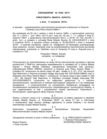 ZARZĄDZENIE Nr 1048 / 2013 PREZYDENTA MIASTA SOPOTU z dnia 11 września 2013r. w sprawie: wydzierżawienia nieruchomości gruntowych położonych w Sopocie i Gdańsku przy Placu Dwóch Miast 1 Na podstawie art.30 ust.1 ustawy z dnia 8 marca 1990r. o samorządzie gminnym (Dz. U. z 2013 r. poz. 594) i art.13 ust.1 oraz art. 35 ust. 1 i 2 ustawy z dnia 21 sierpnia 1997r. o gospodarce nieruchomościami (Dz.U. z 2010r. Nr 102, poz.651 z późn. zm.) w związku z uchwałą Rady Miasta Sopotu Nr XXXI/435/2013 z dnia 6 września 2013r. w sprawie zmiany uchwały nr XLI/523/2010 z dnia 3 września 2010r. w sprawie wyrażenia zgody na odstąpienie od obowiązku przetargowego trybu zawarcia umowy dzierżawy oraz na wydzierżawienie nieruchomości gruntowej zabudowanej, położonej w Gdańsku przy ul. Gospody 37 oraz w Sopocie przy ul. Łokietka 61 i 63 Prezydent Miasta Sopotu zarządza , co następuje: § 1 Przeznaczam do wydzierżawienia na okres 40 lat nieruchomości gruntowe o łącznej powierzchni 7,7806 ha, stanowiące współwłasność w udziałach po ½ Gminy Miasta Sopotu i Gminy Miasta Gdańska, zabudowane budynkiem hali sportowowidowiskowej ERGO ARENA, położone w Sopocie przy Placu Dwóch Miast 1 / Łokietka 63, oznaczone na karcie mapy 45 jako działki nr 5, 6/1, 2/12, dla których Sąd Rejonowy w Sopocie prowadzi księgę wieczystą KW GD1S/00012660/5 oraz w Gdańsku przy Placu Dwóch Miast 1, oznaczone na karcie mapy 4 jako działki nr 239 i 241, dla których Sąd Rejonowy w Gdańsku prowadzi księgę wieczystą KW GD1G/00228097/3, oznaczone na załączniku graficznym nr 1 kolorem pomarańczowym, wymienione w wykazie stanowiącym załącznik nr 2 do niniejszego zarządzenia - z przeznaczeniem na prowadzenie działalności polegającej na kompleksowym zarządzaniu technicznym, eksploatacyjnym i komercyjnym obiektu, w tym organizowaniu w hali i pozyskiwaniu imprez sportowych, kulturalnych i komercyjnych, obejmujących także imprezy masowe. § 2 Wykaz, o którym mowa w § 1 podlega wywieszeniu na tablicy ogłoszeń w siedzibie Urzędu Miasta Sopotu, ul. Kościuszki 25/27, na okres 21 dni, a informacja o wywieszeniu tego wykazu podlega ogłoszeniu w prasie lokalnej i na stronie internetowej Urzędu Miasta Sopotu. § 3 Wykonanie zarządzenia powierzam Naczelnikowi Wydziału Gospodarki Nieruchomościami Urzędu Miasta Sopotu. § 4 Zarządzenie wchodzi w życie z dniem podpisania. Radca Prawny /-/ Ewa Frymark Z up. PREZYDENTA MIASTA /-/ Bartosz Piotrusiewicz WICEPREZYDENT MIASTA Załącznik nr 2 do Zarządzenia nr 1048/2013 Prezydenta Miasta Sopotu z dnia 11 .09. 2013r. Prezydent Miasta Sopotu Na podstawie art.35 ust.1 i 2 ustawy z dnia 21 sierpnia 1997r. o gospodarce nieruchomościami ( Dz.U. z 2010r. Nr 102 poz.651 ze zm.) podaje do publicznej wiadomości wykaz nieruchomości gruntowych położonych w Sopocie i Gdańsku przy ul. Placu Dwóch Miast 1 przeznaczonych do wydzierżawienia w trybie bezprzetargowym na okres 40 lat z przeznaczeniem na prowadzenie działalności polegającej na kompleksowym zarządzaniu technicznym, eksploatacyjnym i komercyjnym obiektu, w tym organizowaniu w hali i pozyskiwaniu imprez sportowych, kulturalnych i komercyjnych, obejmujących także imprezy masowe. 1. nieruchomości gruntowe stanowiące współwłasność w udziałach po ½ Gminy Miasta Sopotu i Gminy Miasta Gdańska objęte księgami wieczystymi: KW GD1S/00012660/5 Sądu Rejonowego w Sopocie i KW GD1G/00228097/3 Sądu Rejonowego w Gdańsku 2. oznaczenie nieruchomości wg danych z ewidencji gruntów: powierzchnia dzierżawy : 7,7806 ha w Sopocie Plac Dwóch Miast 1 / ul. Łokietka 63 - karta mapy 45 działki : nr 5 obszaru 0,8000ha, nr 6/1 obszaru 2,0690 ha, nr 2/12 obszaru 1,4148 ha w Gdańsku Plac Dwóch Miast 1 - karta mapy 4 działka nr 239 obszaru 2,0689 ha, nr 241 obszaru 1,4279 ha 3. opis nieruchomości: nieruchomość gruntowa zabudowana budynkiem hali sportowo-widowiskowej ERGO ARENA, 4. przeznaczenie w miejscowym planie zagospodarowania przestrzennego miasta Sopotu: usługi, zakres dopuszczalnych funkcji usługowych – wielkokubaturowy obiekt sportowo-widowiskowy , parkingi, 5. forma : dzierżawa na okres 40 lat 6. opłaty i terminy wnoszenia: - czynsz dzierżawny będzie stanowić aport o wartości 4.634.122,00 zł., który odpowiada udziałowi ½ Gminy Miasta Sopotu w wartości prawa dzierżawy ustalonej przez rzeczoznawcę majątkowego za okres następnych 30 lat w zamian za co Gmina Miasta Sopotu obejmie 9268 nowych udziałów po 500 zł. każdy. Wartość aportu podlega opodatkowaniu podatkiem VAT wg stawki 23%. - podatek od nieruchomości Wykaz wywieszono od 12.09.2013r. do 02.10.2013r. Z up. Prezydenta Miasta Z up. Prezydenta Miasta /-/ Hanna Moskalewicz /-/ Bartosz Piotrusiewicz Z-ca Naczelnika Wydziału Wiceprezydent Miasta