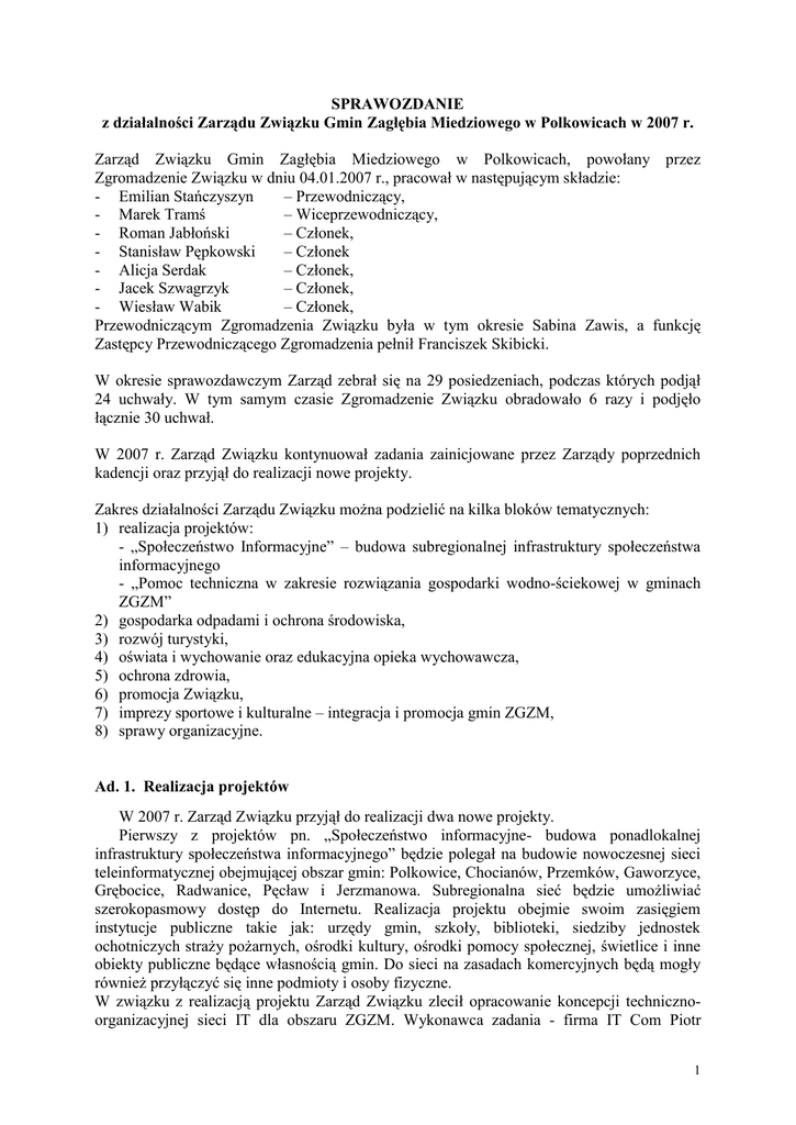 SPRAWOZDANIE z działalności Zarządu Związku Gmin Zagłębia Miedziowego w Polkowicach w 2007 r. Zarząd Związku Gmin Zagłębia Miedziowego w Polkowicach, powołany przez Zgromadzenie Związku w dniu 04.01.2007 r., pracował w następującym składzie: - Emilian Stańczyszyn – Przewodniczący, - Marek Tramś – Wiceprzewodniczący, - Roman Jabłoński – Członek, - Stanisław Pępkowski – Członek - Alicja Serdak – Członek, - Jacek Szwagrzyk – Członek, - Wiesław Wabik – Członek, Przewodniczącym Zgromadzenia Związku była w tym okresie Sabina Zawis, a funkcję Zastępcy Przewodniczącego Zgromadzenia pełnił Franciszek Skibicki. W okresie sprawozdawczym Zarząd zebrał się na 29 posiedzeniach, podczas których podjął 24 uchwały. W tym samym czasie Zgromadzenie Związku obradowało 6 razy i podjęło łącznie 30 uchwał. W 2007 r. Zarząd Związku kontynuował zadania zainicjowane przez Zarządy poprzednich kadencji oraz przyjął do realizacji nowe projekty. Zakres działalności Zarządu Związku można podzielić na kilka bloków tematycznych: 1) realizacja projektów: - „Społeczeństwo Informacyjne” – budowa subregionalnej infrastruktury społeczeństwa informacyjnego - „Pomoc techniczna w zakresie rozwiązania gospodarki wodno-ściekowej w gminach ZGZM” 2) gospodarka odpadami i ochrona środowiska, 3) rozwój turystyki, 4) oświata i wychowanie oraz edukacyjna opieka wychowawcza, 5) ochrona zdrowia, 6) promocja Związku, 7) imprezy sportowe i kulturalne – integracja i promocja gmin ZGZM, 8) sprawy organizacyjne. Ad. 1. Realizacja projektów W 2007 r. Zarząd Związku przyjął do realizacji dwa nowe projekty. Pierwszy z projektów pn. „Społeczeństwo informacyjne- budowa ponadlokalnej infrastruktury społeczeństwa informacyjnego” będzie polegał na budowie nowoczesnej sieci teleinformatycznej obejmującej obszar gmin: Polkowice, Chocianów, Przemków, Gaworzyce, Grębocice, Radwanice, Pęcław i Jerzmanowa. Subregionalna sieć będzie umożliwiać szerokopasmowy dostęp do Internetu. Realizacja projektu obejmie swoim zasięgiem instytucje publiczne takie jak: urzędy gmin, szkoły, biblioteki, siedziby jednostek ochotniczych straży pożarnych, ośrodki kultury, ośrodki pomocy społecznej, świetlice i inne obiekty publiczne będące własnością gmin. Do sieci na zasadach komercyjnych będą mogły również przyłączyć się inne podmioty i osoby fizyczne. W związku z realizacją projektu Zarząd Związku zlecił opracowanie koncepcji technicznoorganizacyjnej sieci IT dla obszaru ZGZM. Wykonawca zadania - firma IT Com Piotr 1 Serwadczak z siedzibą we Wrocławiu - został wyłoniony w trybie przetargu nieograniczonego. Opracowana przez Wykonawcę „Koncepcja …” uzyskała pozytywną opinię Urzędu Marszałkowskiego Województwa Dolnośląskiego dotyczącą jej zgodności w zakresie przedmiotowym i podmiotowym w odniesieniu do założeń Regionalnego Projektu Operacyjnego Województwa Dolnośląskiego na lata 2007-2013. Kolejne etapy realizacji projektu podjęte zostaną w 2008 r. Drugi projekt, pn. „Pomoc techniczna w zakresie rozwiązania gospodarki wodnościekowej w gminach ZGZM”, związany jest z uporządkowaniem gospodarki wodnościekowej na obszarze gmin należących do Związku. W 2007 r. Zarząd Związku zlecił „Opracowanie koncepcji rozwiązania gospodarki wodno – ściekowej w gminach ZGZM z analizą możliwości współfinansowania optymalnego wariantu i przygotowaniem dokumentacji aplikacyjnej”. Wykonawcą zadania jest konsorcjum firm: Agencja Rozwoju Regionalnego ARLEG S.A. oraz Pracownia Projektowa Instalacji Sanitarnych „INSTALPROJEKT” w Legnicy – wyłonione w drodze przetargu nieograniczonego. W grudniu 2007 r. Wykonawca zakończył realizację etapu I i II umowy, tj. opracował koncepcję rozwiązania gospodarki wodno – ściekowej w gminach ZGZM oraz analizę możliwości współfinansowania optymalnego wariantu wynikającego z koncepcji pod kątem pozyskania środków z UE. Odbioru merytorycznego opracowanych dokumentów dokonała powołana w tym celu Rada Techniczna, w skład której weszli pracownicy urzędów poszczególnych gmin. Etap III umowy, czyli opracowanie dokumentacji aplikacyjnej dla pozyskania finansowania projektu ze środków WFOŚiGW oraz w ramach Regionalnego Programu Operacyjnego i Programu Rozwoju Obszarów Wiejskich będzie realizowany w 2008 r. Nakłady poniesione w 2007 r. w związku z realizacją projektu „Pomoc techniczna w zakresie gospodarki ściekowej …” wyniosły łącznie 128.100 zł. Ad. 2. Gospodarka odpadami i ochrona środowiska Od połowy 2006 r. na terenie Związku Gmin Zagłębia Miedziowego prowadzona jest selektywna zbiórka odpadów. W celu uruchomienia selektywnej zbiórki Związek zakupił w 2006 r. łącznie 804 pojemniki do selektywnej zbiórki szkła bezbarwnego, szkła kolorowego i tworzyw sztucznych (tzw. PET). Pojemniki zostały rozstawione kompletami (po jednym pojemniku na każdy rodzaj odpadów) we wszystkich miejscowościach na terenie Związku. Ze względu na napływające do Związku informacje o zapotrzebowaniu na dodatkowe pojemniki do selektywnej zbiórki odpadów - Zarząd Związku podjął decyzję o zakupie w 2007 roku dodatkowych pojemników. Dostawca – firma Aku Composites Sp. z o.o. w Policach - został wyłoniony w trybie przetargu nieograniczonego. Cena ofertowa dostawy 92 pojemników wyniosła 134.141,44 zł. Dostawa pojemników realizowana była w marcu 2007 r. Dodatkowo Wykonawca przekazał nieodpłatnie 3 pojemniki (1 komplet). Dostarczony komplet pojemników był rekompensatą dla Zamawiającego w związku z nieprawidłowym wykonaniem pojemników do zbiórki tworzyw sztucznych (pojemniki posiadają jeden otwór wrzutowy zamiast dwóch umieszczonych na przeciwległych ścianach). Pojemniki zostały nieodpłatnie przekazane na własność gmin zgodnie z decyzją Zgromadzenia ZGZM (Uchwała Nr III/22/07 z dnia 19.04.