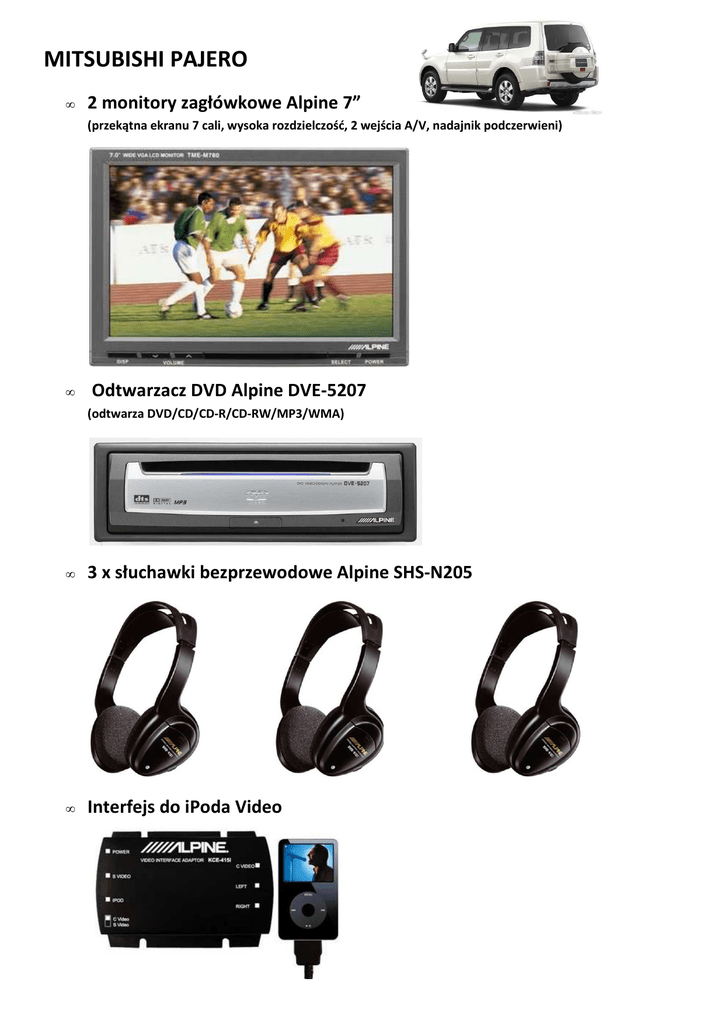 MITSUBISHI PAJERO • 2 monitory zagłówkowe Alpine 7” (przekątna ekranu 7 cali, wysoka rozdzielczość, 2 wejścia A/V, nadajnik podczerwieni) • Odtwarzacz DVD Alpine DVE-5207 (odtwarza DVD/CD/CD-R/CD-RW/MP3/WMA) • 3 x słuchawki bezprzewodowe Alpine SHS-N205 • Interfejs do iPoda Video