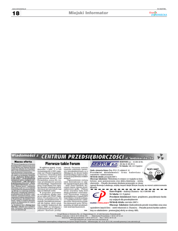 www.ostrowiecka.pl Nr 42(2739) 18 Nasza oferta I Forum Gospodarcze w Ostrowcu Świętokrzyskim organizowane przez Urząd Miasta oraz Agencję Rozwoju Lokalnego odbędzie się 19 października w sali wystawienniczej w Centrum Kształcenia Ustawicznego; Gminne Centrum Informacji ogłasza zapisy na następujące bezpłatne kursy: „Podstawy obsługi pakietu MS Office”; „Profesjonalizacja umiejętności pracy z komputerem”, „Asertywność”, „ABC Internetu i projektowania stron www”, „Obsługa urządzeń biurowych” oraz warsztat „Szukam pracy”. Dodatkowe informacje w pok. nr 7 i 9 w budynku Centrum Biurowo-Konferencyjnego; ARL Sp. z o.o. informuje, że można skorzystać z bezpłatnego szkolenia z przedsiębiorczości dla kobiet z województwa świętokrzyskiego, które organizuje Fundacja Agencja Rozwoju Regionalnego. Szczegółowe informacje i zapisy w Punkcie Konsultacyjnym, ul. Siennieńska 38, I piętro, nr tel. 41 247 62 61; dwudniowy kurs „Obsługa kasy fiskalnej” odbędzie się w październiku. Formularz zgłoszeniowy na www.arl.ostrowiec.pl. Miejski Informator Pierwsze takie Forum W najbliższy piątek, 19 października, o godz. 11 w sali wystawienniczej w CKU rozpocznie się I Forum Gospodarcze w Ostrowcu Świętokrzyskim „Wspieranie innowacji oraz wykorzystanie dotacji z Unii Europejskiej szansą dla rozwoju przedsiębiorstw powiatu ostrowieckiego”. Organizowane przez Urząd Miasta oraz Agencję Rozwoju Lokalnego przedsięwzięcie jest pierwszym tego typu na lokalnym rynku. W programie przewidziano wystąpienia między innymi na temat roli CPiAZ i Inkubatora Przedsiębiorczości dla rozwoju przedsiębiorczości w regionie, pozyskiwania inwestorów dla regionu, oferty ośrodków naukowo badawczych dla sektora MSP, czy informacja o realizowanych przez ARL projektach i k lastrach przemy- słowych. Poruszona zostanie tematyka wdrażania innowacji w przedsiębiorstwach, co w zbliżającym się okresie będzie miało decydujący wpływ na skuteczność pozyskiwania środków unijnych. - Zaprezentowane zostaną także doświadczenia ze szkoleń organizowanych przez ARL – mówi Paweł Rybiński, kierownik działu rozwoju przedsiębiorczości spółki. – Podczas forum uczestnicy będą mieli okazję posłuchać o instrumentach f inansowego wsparcia przedsiębiorstw w ramach RPO województwa świętokrzyskiego, a o współfinansowaniu i zabezpieczeniu finansowym projektów dotowanych przez UE wypowiedzą się także przedstawiciele instytucji finansowych. mac SEBTOM s.c. – 41 265 22 65; -66; fax 41 265 20 11 Nr lokalu: 109, 110 (I piętro) Godz. otwarcia biura: Pon- Pt 8- 17; sobota 8- 14 Przedmiot działalności: firma budowlana i remontowo- wykończeniowa Od kiedy działa: początek 2007 r. Dlaczego Inkubator: Wybraliśmy to miejsce ze względu na komfortowe, nowe pomieszczenia oraz dobrą lokalizację – mówią właściciele. – Ponadto doceniamy działania promocyjne ze strony Agencji Rozwoju Lokalnego, między innymi dzięki którym liczymy na wzrost zainteresowania klientów. Euro-Projekt – Andrzej Chamera - tel. 0 506 600 408 Nr lokalu: 111 (I piętro) Przedmiot działalności: biuro projektowe, pozyskiwanie funduszy unijnych dla przedsiębiorstw Od kiedy działa: czerwiec 2007 r. Dlaczego Inkubator: Zadecydowała przede wszystkim cena oraz sąsiedztwo innych firm – mówi właściciel A. Chamera. – Ponadto jestem bardzo zadowolony ze szkoleniowo- promocyjnej oferty ze strony ARL. Urząd Miasta w Ostrowcu Św., ul. Głogowskiego 3/5 , 27-400 Ostrowiec Świętokrzyski Telefony: Centrala (+48 41) 26 72 100 do 109 Sekretariat Prezydenta (+48 41) 26 72 115 Sekretariat Wiceprezydentów (+48 41) 26 72 117 Fax (+48 41) 26 72 110 www.um.ostrowiec.pl, e-mail [email protected] Informator samorządowy redagowany jest przez Zespół Prasowo - Informacyjny. tel. (0 41) 26 72 130, [email protected]