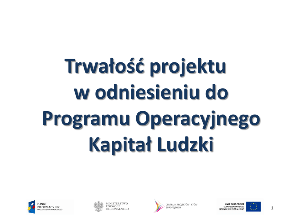 Trwałość projektu w odniesieniu do Programu Operacyjnego Kapitał Ludzki 1 WPROWADZENIE Logika interwencji PO KL wskazuje na konieczność stymulowania określonych inicjatyw, które po początkowym okresie finansowania ze środków EFS powinny być przejmowane przez podmioty odpowiedzialne za ich prowadzenie w krajowym porządku prawnym lub funkcjonować samodzielnie. 2 TRWAŁOŚĆ PROJEKTU W PO KL MOŻE BYĆ ZWIĄZANA Z: zachowaniem trwałości operacji wynikającym z art. 57 rozporządzenia 1083/2006/WE, zasadą dodatkowości funduszy strukturalnych, zawartą w art. 15 ust. 1 rozporządzenia 1083/2006/WE, wymogami zawartymi w Planie Działań i zapisami we wniosku o dofinansowanie i umowie o dofinansowaniu projektu. 3 ZACHOWANIE TRWAŁOŚCI OPERACJI Państwo członkowskie lub instytucja zarządzająca zapewniają, aby operacja obejmująca inwestycje w infrastrukturę lub inwestycje produkcyjne zachowała wkład funduszy wyłącznie jeżeli w terminie 5lat (3 lat dla MŚP) od jej zakończenia nie zostanie poddana zasadniczej modyfikacji wynikającej ze zmiany charakteru własności elementu infrastruktury albo z zaprzestania działalności produkcyjnej i mającej wpływ na charakter lub warunki realizacji operacji lub powodującej uzyskanie nieuzasadnionej korzyści przez przedsiębiorstwo lub podmiot publiczny. Uznaje się, ze działania wchodzące w zakres pomocy z EFS nie zachowały tego wkładu wyłącznie wtedy, gdy są one zobowiązane do utrzymania inwestycji w ramach mających zastosowanie przepisów dotyczących pomocy publicznej w rozumieniu art. 107 Traktatu o funkcjonowaniu Unii Europejskiej i jeśli zostały one poddane zasadniczej modyfikacji spowodowanej zaprzestaniem działalności produkcyjnej w terminie określonym w tych przepisach. 4 ZASADA DODATKOWOŚCI FUNDUSZY STRUKTURALNYCH W myśl tej zasady wkłady funduszy strukturalnych nie zastępują publicznych lub równoważnych wydatków strukturalnych ponoszonych przez państwo członkowskie (np. w odniesieniu do poddziałania 9.1.1 PO KL – zachowanie trwałości utworzonych ośrodków wychowania przedszkolnego) 5 ZACHOWANIE TRWAŁOŚCI OPERACJI Trwałość projektu, o której mowa w art. 57 rozporządzenie (WE) nr 1083/2006 niekoniecznie odnosi się do wszystkich zakupionych w ramach projektu środków trwałych oraz wartości niematerialnych i prawnych. Zgodnie z interpretacja IZ PO KL stwierdzenie czy zasada trwałości projektu będzie miała zastosowanie w danym projekcie finansowanym z EFS, będzie uzależnione od indywidualnej oceny danego projektu, tj. form wsparcia, które były realizowane w ramach tego projektu. 6 ZACHOWANIE TRWAŁOŚCI OPERACJI Po spełnieniu, łącznie, następujących warunków, w projekcie potencjalnie może wystąpić problem trwałości projektu: Beneficjentami projektu są firmy lub instytucje publiczne. Co do zasady, trwałość projektu nie dotyczy projektów realizowanych przez organizacje pozarządowe oraz związki zawodowe, bądź inne instytucje podobnego typu. Projekt przechodzi znaczącą modyfikację po jego zakończeniu 7 ZACHOWANIE TRWAŁOŚCI OPERACJI O „znacznej modyfikacji” w projekcie finansowanym z EFS można mówić w przypadku gdy: następuje zmiana charakteru własności (przeznaczenia) infrastruktury zakupionej na potrzeby realizacji projektu (aktywa zakupione w ramach cross-financingu) lub u beneficjenta następuje zaprzestanie działalności produkcyjnej dóbr lub usług danego typu. Jednak przeniesienie własności nie oznacza zaprzestania działalności produkcyjnej, chyba, że nowy właściciel zaprzestanie tej działalności lub przeniesie ją do innego regionu lub państwa członkowskiego. 8 ZACHOWANIE TRWAŁOŚCI OPERACJI W celu identyfikacji naruszenia zasady trwałości projektu, sprawdzane jest czy znacząca modyfikacja: wpływa na charakter projektu (główne działania podejmowane w ramach projektu, np. szkolenia) wpływa na warunki wdrażania projektu (po porównaniu zmienionych warunków wdrażania projektu z początkowym opisem oraz celem projektu, zgodnie z którymi projekt otrzymał dofinansowanie) daje nieuzasadnioną korzyść firmie (występuje jedynie w projektach objętych regułami pomocy publicznej) Tak więc, analizując spełnienie zasady trwałości projektu należy wziąć po uwagę charakter projektu, warunki zaprzestania działalności oraz warunki, zgodnie z którymi została udzielona pomoc beneficjentowi. 9 PRZYKŁAD Powiatowy Urząd Pracy w miejscowości X w projekcie realizowanym w ramach Poddziałania 6.1.1 PO KL udziela pomocy publicznej na subsydiowanie zatrudnienia. Zgodnie z § 8 ust. 2 rozporządzenia Ministra Rozwoju Regionalnego z dnia 6 maja 2008 r. w sprawie udzielania pomocy publicznej w ramach Programu Operacyjnego Kapitał Ludzki (Dz. U. Nr 90 poz. 557, Nr 224, poz. 1484) pracownicy znajdujący się w szczególnie niekorzystnej sytuacji są uprawnieni do nieprzerwanego zatrudnienia przez okres co najmniej 12 miesięcy, a umowa o pracę może zostać rozwiązana tylko w przypadku naruszenia przez pracownika obowiązków pracowniczych. Mając na uwadze powyższe, trwałość projektu zostanie naruszona w przypadku gdy okres zatrudnienia będzie krótszy niż 12 miesięcy, lub odpowiednio 24 miesiące w przypadku pracowników znajdujących się w bardzo niekorzystnej sytuacji. Jednocześnie zgodnie z przepisami rozporządzenia pomoc przyznana beneficjentowi pomocy jest pomniejszana proporcjonalnie. 10 ZASADA DODATKOWOŚCI FUNDUSZY STRUKTURALNYCH Trwałość projektów w tym wymiarze oznacza, że środki pochodzące z funduszy strukturalnych nie powinny zastępować środków publicznych, a jedynie umożliwiać rozpoczęcie realizacji działań, których trwałość powinna zostać utrzymana ze środków krajowych. Fundusze strukturalne mogą być szczególnie pomocne w pierwszym okresie realizacji projektu, który z reguły jest związany z poniesieniem większych kosztów, przeznaczonych np. na zakup wyposaże