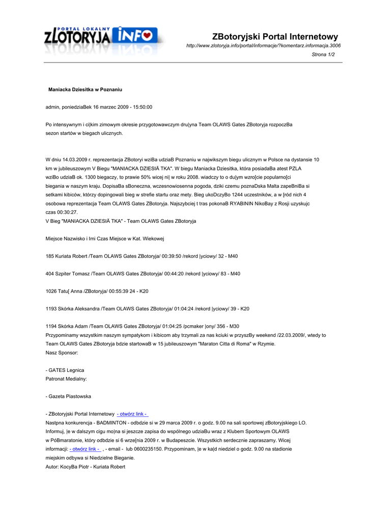 ZBotoryjski Portal Internetowy http://www.zlotoryja.info/portal/informacje/?komentarz.informacja.3006 Strona 1/2 Maniacka Dziesitka w Poznaniu admin, poniedziaBek 16 marzec 2009 - 15:50:00 Po intensywnym i ci|kim zimowym okresie przygotowawczym dru|yna Team OLAWS Gates ZBotoryja rozpoczBa sezon startów w biegach ulicznych. W dniu 14.03.2009 r. reprezentacja ZBotoryi wziBa udziaB Poznaniu w najwikszym biegu ulicznym w Polsce na dystansie 10 km w jubileuszowym V Biegu "MANIACKA DZIESIÄ TKA". W biegu Maniacka Dziesitka, która posiadaBa atest PZLA wziBo udziaB ok. 1300 biegaczy, to prawie 50% wicej ni| w roku 2008. wiadczy to o du|ym wzro[cie popularno[ci biegania w naszym kraju. DopisaBa sBoneczna, wczesnowiosenna pogoda, dziki czemu poznaDska Malta zapeBniBa si setkami kibiców, którzy dopingowali bieg w strefie startu oraz mety. Bieg ukoDczyBo 1244 uczestników, a w [ród nich 4 osobowa reprezentacja Team OLAWS Gates ZBotoryja. Najszybciej t tras pokonaB RYABININ NikoBay z Rosji uzyskujc czas 00:30:27. V Bieg "MANIACKA DZIESIÄ TKA" - Team OLAWS Gates ZBotoryja Miejsce Nazwisko i Imi Czas Miejsce w Kat. Wiekowej 185 Kuriata Robert /Team OLAWS Gates ZBotoryja/ 00:39:50 /rekord |yciowy/ 32 - M40 404 Szpiter Tomasz /Team OLAWS Gates ZBotoryja/ 00:44:20 /rekord |yciowy/ 83 - M40 1026 Tatu[ Anna /ZBotoryja/ 00:55:39 24 - K20 1193 Skórka Aleksandra /Team OLAWS Gates ZBotoryja/ 01:04:24 /rekord |yciowy/ 39 - K20 1194 Skórka Adam /Team OLAWS Gates ZBotoryja/ 01:04:25 /pcmaker |ony/ 356 - M30 Przypominamy wszystkim naszym sympatykom i kibicom aby trzymali za nas kciuki w przyszBy weekend /22.03.2009/, wtedy to Team OLAWS Gates ZBotoryja bdzie startowaB w 15 jubileuszowym "Maraton Citta di Roma" w Rzymie. Nasz Sponsor: - GATES Legnica Patronat Medialny: - Gazeta Piastowska - ZBotoryjski Portal Internetowy - otwórz link Nastpna konkurencja - BADMINTON - odbdzie si w 29 marca 2009 r. o godz. 9.00 na sali sportowej zBotoryjskiego LO. Informuj, |e w dalszym cigu mo|na si jeszcze zapisa do wspólnego udziaBu wraz z Klubem Sportowym OLAWS w PóBmaratonie, który odbdzie si 6 wrze[nia 2009 r. w Budapeszcie. Wszystkich serdecznie zapraszamy. Wicej informacji: - otwórz link - , - email - lub 0600235150. Przypominam, |e w ka|d niedziel o godz. 9.00 na stadionie miejskim odbywa si Niedzielne Bieganie. Autor: KocyBa Piotr - Kuriata Robert ZBotoryjski Portal Internetowy http://www.zlotoryja.info/portal/informacje/?komentarz.informacja.3006 Strona 2/2