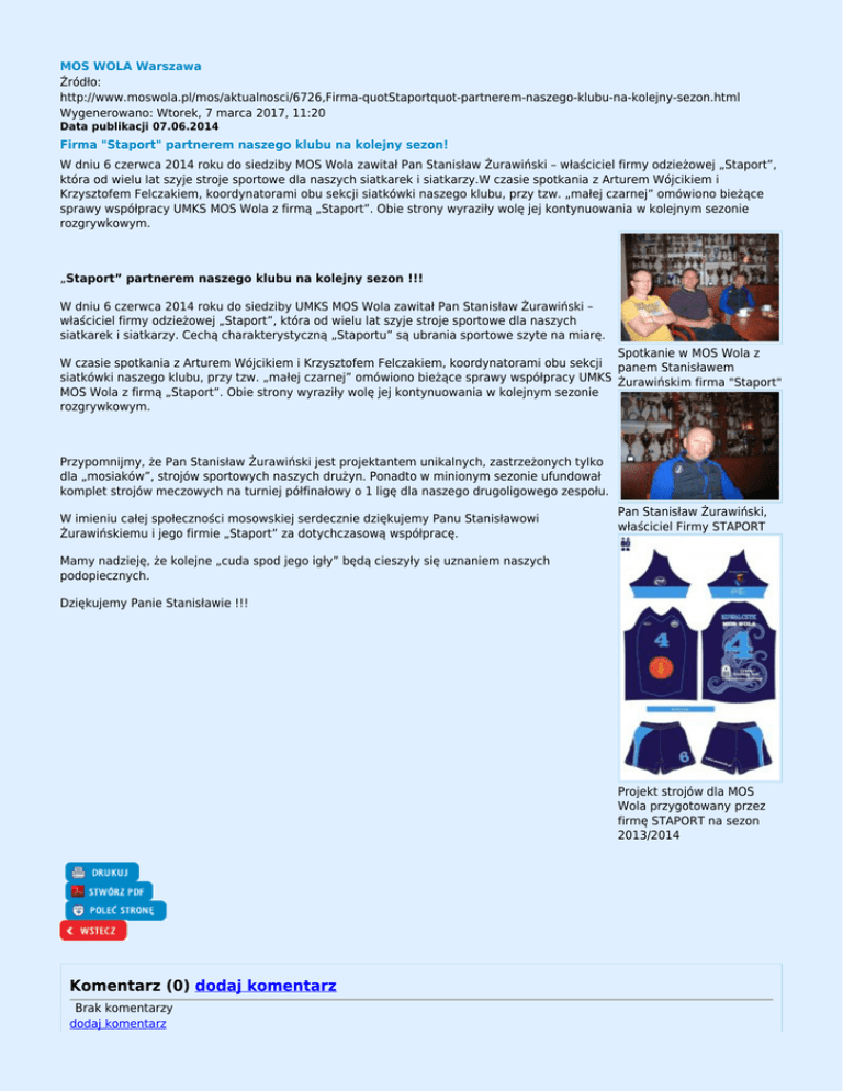 MOS WOLA Warszawa Źródło: http://www.moswola.pl/mos/aktualnosci/6726,Firma-quotStaportquot-partnerem-naszego-klubu-na-kolejny-sezon.html Wygenerowano: Wtorek, 7 marca 2017, 11:20 Data publikacji 07.06.2014 Firma "Staport" partnerem naszego klubu na kolejny sezon! W dniu 6 czerwca 2014 roku do siedziby MOS Wola zawitał Pan Stanisław Żurawiński – właściciel firmy odzieżowej „Staport”, która od wielu lat szyje stroje sportowe dla naszych siatkarek i siatkarzy.W czasie spotkania z Arturem Wójcikiem i Krzysztofem Felczakiem, koordynatorami obu sekcji siatkówki naszego klubu, przy tzw. „małej czarnej” omówiono bieżące sprawy współpracy UMKS MOS Wola z firmą „Staport”. Obie strony wyraziły wolę jej kontynuowania w kolejnym sezonie rozgrywkowym. „Staport” partnerem naszego klubu na kolejny sezon !!! W dniu 6 czerwca 2014 roku do siedziby UMKS MOS Wola zawitał Pan Stanisław Żurawiński – właściciel firmy odzieżowej „Staport”, która od wielu lat szyje stroje sportowe dla naszych siatkarek i siatkarzy. Cechą charakterystyczną „Staportu” są ubrania sportowe szyte na miarę. Spotkanie w MOS Wola z W czasie spotkania z Arturem Wójcikiem i Krzysztofem Felczakiem, koordynatorami obu sekcji panem Stanisławem siatkówki naszego klubu, przy tzw. „małej czarnej” omówiono bieżące sprawy współpracy UMKS Żurawińskim firma "Staport" MOS Wola z firmą „Staport”. Obie strony wyraziły wolę jej kontynuowania w kolejnym sezonie rozgrywkowym. Przypomnijmy, że Pan Stanisław Żurawiński jest projektantem unikalnych, zastrzeżonych tylko dla „mosiaków”, strojów sportowych naszych drużyn. Ponadto w minionym sezonie ufundował komplet strojów meczowych na turniej półfinałowy o 1 ligę dla naszego drugoligowego zespołu. W imieniu całej społeczności mosowskiej serdecznie dziękujemy Panu Stanisławowi Żurawińskiemu i jego firmie „Staport” za dotychczasową współpracę. Pan Stanisław Żurawiński, właściciel Firmy STAPORT Mamy nadzieję, że kolejne „cuda spod jego igły” będą cieszyły się uznaniem naszych podopiecznych. Dziękujemy Panie Stanisławie !!! Projekt strojów dla MOS Wola przygotowany przez firmę STAPORT na sezon 2013/2014 Komentarz (0) dodaj komentarz Brak komentarzy dodaj komentarz