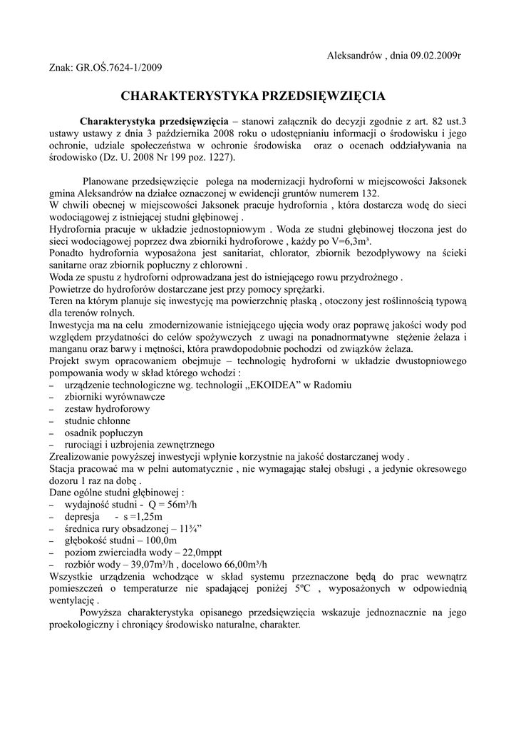 Aleksandrów , dnia 09.02.2009r Znak: GR.OŚ.7624-1/2009 CHARAKTERYSTYKA PRZEDSIĘWZIĘCIA Charakterystyka przedsięwzięcia – stanowi załącznik do decyzji zgodnie z art. 82 ust.3 ustawy ustawy z dnia 3 października 2008 roku o udostępnianiu informacji o środowisku i jego ochronie, udziale społeczeństwa w ochronie środowiska oraz o ocenach oddziaływania na środowisko (Dz. U. 2008 Nr 199 poz. 1227). Planowane przedsięwzięcie polega na modernizacji hydroforni w miejscowości Jaksonek gmina Aleksandrów na działce oznaczonej w ewidencji gruntów numerem 132. W chwili obecnej w miejscowości Jaksonek pracuje hydrofornia , która dostarcza wodę do sieci wodociągowej z istniejącej studni głębinowej . Hydrofornia pracuje w układzie jednostopniowym . Woda ze studni głębinowej tłoczona jest do sieci wodociągowej poprzez dwa zbiorniki hydroforowe , kaŜdy po V=6,3m³. Ponadto hydrofornia wyposaŜona jest sanitariat, chlorator, zbiornik bezodpływowy na ścieki sanitarne oraz zbiornik popłuczny z chlorowni . Woda ze spustu z hydroforni odprowadzana jest do istniejącego rowu przydroŜnego . Powietrze do hydroforów dostarczane jest przy pomocy spręŜarki. Teren na którym planuje się inwestycję ma powierzchnię płaską , otoczony jest roślinnością typową dla terenów rolnych. Inwestycja ma na celu zmodernizowanie istniejącego ujęcia wody oraz poprawę jakości wody pod względem przydatności do celów spoŜywczych z uwagi na ponadnormatywne stęŜenie Ŝelaza i manganu oraz barwy i mętności, która prawdopodobnie pochodzi od związków Ŝelaza. Projekt swym opracowaniem obejmuje – technologię hydroforni w układzie dwustopniowego pompowania wody w skład którego wchodzi : – urządzenie technologiczne wg. technologii „EKOIDEA” w Radomiu – zbiorniki wyrównawcze – zestaw hydroforowy – studnie chłonne – osadnik popłuczyn – rurociągi i uzbrojenia zewnętrznego Zrealizowanie powyŜszej inwestycji wpłynie korzystnie na jakość dostarczanej wody . Stacja pracować ma w pełni automatycznie , nie wymagając stałej obsługi , a jedynie okresowego dozoru 1 raz na dobę . Dane ogólne studni głębinowej : – wydajność studni - Q = 56m³/h – depresja - s =1,25m – średnica rury obsadzonej – 11¾” – głębokość studni – 100,0m – poziom zwierciadła wody – 22,0mppt – rozbiór wody – 39,07m³/h , docelowo 66,00m³/h Wszystkie urządzenia wchodzące w skład systemu przeznaczone będą do prac wewnątrz pomieszczeń o temperaturze nie spadającej poniŜej 5ºC , wyposaŜonych w odpowiednią wentylację . PowyŜsza charakterystyka opisanego przedsięwzięcia wskazuje jednoznacznie na jego proekologiczny i chroniący środowisko naturalne, charakter.