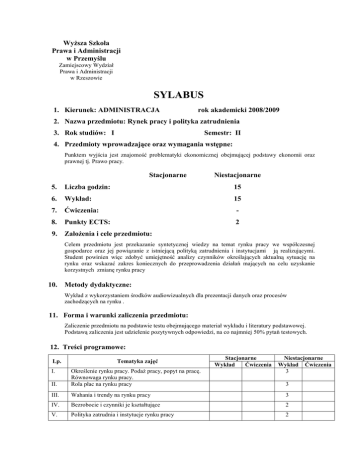 WyŜsza Szkoła Prawa i Administracji w Przemyślu Zamiejscowy Wydział Prawa i Administracji w Rzeszowie SYLABUS 1. Kierunek: ADMINISTRACJA rok akademicki 2008/2009 2. Nazwa przedmiotu: Rynek pracy i polityka zatrudnienia 3. Rok studiów: I Semestr: II 4. Przedmioty wprowadzające oraz wymagania wstępne: Punktem wyjścia jest znajomość problematyki ekonomicznej obejmującej podstawy ekonomii oraz prawnej tj. Prawo pracy. Stacjonarne Niestacjonarne 5. Liczba godzin: 15 6. Wykład: 15 7. Ćwiczenia: - 8. Punkty ECTS: 2 9. ZałoŜenia i cele przedmiotu: Celem przedmiotu jest przekazanie syntetycznej wiedzy na temat rynku pracy we współczesnej gospodarce oraz jej powiązanie z istniejącą polityką zatrudnienia i instytucjami ją realizującymi. Student powinien więc zdobyć umiejętność analizy czynników określających aktualną sytuację na rynku oraz wskazać zakres koniecznych do przeprowadzenia działań mających na celu uzyskanie korzystnych zmianę rynku pracy 10. Metody dydaktyczne: Wykład z wykorzystaniem środków audiowizualnych dla prezentacji danych oraz procesów zachodzących na rynku . 11. Forma i warunki zaliczenia przedmiotu: Zaliczenie przedmiotu na podstawie testu obejmującego materiał wykładu i literatury podstawowej. Podstawą zaliczenia jest udzielenie pozytywnych odpowiedzi, na co najmniej 50% pytań testowych. 12. Treści programowe: Lp. I. Tematyka zajęć Stacjonarne Wykład Ćwiczenia Niestacjonarne Wykład Ćwiczenia 3 II. Określenie rynku pracy. PodaŜ pracy, popyt na pracę. Równowaga rynku pracy. Rola płac na rynku pracy III. Wahania i trendy na rynku pracy 3 IV. Bezrobocie i czynniki je kształtujące 2 V. Polityka zatrudnia i instytucje rynku pracy 2 3 VI. Aktywna i pasywna polityka rynku pracy 2 13. Literatura podstawowa Kwiatkowski E. Bezrobocie, podstawy teoretyczne, Wyd. Nauk. PWN, Warszawa 2002. Stecewicz J. (red.) Polityka gospodarcza – teoria i realia, Warszawa 2008. 14. Literatura dodatkowa Kryńska E. (red.) Wybrane aspekty rozwoju gospodarki i rynku pracy, Łódź 2007. Włudyka T. (red.) Polityka gospodarcza - podręcznik dla studentów kierunków nieekonomicznych, Warszawa 2007. 15. Nazwisko osoby prowadzącej zajęcia na studiach niestacjonarnych - wykład: dr Waldemar Kalita