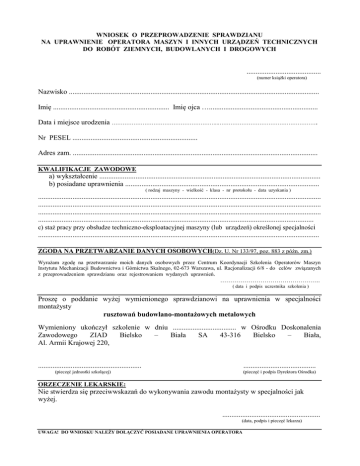 WNIOSEK O PRZEPROWADZENIE SPRAWDZIANU NA UPRAWNIENIE OPERATORA MASZYN I INNYCH URZĄDZEŃ TECHNICZNYCH DO ROBÓT ZIEMNYCH, BUDOWLANYCH I DROGOWYCH ......................................... (numer książki operatora) Nazwisko .......................................................................................................................................... Imię ................................................................ Imię ojca …............................................................ Data i miejsce urodzenia …………………………………………………..………………………………………………. Nr PESEL ..................................................................... Adres zam. ....................................................................................................................................... KWALIFIKACJE ZAWODOWE a) wykształcenie .......................................................................................................................... b) posiadane uprawnienia ........................................................................................................... ( rodzaj maszyny - wielkość - klasa - nr protokołu - data uzyskania ) ............................................................................................................................................................ ............................................................................................................................................................ ............................................................................................................................................................ ........................................................................................................................................................ c) staż pracy przy obsłudze techniczno-eksploatacyjnej maszyny (lub urządzeń) określonej specjalności ........................................................................................................................................................... ZGODA NA PRZETWARZANIE DANYCH OSOBOWYCH(Dz. U. Nr 133/97, poz. 883 z późn. zm.) Wyrażam zgodę na przetwarzanie moich danych osobowych przez Centrum Koordynacji Szkolenia Operatorów Maszyn Instytutu Mechanizacji Budownictwa i Górnictwa Skalnego, 02-673 Warszawa, ul. Racjonalizacji 6/8 - do celów związanych z przeprowadzeniem sprawdzianu oraz rejestrowaniem wydanych uprawnień . ………………………………………….. ( data i podpis uczestnika szkolenia ) Proszę o poddanie wyżej wymienionego sprawdzianowi na uprawnienia w specjalności montażysty rusztowań budowlano-montażowych metalowych Wymieniony ukończył szkolenie w dniu ................................... w Ośrodku Doskonalenia Zawodowego ZIAD Bielsko – Biała SA 43-316 Bielsko – Biała, Al. Armii Krajowej 220, ......................................................... ........................................ (pieczęć jednostki szkolącej) (pieczęć i podpis Dyrektora Ośrodka) ORZECZENIE LEKARSKIE: Nie stwierdza się przeciwwskazań do wykonywania zawodu montażysty w specjalności jak wyżej. ...................................................... (data, podpis i pieczęć lekarza) UWAGA! DO WNIOSKU NALEŻY DOŁĄCZYĆ POSIADANE UPRAWNIENIA OPERATORA -2- ARKUSZ OCEN wystawiony przez Komisję Egzaminacyjną Specjalność lub typ maszyny Nominalny parametr - rusztowania budowlano-montażowe metalowe bez klasy Ocena ze sprawdzianu praktycznego: .................................................................. Ocena ze sprawdzianu teoretycznego : 1. Budowa maszyny określonej specjalności ................................................................. 2. Obsługa i eksploatacja maszyn ................................................................. 3. Napędy : - spalinowe ................................................................. - hydrauliczne ................................................................. - elektryczne ................................................................. 4. Technologia robót i organizacja pracy ................................................................. 5. Umiejętności odczytywania i posługiwania się dokumentacją ................................................................. 6. Bezpieczeństwo i higiena pracy ................................................................. K L A S A I I - dodatkowo : 7. Zasady kierowania zespołem roboczym (wybrane zagadnienia) ................................................................. KLASA I - dodatkowo : 8. Organizacja budowy (wybrane zagadnienia) ................................................................ 9. Prawo budowlane (wybrane zagadnienia) ............................................................... ....................................................... (ocena ogólna) (Skala ocen : celujący, bardzo dobry, dobry, dostateczny, dopuszczający, niedostateczny) Decyzją Komisji Egzaminacyjnej Nr ....... , w dniu ............................ (nie) przyznano uprawnienie montażysty rusztowań budowlano-montażowych metalowych oraz nadano numer ........................................... Podpisy Członków Komisji ……………………………... ……………………………... ……………………………... ……………………………... (podpis Przewodniczącego Komisji)