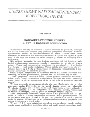 DYSKUTUJEMY NAD ZAGADNIENIAMI KODYFIKACYJNYMI Jan K o sik RÓWNOUPRAWNIENIE KOBIETY A ART. 16 KODEKSU RODZINNEGO Stanowisko kobiety w rodzinie i społeczeństwie to problem, którego nie da się rozwiązać jedynie przy pomocy przepisów prawnych. Równo uprawnienie kobiet w ustawodawstwie to mało. Trzeba nam robić wszystko w kierunku ich równouprawnienia w życiu, nie tylko w pra wie. A do tego nie wystarczą same paragrafy, nawet te najlepiej sfor mułowane. Nie sądźmy jednakże, że nasz kodeks rodzinny dał już kobiecie naj lepiej zredagowane, postępowe zasady i wszystko, co jej się od prawa należy. Praca nad ulepszeniem kodeksowych rozwiązań —- i w treści i w formie — jest nadal pożądana. Toteż należy przyłączyć się do wy siłków, które są i będą podejmowane w kierunku uzupełnienia i na prawy zawartego w kodeksie prawa. Obok innych pożądanych w kodeksie zmian na lepsze, reformie na leżałoby, w moim przekonaniu, poddać art. 16. Stanowi się w nim: „Żona przybiera nazwisko męża. Może jednak zachować nazwisko, które nosiła przed zawarciem małżeństwa, dodając dla niego nazwisko męża, jeżeli w akcie małżeństwa złoży w teij mierze stosowne oświad czenie”. W tym przepisie równouprawnienia nie ma. Zachowuje się w nim przewagę męża. Przywodzi on na myśl branie zony na własność. W zdaniu drugim art. 16 kod. rodź. jest wprawdzie pewne ustępstwo na rzecz kobiety. Ale to ustępstwo nie narusza zasady, wyrażonej w zdaniu pierwszym, lecz ją tylko w pewnym stopniu łagodzi. Żona przybierała nazwisko męża także i na podstawie art. 17 pr. małż. z 1945 r. Zasadę wspólnego nazwiska męża przewidywano też w projekcie kod. cyw. z 1948 r., w art. 182. Jednakże w 1949 r. porzu cono tę zasadę. Uczyniono to w polsko-czechosłowackim projekcie ko deksu rodzinnego z tegoż roku. W art. 17 § 1 tego ostatniego projektu wprowadzono zasadę zacho wania przez małżonków nazwisk, które oni noisili przed zawarciem m ak — 1018 — DYSKUTUJEM Y NAD ZA G A D N IE N IA M I K O D Y F IK A C Y JN Y M I żeństwa. Ale przewidziano też dla nich możliwość złożenia odpowied niego oświadczenia urzędnikowi stanu cywilnego i noszenia wspólnie nazwiska męża, albo nozwisika żony. Jak widać, projekt z 1949 r. (opra cowany po wymianie poglądów z prawnikami czechosłowackimi) zmie rzał zdecydowanie do całkowitego równouprawnienia małżonków w kwe stii nazwiska. Dlaczego, spytać mażna, w art. 16 kod. rodź. zachował się jeszcze pater famihas? Wysunięte w 1950 r. zastrzeżenia przeciwko projektowanemu w 1949 r. całkowitemu równouprawnieniu dają częściową odpowiedź na postawio ne wyżej pytanie. J. Wasilkowski stwierdził mi. in.: „Wydalje się, że rozstrzygnięcie przewidziane w przytoczonych przepisach projektu (w art. 17 § 1 i 2 proj. z 1949, J. K.) nie może nasuwać wątpliwości co do zasady. Jednakże wprowadzenie tych przepisów w życie wywoła łoby w Polsce isiiotne trudności w dziedzinie stosunków administracyj nych. Z tego względu w obecnym okresie rozwojowym projektowana re forma byłaby zapewne przedwczesna”.1 W obronie art. 16 kod. rodź. powołano następnie okoliczność, że sta tuowana w tym przepisie zasada wspólnego nazwiska małżonków daje, w połączeniu z dyspozycją art. 36 § 1 kod. rodź., zasadę wspólnego na zwiska rodziny. To zaś przyczynia się do ściślejszego zespolenia rodziny.2 W tym argumencie może być pewna doza prawdy, ale nie cała praw da. Co najwyżej mógłby on przemawiać przeciwko rozłączności w kwe stii nazwiska, przeciwko zasadzie zachowania pirzez małżonków ich nazwisk sprzed zawarcia małżeństwa. Ale, jak łatwo zauważyć, nie pod waża on w niczym przynajmniej 'jednego postępowego postulatu de lege ferenda, postulatu, aby nie tylko nazwisko męża, lecz również nazwiska zony mogło być stosownie do ich wyboru, wspólnym nazwiskiem mał żeństwa i rodziny. Realizacja choćby tego jednego postulatu w drodze odpowiedzialnej^ reformy art. 16 kod. rodź. przyniosłaby duże osiągnięcie. Nie narusza łaby ona wcale zasady wspólnego nazwiska rodziny i nie osłabiłaby jej zespolenia, a dałaby wreszcie to, czego nasz kodeks niestety kobie cie nie dał: równouprawnienie w kwestii nazwiska. Można mieć nadzieję, że obetnie w 1960 r. zalecana tu reforma nie wywołałaby już w Polsce „istotnych trudności w dziedzinie stosun ków administracyjnych”, z którymi siię liczono w 1950 r. Można tez mieć pewność, że taka reformja nie byłaby przedwczesna. Nie trzeba chyba, w celu wzmocnienia krytyki airt. 16 kod. rodź., sięgać do różnych prawodawstw zagranicznych i wdawać się w po równawczą analizę zagadnienia. Jest jednak przynajmniej jeden prze pis prawa socjalistycznego zasługujący tu na specjalne zaznaczenie. Mamy na myśli art. 7 kodeksu prawa małżeńskiego rodzinnego i opie kuńczego RSFRR, który stanowi: „Przy rejestracji małżeństwa małżon kowie mogą złożyć oświadczenie, że chcą nosić wspólne nazwisko męża 1 W a s i l k o w s k i " S tosunki p raw n e m iędzy m ałżonkam i w p raw ie stycznym . ,P iP ” n r 4 z 195C r s 12i “ i^odeks rodzinny. K om entarz. W arszaw a 1959, s. 95. — 1019 — so c ja li- DYSKUTUJEM Y NAD ZA G A D N IE N IA M I K O D Y F IK A C YJN Y M I lub nazwisko żony, albo zachować swe nazwislka sprzed zawarcia mał żeństwa”. Powołany przepis radziecki wprowadza więc swobodę w kwe stii nazwiska małżonków i daje im do wyboru: 1) zasadę wspólnego nazwiska; 2) zasadę zachowania nazwisk, które oni nosili przed zawar ciem zwiążku małżeńskiego. Zasada pierwsza ma dwa warianty. Mał żonkowie moigą mianowicie wybrać jako nazwisko wspólne: 1) nazwisko męża; allbo też 2) nazwisko żony. Kiedy mowa o art. 7 kodeksu radzieckiego, warto też przypomnieć, że w literaturze radzieckiej przywiązuje się dużą wagę do równoupraw nienia małżonków w zakr