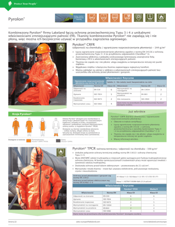 Protect Your People TM Pyrolon® TYP 1a 1 & 1aET-B TYP TYP 1 TYP 1a & 1aET-B TYP TYP 1a & 11aET-B TYP 1 Szwy szyte i podklejone taśmą TYP 4-B TYP 1a & 1aET-B TYPPB 4-B TYP (4) 4-B TYP TYP55-B TYPTYP PB (4) 5 TYP 4-B TYP PB TYP 5-B 6(4) TYP TYP PB TYP 6-B 65(4) EN ISO 14116 TYP 5 TYP 5-B TYP 6-B TYP 5-B 6 INDEX 1/0/0 Kombinezony Pyrolon® firmy Lakeland łączą ochronę przeciwchemiczną Typu 3 i 4 z unikalnymi właściwościami zmniejszającymi palność (FR). Tkaniny kombinezonów Pyrolon® nie zapalają się i nie płoną, więc można ich bezpiecznie używać w przypadku zagrożenia ogniowego. Pyrolon® CRFR EN ISO 14116 INDEX 1/0/0 (odporność na chemikalia / ograniczone rozprzestrzenianie płomienia) - 144 g/m2 • • • • • Łączy ograniczone rozprzestrzenianie płomienia zgodne z normą EN 14116 z ochroną przeciwchemiczną Typu 3 i 4 (w przybliżeniu odpowiednik ChemMax® 1). Zastrzeżona włóknina z jedwabiu wiskozowego laminowana zewnętrznie folią barierową z PCV o właściwościach zmniejszających palność. Tkanina nie zapala się i nie płonie: ulega zwęgleniu w temperaturze niższej niż punkt zapłonu. Wyjątkowo miękka i elastyczna tkanina zapewniająca najwyższy komfort. Można zakładać na odzież z włókien o właściwościach zmniejszających palność bez uszczerbku dla ochrony przed płomieniem i gorącem. Ograniczone rozprzestrzenianie płomienia wg normy EN 14116 Właściwości fizyczne Indeks 1: Nie należy nosić bezpośrednio na ciele Właściwość Norma EN Odporność na ścieranie EN 530 Klasa CE 6 Właściwość Norma EN Klasa CE Wytrzymałość na rozciąganie EN 13934 3 Zginanie ISO 7854 5 Wytrzymałość na przebicie Rozdzieranie trapezowe EN 863 2 ISO 9073 2 Siła rozrywania ISO 2960 2 4 Dane testu na przenikanie dla kombinezonów Pyrolon® dostępne osobno. Wytrzymałość szwu ISO 5082 Już wkrótce Kroje Pyrolon® Pyrolon® CBFR (bariera chemiczna / ograniczone rozprzestrzenianie płomienia) Odzież Pyrolon® dostępna jest standardowo w wersji kroju Lakeland Super-B z trzyczęściowym kapturem, wstawką w kroku, wszywanymi rękawami i podwójnym zamkiem błyskawicznym/ osłoną zamka. (z wyjątkiem Pyrolon® TPCR) • Obecnie w trakcie certyfikacji. • Dostępne są również standardowe akcesoria - osłony na buty, długie osłony na buty, fartuchy itp. Dostępne kroje na zamówienie (z zastrzeżeniem minimalnej ilości zamówienia). Dostępne w kolorze: Pomarańczowy (Pyrolon® CRFR i TPCR) Szary (Pyrolon® CRFR) Łączy ograniczone rozprzestrzenianie płomienia zgodne z normą EN 14116 z ochroną przeciwchemiczną o wysokiej barierowości Typu 3 i 4 (w przybliżeniu odpowiednik ChemMax® 2–3) • Tkanina nie zapala się i nie płonie: ulega zwęgleniu w temperaturze niższej niż punkt zapłonu. • Więcej informacji wkrótce. Pyrolon® TPCR (ochrona termiczna / odporność na chemikalia - 330 g/m 2 • Unikalne połączenie ochrony termicznej według normy EN 11612 i ochrony chemicznej Typu 3 i 4. EN ISO 14116 INDEX 1/0/0 • Może ZASTĄPIĆ odzież trudnopalną w miejscach gdzie wymagana jest funkcja trudnopalnościoraz ochrona chemiczna. W bardzo zanieczyszczonych środowiskach pracy może ograniczyć trwałość i żywotność odzieży trudnopalnej. • Doskonała ochrona przed łukiem elektrycznym - przetestowana do 21 cal/cm2. • Wytrzymała i trwała tkanina - może być używana wielokrotnie, jeśli pozostaje nieskażona, czysta i nieuszkodzona. Ochrona przed płomieniem i gorącem wg normy EN 11612 A1: klasa 1 i 2 / A2: klasa 1 i 2 / B1 / C1/ D1/ E1/ F1 Ochrona przed łukiem elektrycznym wg normy EN 61482-1-2 klasa 1 / ASTM F1959M-06A: 21,9 cal/cm2 Właściwości fizyczne Właściwość Pyrolon® TPCR Marka H Klasa CE Klasa CE Norma EN Odporność na ścieranie EN 530 6 6 Zginanie ISO 7854 5 1 ISO 9073 2 5 EN 13934 3 5 EN 863 2 2 ISO 5082 4 5 Rozdzieranie trapezowe Wytrzymałość na rozciąganie Wytrzymałość na przebicie Wytrzymałość szwu Dane testu na przenikanie dla kombinezonów Pyrolon® dostępne osobno. Strona 22 [email protected] www.lakeland.com/europe EN ISO 141 TYP TYP 6INDEX 1/0/ Protect Your People TM Dlaczego warto używać odzieży Pyrolon® ? Kiedy należy używać kombinezonów chemicznych Pyrolon® FR? Dlaczego standardowe kombinezony chemiczne osłabiają ochronę termiczną? Norma EN 14116 i ochrona przed płomieniem i gorącem Wiele zastosowań wymaga ochrony termicznej oraz ochrony chemicznej. Jak zapewnić jedno i drugie? Obecnie użytkownicy często noszą odzież ochrony termicznej (TPG) w celu ochrony przed płomieniem, a na WIERZCH zakładają standardowy kombinezon chemiczny w celu ochrony przed chemikaliami. Standardowe tkaniny kombinezonów chemicznych oparte są na polipropylenie / polietylenie i w kontakcie z płomieniami zapalą się i stopią. Dlaczego? Są termoplastyczne, więc będą się topić i skapywać, będą przylegać do tkaniny TPG pod spodem, przenosić energię cieplną na skórę pod nią i inne powierzchnie, w potencjalnie rozprzestrzeniając ten sposób ogień. Stwarza to ZAGROŻENIE! Norma EN - EN 14116 EN ISO 14116 INDEX 1/0/0 Ochrona przed gorącem i płomieniem Ograniczone rozprzestrzenianie płomienia Norma ta mierzy tendencję tkaniny do zapalania się i rozprzestrzeniania ognia za pomocą metody badania płomieniem przy pionowym ustawieniu próbki zgodnie z normą EN 15025, w której przykłada się płomień do środka lub dolnej krawędzi próbki tkaniny. Zgodnie z wymaganiami indeksu W przypadku niekontrolowanego wybuchu zwiększy to drastycznie energię cieplną mającą kontakt ze skórą, a tym samym zwiększy ryzyko znacznych oparzeń ciała. Nawet w przypadku kontaktu z niewielkim płomieniem tkanina standardowego kombinezonu chemicznego może zapalić się i spowodować oparzenia. Noszenie standardowego kombinezonu chemicznego na odzieży trudnopalnej może drastycznie pogorszyć ochronę termiczną. 1 płomień nie powinien rozprzestrzeni