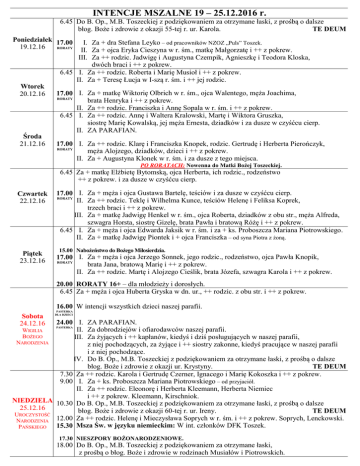 INTENCJE MSZALNE 19 – 25.12.2016 r. 6.45 Do B. Op., M.B. Toszeckiej z podziękowaniem za otrzymane łaski, z prośbą o dalsze błog. Boże i zdrowie z okazji 55-tej r. ur. Karola. TE DEUM Poniedziałek 17.00 19.12.16 RORATY I. Za + dra Stefana Leyko – od pracowników NZOZ „Puls” Toszek. II. Za + ojca Eryka Cieszyna w r. śm., matkę Małgorzatę i ++ z pokrew. III. Za ++ rodzic. Jadwigę i Augustyna Czempik, Agnieszkę i Teodora Kloska, dwóch braci i ++ z pokrew. 6.45 I. Za ++ rodzic. Roberta i Marię Musioł i ++ z pokrew. II. Za + Teresę Łucja w I-szą r. śm. i ++ jej rodzic. Wtorek 20.12.16 Środa 21.12.16 17.00 I. Za + matkę Wiktorię Olbrich w r. śm., ojca Walentego, męża Joachima, RORATY brata Henryka i ++ z pokrew. II. Za ++ rodzic. Franciszka i Annę Sopala w r. śm. i ++ z pokrew. 6.45 I. Za ++ rodzic. Annę i Waltera Kralowski, Martę i Wiktora Gruszka, siostrę Marię Kowalską, jej męża Ernesta, dziadków i za dusze w czyśćcu cierp. II. ZA PARAFIAN. 17.00 I. Za ++ rodzic. Klarę i Franciszka Knopek, rodzic. Gertrudę i Herberta Pierończyk, RORATY męża Alojzego, dziadków, dzieci i ++ z pokrew. II. Za + Augustyna Klonek w r. śm. i za dusze z tego miejsca. PO RORATACH: Nowenna do Matki Bożej Toszeckiej. 6.45 Za + matkę Elżbietę Bytomską, ojca Herberta, ich rodzic., rodzeństwo ++ z pokrew. i za dusze w czyśćcu cierp. Czwartek 22.12.16 Piątek 23.12.16 17.00 I. Za + męża i ojca Gustawa Bartelę, teściów i za dusze w czyśćcu cierp. RORATY II. Za ++ rodzic. Teklę i Wilhelma Kunce, teściów Helenę i Feliksa Koprek, trzech braci i ++ z pokrew. III. Za + matkę Jadwigę Henkel w r. śm., ojca Roberta, dziadków z obu str., męża Alfreda, szwagra Horsta, siostrę Gizelę, brata Pawła i bratową Różę i ++ z pokrew. 6.45 I. Za + męża i ojca Edwarda Jaksik w r. śm. i za + ks. Proboszcza Mariana Piotrowskiego. II. Za + matkę Jadwigę Piontek i + ojca Franciszka – od syna Piotra z żoną. 15.00 Nabożeństwo do Bożego Miłosierdzia. 17.00 I. Za + męża i ojca Jerzego Sonnek, jego rodzic., rodzeństwo, ojca Pawła Knopik, RORATY brata Jana, bratową Marię i ++ z pokrew. II. Za ++ rodzic. Martę i Alojzego Cieślik, brata Józefa, szwagra Karola i ++ z pokrew. 20.00 RORATY 16+ – dla młodzieży i dorosłych. 6.45 Za + męża i ojca Huberta Gryska w dn. ur., ++ rodzic. z obu str. i ++ z pokrew. 16.00 W intencji wszystkich dzieci naszej parafii. Sobota 24.12.16 PASTERKA DLA DZIECI 24.00 I. ZA PARAFIAN. II. Za dobrodziejów i ofiarodawców naszej parafii. WIGILIA BOŻEGO III. Za żyjących i ++ kapłanów, kiedyś i dziś posługujących w naszej parafii, NARODZENIA z niej pochodzących, za żyjące i ++ siostry zakonne, kiedyś pracujące w naszej parafii i z niej pochodzące. IV. Do B. Op., M.B. Toszeckiej z podziękowaniem za otrzymane łaski, z prośbą o dalsze błog. Boże i zdrowie z okazji ur. Krystyny. TE DEUM 7.30 Za ++ rodzic. Karola i Gertrudę Czerner, Ignacego i Marię Kokoszka i ++ z pokrew. 9.00 I. Za + ks. Proboszcza Mariana Piotrowskiego – od przyjaciół. II. Za ++ rodzic. Eleonorę i Herberta Kleemann, Herberta Niemiec i ++ z pokrew. Kleemann, Kirschniok. NIEDZIELA 10.30 Do B. Op., M.B. Toszeckiej z podziękowaniem za otrzymane łaski, z prośbą o dalsze 25.12.16 błog. Boże i zdrowie z okazji 60-tej r. ur. Ireny. TE DEUM UROCZYSTOŚĆ 12.00 Za ++ rodzic. Helenę i Mieczysława Soprych w r. śm. i ++ z pokrew. Soprych, Lenckowski. NARODZENIA 15.30 Msza Św. w języku niemieckim: W int. członków DFK Toszek. PAŃSKIEGO PASTERKA 17.30 NIESZPORY BOŻONARODZENIOWE. 18.00 Do B. Op., M.B. Toszeckiej z podziękowaniem za otrzymane łaski, z prośbą o błog. Boże i zdrowie w rodzinach Musiałów i Piotrowskich.