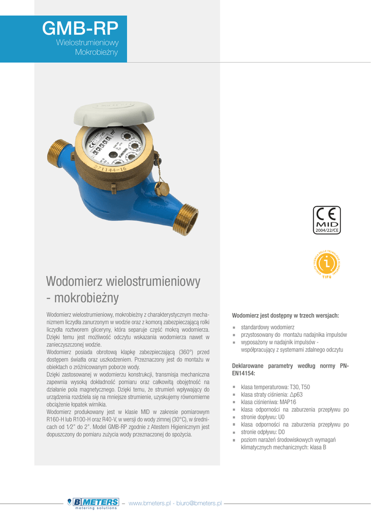 GMB-RP Wielostrumieniowy Mokrobieżny Wodomierz wielostrumieniowy - mokrobieżny Wodomierz wielostrumieniowy, mokrobieżny z charakterystycznym mechanizmem liczydła zanurzonym w wodzie oraz z komorą zabezpieczającą rolki liczydła roztworem gliceryny, która separuje część mokrą wodomierza. Dzięki temu jest możliwość odczytu wskazania wodomierza nawet w zanieczyszczonej wodzie. Wodomierz posiada obrotową klapkę zabezpieczającą (360°) przed dostępem światła oraz uszkodzeniem. Przeznaczony jest do montażu w obiektach o zróżnicowanym poborze wody. Dzięki zastosowanej w wodomierzu konstrukcji, transmisja mechaniczna zapewnia wysoką dokładność pomiaru oraz całkowitą obojętność na działanie pola magnetycznego. Dzięki temu, że strumień wpływający do urządzenia rozdziela się na mniejsze strumienie, uzyskujemy równomierne obciążenie łopatek wirnikia. Wodomierz produkowany jest w klasie MID w zakresie pomiarowym R160-H lub R100-H oraz R40-V, w wersji do wody zimnej (30°C), w średnicach od 1⁄2’’ do 2’’. Model GMB-RP zgodnie z Atestem Higienicznym jest dopuszczony do pomiaru zużycia wody przeznaczonej do spożycia. metering solutions www.bmeters.pl - [email protected] Wodomierz jest dostępny w trzech wersjach: standardowy wodomierz przystosowany do montażu nadajnika impulsów wyposażony w nadajnik impulsów współpracujący z systemami zdalnego odczytu Deklarowane parametry według normy PNEN14154: klasa temperaturowa: T30, T50 klasa straty ciśnienia: Δp63 klasa ciśnieniwa: MAP16 klasa odporności na zaburzenia przepływu po stronie dopływu: U0 klasa odporności na zaburzenia przepływu po stronie odpływu: D0 poziom narażeń środowiskowych wymagań klimatycznych mechanicznych: klasa B Mokrobieżny, wielostrumieniowy MID R160-H, R40-V lub R100-H, R40-V, Zimna woda 30°C Charakterystyka techniczna DN Średnica mm in (1/2") (3/4") (1") (1 1/4") (1 1/2") (2") 15 20 25 32 40 50 Zawias Pokrywka Hinge Lid Lead Przepływ maksymalny Q4 m³/h 3,125 5 7,875 12,5 20 31,25 Ciągły strumień objętości Q3 m³/h 2,5 4 6,3 10 16 25 Holding ring Pośredni strumień objętości Q 2 l/h 40 64 100,8 160 256 400 O.R. Gasket Minimalny strumień objętości Q 1 l/h 25 40 63 100 160 250 Brass sealing ring Ruchoma uszczelka R =160 H R = 100 H Sliding gasket Glass Uszczelka Oring Totalising mechanism Uszczelka Oring O.R. Gasket Mechanism case Pośredni strumień objętości Q 2 l/h 25 40 63 100 160 250 Minimalny strumień objętości Q 1 l/h 15,63 25 30,38 63,5 100 156,25 Czułość Wirnik Vane wheel Pivot Rozdzielnik strumieni Uszczelka Oring Vane wheel cas e 6 l/h 6 10 10 20 O.R. Gasket Adjusting bolt 20 Filtr Strainer Uszczelka - Gasket 0,05 l Odczyt minimalny 0,05 0,05 0,05 0,05 0,05 Adjusting screw Filtr Brass body Strainer Odczyt maksymalny m³ Maksymalne dopuszczalne ciśnienie bar 99.999 99.999 16 16 99.999 99.999 999.999 999.999 16 16 16 16 Ø15 Ø20 Ø25 Ø40 Ø32 Ø50 Pozycje montażowe Wymiary i waga 0 Średnica mm in 15 (1/2") 20 (3/4") 25 (1") 32 (1"1/4) 40 (1"1/2) 50 (2") L mm 145-165-190 190 260 260 300 300 I mm 225-245-270 290 360 380 440 460 H mm 109 111 117 117 153 172 B mm 100 100 104 104 126 160 D (Gwint) mm 3/4" 1" 1"1/4 1"1/2 2" 2"1/2 kg 1,35 1,45 2,04 2,11 4,58 7,25 Waga 3 5 7 10 12 15 3 Gwint - EN ISO 228-1:2000 DN50 dostępny w wersji kołnierzowej zgodnie z ISO 7005-2 / EN 1092-2 PN16 www.bmeters.pl - [email protected] metering solutions 20 25 30