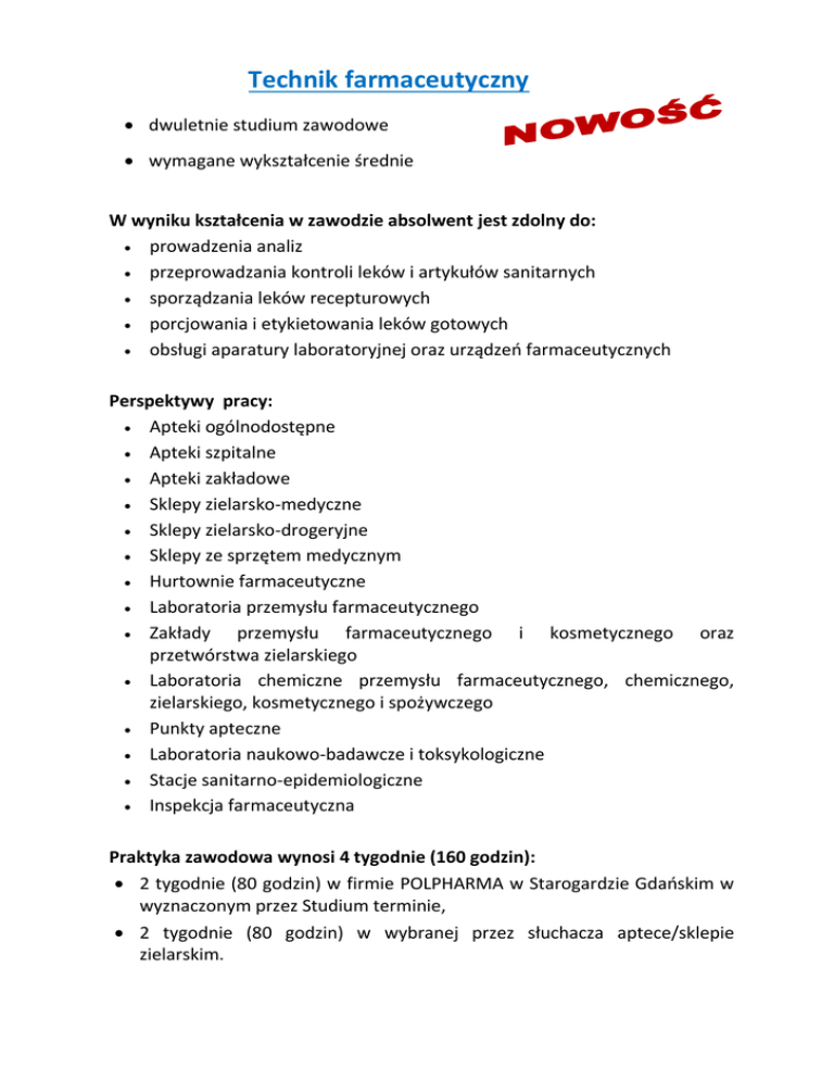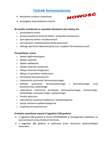 Technik farmaceutyczny dwuletnie studium zawodowe wymagane wykształcenie średnie W wyniku kształcenia w zawodzie absolwent jest zdolny do: prowadzenia analiz przeprowadzania kontroli leków i artykułów sanitarnych sporządzania leków recepturowych porcjowania i etykietowania leków gotowych obsługi aparatury laboratoryjnej oraz urządzeń farmaceutycznych Perspektywy pracy: Apteki ogólnodostępne Apteki szpitalne Apteki zakładowe Sklepy zielarsko-medyczne Sklepy zielarsko-drogeryjne Sklepy ze sprzętem medycznym Hurtownie farmaceutyczne Laboratoria przemysłu farmaceutycznego Zakłady przemysłu farmaceutycznego i kosmetycznego oraz przetwórstwa zielarskiego Laboratoria chemiczne przemysłu farmaceutycznego, chemicznego, zielarskiego, kosmetycznego i spożywczego Punkty apteczne Laboratoria naukowo-badawcze i toksykologiczne Stacje sanitarno-epidemiologiczne Inspekcja farmaceutyczna Praktyka zawodowa wynosi 4 tygodnie (160 godzin): 2 tygodnie (80 godzin) w firmie POLPHARMA w Starogardzie Gdańskim w wyznaczonym przez Studium terminie, 2 tygodnie (80 godzin) w wybranej przez słuchacza aptece/sklepie zielarskim.