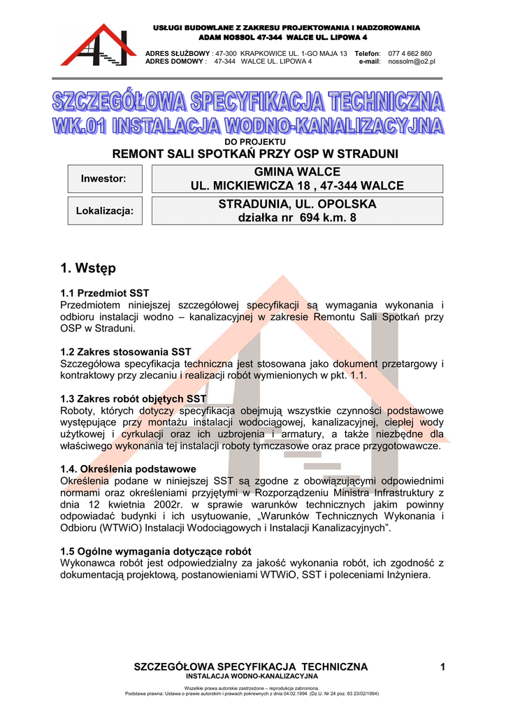 USŁUGI BUDOWLANE Z ZAKRESU PROJEKTOWANIA I NADZOROWANIA ADAM NOSSOL 4747-344 WALCE UL. LIPOWA 4 ADRES SŁUśBOWY : 47-300 KRAPKOWICE UL. 1-GO MAJA 13 ADRES DOMOWY : 47-344 WALCE UL. LIPOWA 4 Telefon: e-mail: 077 4 662 860 [email protected] DO PROJEKTU REMONT SALI SPOTKAŃ PRZY OSP W STRADUNI GMINA WALCE Inwestor: UL. MICKIEWICZA 18 , 47-344 WALCE Lokalizacja: STRADUNIA, UL. OPOLSKA działka nr 694 k.m. 8 1. Wstęp 1.1 Przedmiot SST Przedmiotem niniejszej szczegółowej specyfikacji są wymagania wykonania i odbioru instalacji wodno – kanalizacyjnej w zakresie Remontu Sali Spotkań przy OSP w Straduni. 1.2 Zakres stosowania SST Szczegółowa specyfikacja techniczna jest stosowana jako dokument przetargowy i kontraktowy przy zlecaniu i realizacji robót wymienionych w pkt. 1.1. 1.3 Zakres robót objętych SST Roboty, których dotyczy specyfikacja obejmują wszystkie czynności podstawowe występujące przy montaŜu instalacji wodociągowej, kanalizacyjnej, ciepłej wody uŜytkowej i cyrkulacji oraz ich uzbrojenia i armatury, a takŜe niezbędne dla właściwego wykonania tej instalacji roboty tymczasowe oraz prace przygotowawcze. 1.4. Określenia podstawowe Określenia podane w niniejszej SST są zgodne z obowiązującymi odpowiednimi normami oraz określeniami przyjętymi w Rozporządzeniu Ministra Infrastruktury z dnia 12 kwietnia 2002r. w sprawie warunków technicznych jakim powinny odpowiadać budynki i ich usytuowanie, „Warunków Technicznych Wykonania i Odbioru (WTWiO) Instalacji Wodociągowych i Instalacji Kanalizacyjnych”. 1.5 Ogólne wymagania dotyczące robót Wykonawca robót jest odpowiedzialny za jakość wykonania robót, ich zgodność z dokumentacją projektową, postanowieniami WTWiO, SST i poleceniami InŜyniera. SZCZEGÓŁOWA SPECYFIKACJA TECHNICZNA INSTALACJA WODNO-KANALIZACYJNA Wszelkie prawa autorskie zastrzeŜone – reprodukcja zabroniona. Podstawa prawna: Ustawa o prawie autorskim i prawach pokrewnych z dnia 04.02.1994 (Dz.U. Nr 24 poz. 83 23/02/1994) 1 USŁUGI BUDOWLANE Z ZAKRESU PROJEKTOWANIA I NADZOROWANIA ADAM NOSSOL 4747-344 WALCE UL. LIPOWA 4 ADRES SŁUśBOWY : 47-300 KRAPKOWICE UL. 1-GO MAJA 13 ADRES DOMOWY : 47-344 WALCE UL. LIPOWA 4 Telefon: e-mail: 077 4 662 860 [email protected] 2. Materiały 2.1. Wymagania ogólne Ogólne wymagania dotyczące materiałów, ich pozyskiwania i składowania podano w ST „Wymagania ogólne”p.2. Wszystkie materiały stosowane do wykonania robót muszą być zgodne z wymaganiami niniejszej specyfikacji i dokumentacji projektowej. Do wykonania robót mogą być stosowane wyroby budowlane spełniające warunki określone w: - Ustawie z dnia 7 lipca 1994r. Prawo Budowlane (Dz. U. z 2003r. Nr 207, poz. 2016 z późniejszymi zmianami), - Ustawie z dnia 16 kwietnia 2004r. o wyrobach budowlanych (Dz. U z 2004r. Nr 92, poz. 881), - Ustawie z dnia 30 sierpnia 2002r. o systemie oceny zgodności (Dz. u. z 2002r. Nr 166, poz. 1360 z późniejszymi zmianami). 2.2. Rodzaje materiałów 2.2.1. Rury miedziane dla instalacji wodociągowej Rury i kształtki miedziane powinny spełniać wymagania PN-EN 1057:1999. 2.2.2. Rury i kształtki z tworzyw sztucznych dla instalacji kanalizacyjnej Rury i kształtki z tworzyw sztucznych muszą spełniać wymagania określone w odpowiednich normach: - z niezmiękczonego polichlorku winylu (PCV-U) – PN-EN 1329-1:2001, PN-EN 1329-2:2002(U) - z polipropylenu (PP) PN-EN 1451-1:2001, PN-ENV 1451-2:2002(U), - z polietylenu (PE) PN-EN 1519-1:2002, PN-ENV 1519-2:2002(U). 2.2.3. Armatura instalacji wodociągowej Armatura przepływowa instalacji wodociągowej musi spełniać warunki określone w następujących normach: PN/M-75110÷11, PN/M-75113÷19, PN/M-75123÷26, PN/M-75144, PN/M-75147, PN/M-75150, PN/M-75167, PN/M-75172, PN/M-75180, PN/M-75206. 2.2.4. Instalacja p-poŜ Hydranty przeciwpoŜarowe Dn 25 o wydajności nie mniejszej niŜ 1dm3 /s przy nominalnym ciśnieniu nie mniejszym niŜ 0,2MPa, w skrzynkach hydrantowych wyposaŜonych w węŜe przeciwpoŜarowe długości 2x15m, prądownicę oraz zawór. 2.2.5. Izolacje Rurociągi muszą być zaizolowane. Izolacje z wełny mineralnej Thermoflex gr. 30mm i 48mm. SZCZEGÓŁOWA SPECYFIKACJA TECHNICZNA INSTALACJA WODNO-KANALIZACYJNA Wszelkie prawa autorskie zastrzeŜone – reprodukcja zabroniona. Podstawa prawna: Ustawa o prawie autorskim i prawach pokrewnych z dnia 04.02.1994 (Dz.U. Nr 24 poz. 83 23/02/1994) 2 USŁUGI BUDOWLANE Z ZAKRESU PROJEKTOWANIA I NADZOROWANIA ADAM NOSSOL 4747-344 WALCE UL. LIPOWA 4 ADRES SŁUśBOWY : 47-300 KRAPKOWICE UL. 1-GO MAJA 13 ADRES DOMOWY : 47-344 WALCE UL. LIPOWA 4 Telefon: e-mail: 077 4 662 860 [email protected] 2.2.6. Przybory i urządzenia dla instalacji kanalizacji sanitarnej Przybory i urządzenia oraz uzbrojenie przewodów kanalizacyjnych muszą spełniać wymagania odpowiednich norm. Wykaz takich norm podany został w punkcie 10.1 niniejszej specyfikacji. 3. Sprzęt Ogólne wymagania dotyczące sprzętu podano w ST „Wymagania ogólne”p.3. Wykonawca jest zobowiązany do uŜywania jedynie takiego sprzętu, który nie spowoduje niekorzystnego wpływu na jakość wykonywanych robót. Sprzęt uŜywany do robót powinien być zgodny z ofertą Wykonawcy. Liczba i wydajność sprzętu będzie gwarantować przeprowadzenie robót, zgodnie z zasadami określonymi w dokumentacji projektowej. Sprzęt będący własnością Wykonawcy lub wynajęty do wykonania robót ma być utrzymywany w dobrym stanie i gotowości do pracy. Będzie spełniał normy ochrony środowiska i przepisy dotyczące jego uŜytkowania. Wykonawca dostarczy Inspektorowi nadzoru kopie dokumentów potwierdzających dopuszczenie sprzętu do uŜytkowania, tam gdzie jest to wymagane przepisami. 4. Transport Ogólne wymagania dotyczące transportu podano w ST „Wymagania ogólne”p.4. 4.1. Wymagania dotyczące przewozu rur z tworzyw sztucznych Ze względu na specyficzne cechy rur naleŜy spełnić następujące wymagania: - rury naleŜy przewozić wyłącz