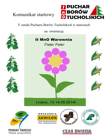 Komunikat startowy V runda Pucharu Borów Tucholskich w marszach na orientację 1. Zespół organizacyjny: Głównodowodzący: Krzysztof Nowak, tel. 506-582-471 Inne ważne szychy, tudzież grube ryby: Karol Wroński, Dorota Grześkowiak Budowniczowie tras: Krzysztof Nowak (trasy TZ, TJ, TM, TR i TTT), Karol Wroński (trasa TT), Dorota Grześkowiak (trasa TD) Sędzia zawodów: Krzysztof Nowak 2. Sponsorzy i partnerzy: Powiat Świecki, Gmina Lniano, drukarnia „Akwilon”, „Czas Świecia” 3. Termin: 13-14.09.2014r. 4. Baza zawodów, dojazd: Bazą zawodów dla tras dziennych (TZ, TJ, TM, TD, TR) będzie Szkoła Podstawowa im. Jana Pawła II w Lnianie, przy ul. Szkolnej 13, natomiast dla tras nocnych (TT i TTT) Gimnazjum Publiczne nr 1 w Lnianie, też przy ul. Szkolnej 13. Mapka lokalizacyjna bazy głównej zawodów. Dojazd i odjazd: W sobotę PKS ze stacji Laskowice Pomorskie do Lniana o godz. 8:30, przyjazd 8:59. Z Błądzimia (dla osób jadących od strony Czerska i Starogardu) o 10:00 PKS do Lniana, przyjazd o 10:11. Dla uczestników tras nocnych – ze stacji Terespol Pomorski PKS do Lniana o godz. 14:36 (przyjazd 15:08) i 17:12 (przyjazd 17:47) lub PKS z Laskowic o 18:07 (przyjazd do Lniana 18:50). Powrót – PKS o 18:14 w sobotę do Terespola Pomorskiego, w niedzielę brak połączeń PKS, ale jeżdżą dość regularnie pociągi ze stacji Błądzim i Wierzchucin, tyle, że trzeba tam dojść z Lniana ok. 8 km na piechotę lub łapać stopa. Na przykład z Błądzimia jedzie pociąg do Bydgoszczy o 9:06. 5. Forma i kategorie: TZ (zaawansowani), „Flałer Pałer” – jeden etap dzienny, zespoły 1-2 osobowe, dystans ok. 13 km, zaliczana do klasyfikacji PBT, mapy solidnie przekształcone, teren zalesiony i, gdyby nie susza, również bagienny, przebieżność dobra, płasko, różnice wzniesień maksymalnie do 10 metrów. TD (drużynowa), „Buszujący w zbożu” – jeden etap dzienny, zespoły 2-10 osobowe, dystans ok. 10 km, mapy pełne, teren zalesiony, byłby podmokły, ale susza popsuła szyki, przebieżność dobra, płasko, różnice wzniesień maksymalnie do 10 metrów. Trasa dla osób, które traktują marsze na orientację głównie jako formę przyjemnej przechadzki po lesie. TJ (juniorska), „Świeckie Błotko szlag trafił” – jeden etap dzienny, zespoły 1 – 2 osobowe, młodzież szkół średnich, dystans ok. 9 km, zaliczana do klasyfikacji PBT, mapy nieznacznie modyfikowane, treść map niepełna, teren płaski, przebieżność dobra, lasy, pola, wyschnięte bagna. TM (młodzieżowa), „Przyjaciele wyschłego bagna” – jeden etap dzienny, zespoły 1 – 2 osobowe, młodzież szkół gimnazjalnych, dystans ok. 7 km, zaliczana do klasyfikacji PBT, mapy nieznacznie modyfikowane, treść map niepełna, teren płaski, przebieżność dobra, lasy, pola, wyschnięte bagna. TR (rowerowa), „Kask Majki w kukurydzy” – jeden etap dzienny w formie scorelaufu (punkty wagowe), zespoły 1 – 2 osobowe, dystans ok. 100 km, zaliczana do klasyfikacji PBT, mapa pełna, limit czasu 8 godzin. TT (trasa turystyczna), „Strzeż się pociągu” – trasa nocna, zespoły 1 – 3 osobowe, dystans ok. 19 km, dla osób z niewielkim doświadczeniem w marszach na orientację, aczkolwiek chwilami podstępna. Wszystkie punkty zlokalizowane w miejscach łatwych do odnalezienia ale otoczone sporą ilością punktów stowarzyszonych, wybrane punkty zlokalizowane w miejscach atrakcyjnych turystycznie. Chodzenie na azymut lub odczytywanie rzeźby terenu konieczne głównie w okolicach punktów, poza tym duża ilość dróg i ścieżek ułatwiających przemieszczanie się. Limit czasowy dostosowany do uczestników chodzących powoli. Na trasie kilka prostych zadań orientacyjnych i krajoznawczych zapoznających uczestników z historią zwiedzanych okolic. Mapa pełna, nieaktualizowana i niemodyfikowana w skali 1:25000, możliwe fragmenty w skali 1:10000. Kolejność potwierdzeń punktów obowiązkowa. W połowie trasy stopczas z niespodzianką. T(T)T (trasa torturystyczna), „Orzeł, czy ryszka?” – trasa nocna, zespoły 1 – 3 osobowe, dystans ok. 29 km, dla osób z doświadczeniem w nocnych marszach, żądnych wyzwań i dysponujących dobrą kondycją fizyczną, ale możliwa do przejścia (nawet w całości). Punkty kontrolne rozmieszczone z dala od skrzyżowań dróg, głównie na rzeźbie terenu. Ponadto bagna, rzeki, jeziora, skarpy... Mapa z częściowo usuniętą drożnią, na tyle jednak, że nie widać dużej różnicy. Poza tym pełna w skali 1:25000. 6. Punktacja i sędziowanie W kategorii TZ, TJ, TM i TD punktacja będzie prowadzona zgodnie z „Zasadami punktacji i współzawodnictwa w turystycznych imprezach na orientację PTTK”, z następującym zastrzeżeniem: Na trasie TZ będą wycinki podstawowe i dodatkowe. Dodatkowych będzie niedużo (co to znaczy „wycinek dodatkowy” zostanie wytłumaczone w bazie przed startem). Błąd w pomyleniu lokalizacji wycinka dodatkowego będzie karany jak PM (30 punktów karnych) + BPK (90), a nie standardowo, czyli OP (10) + ewentualnie PS (25). Szczegółowy komunikat na temat punktacji i sędziowania na trasach nocnych (TT i TTT) ukaże się na kilka dni przed zawodami. Będzie też wywieszony w bazie zawodów. Oczywiście będzie on także oparty o „Zasady punktacji i współzawodnictwa w turystycznych imprezach na orientację PTTK”, więc żadnych wielkich rewolucji tu nie należy się spodziewać. W sporach regulaminowych ostateczny głos należy do organizatora. W przypadku równej liczby punktów karnych drużyn na podium, o przyznaniu pucharów/medali decyduje czas przyjścia na metę. Trasa TR będzie rozgrywana na podobnych zasadach jak Harpagan, czy Borowiacki. 7. Ramowy program zawodów: Sobota, 13 września 2014 r. 8:52 – otwarcie sekretariatu zawodów w SP 40, przyjmowanie uczestników w bazie 9:30 – start trasy TZ 10:00 – start trasy TR 10:30 – start tras TJ, TM i TD 14:00 – 16:00 – zako