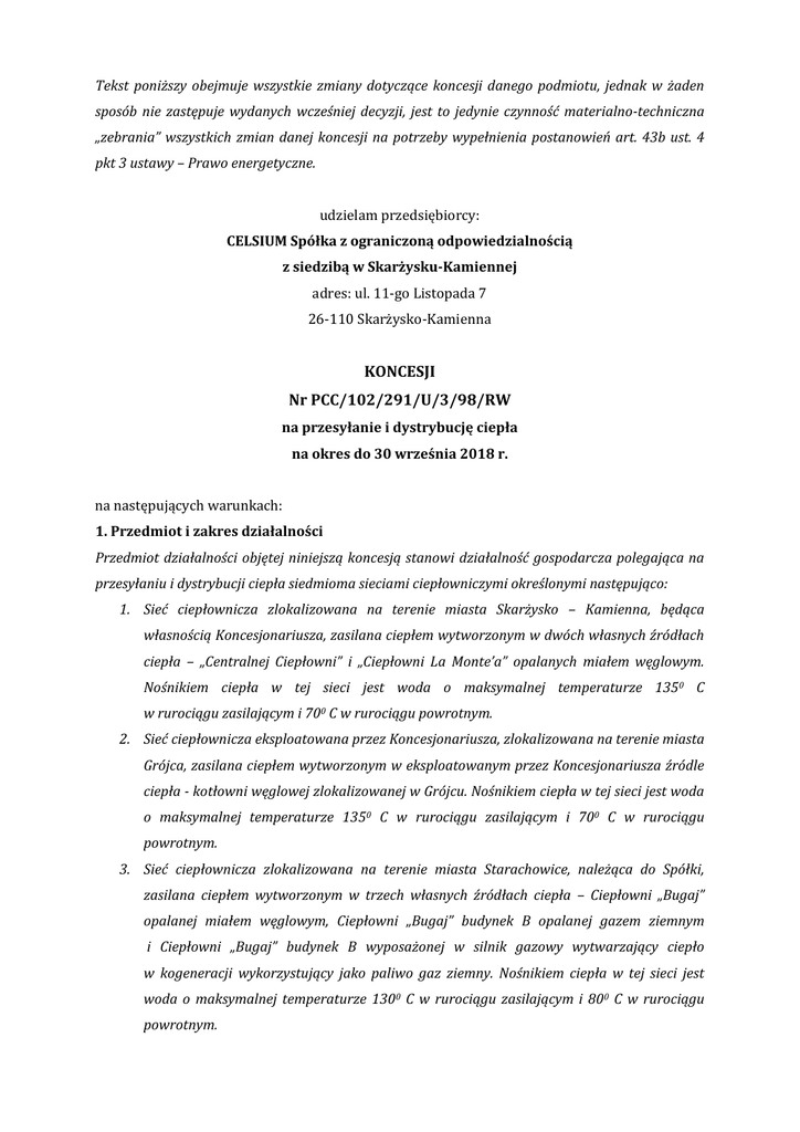Tekst poniższy obejmuje wszystkie zmiany dotyczące koncesji danego podmiotu, jednak w żaden sposób nie zastępuje wydanych wcześniej decyzji, jest to jedynie czynność materialno-techniczna „zebrania” wszystkich zmian danej koncesji na potrzeby wypełnienia postanowień art. 43b ust. 4 pkt 3 ustawy – Prawo energetyczne. udzielam przedsiębiorcy: CELSIUM Spółka z ograniczoną odpowiedzialnością z siedzibą w Skarżysku-Kamiennej adres: ul. 11-go Listopada 7 26-110 Skarżysko-Kamienna KONCESJI Nr PCC/102/291/U/3/98/RW na przesyłanie i dystrybucję ciepła na okres do 30 września 2018 r. na następujących warunkach: 1. Przedmiot i zakres działalności Przedmiot działalności objętej niniejszą koncesją stanowi działalność gospodarcza polegająca na przesyłaniu i dystrybucji ciepła siedmioma sieciami ciepłowniczymi określonymi następująco: 1. Sieć ciepłownicza zlokalizowana na terenie miasta Skarżysko – Kamienna, będąca własnością Koncesjonariusza, zasilana ciepłem wytworzonym w dwóch własnych źródłach ciepła – „Centralnej Ciepłowni” i „Ciepłowni La Monte’a” opalanych miałem węglowym. Nośnikiem ciepła w tej sieci jest woda o maksymalnej temperaturze 1350 C w rurociągu zasilającym i 700 C w rurociągu powrotnym. 2. Sieć ciepłownicza eksploatowana przez Koncesjonariusza, zlokalizowana na terenie miasta Grójca, zasilana ciepłem wytworzonym w eksploatowanym przez Koncesjonariusza źródle ciepła - kotłowni węglowej zlokalizowanej w Grójcu. Nośnikiem ciepła w tej sieci jest woda o maksymalnej temperaturze 1350 C w rurociągu zasilającym i 700 C w rurociągu powrotnym. 3. Sieć ciepłownicza zlokalizowana na terenie miasta Starachowice, należąca do Spółki, zasilana ciepłem wytworzonym w trzech własnych źródłach ciepła – Ciepłowni „Bugaj” opalanej miałem węglowym, Ciepłowni „Bugaj” budynek B opalanej gazem ziemnym i Ciepłowni „Bugaj” budynek B wyposażonej w silnik gazowy wytwarzający ciepło w kogeneracji wykorzystujący jako paliwo gaz ziemny. Nośnikiem ciepła w tej sieci jest woda o maksymalnej temperaturze 1300 C w rurociągu zasilającym i 800 C w rurociągu powrotnym. 4. Sieć ciepłownicza technologiczna zlokalizowana na terenie miasta Starachowice, należąca do Spółki, zasilana ciepłem wytworzonym w trzech własnych źródłach ciepła – Ciepłowni „Bugaj” opalanej miałem węglowym, Ciepłowni „Bugaj” budynek B opalanej gazem ziemnym i Ciepłowni „Bugaj” budynek B wyposażonej w silnik gazowy wytwarzający ciepło w kogeneracji wykorzystujący jako paliwo gaz ziemny. Nośnikiem ciepła w tej sieci jest woda o maksymalnej temperaturze 1100 C w rurociągu zasilającym i 800 C w rurociągu powrotnym. 5. Sieć ciepłownicza zlokalizowana na terenie miasta Drzewicy, będąca własnością Koncesjonariusza, zasilana ciepłem wytworzonym we własnym źródle ciepła – kotłowni zlokalizowanej w Drzewicy opalanej węglem kamiennym. Nośnikiem ciepła w tej sieci jest woda o maksymalnej temperaturze 1350 C w rurociągu zasilającym i 750 C w rurociągu powrotnym. 6. Sieć ciepłownicza zlokalizowana na terenie miasta Sokółki, będąca własnością Koncesjonariusza, zasilana ciepłem wytworzonym we własnym źródle ciepła – kotłowni zlokalizowanej w Sokółce opalanej węglem kamiennym i suchymi odpadami produkcyjnymi z drewna. Nośnikiem ciepła w tej sieci jest woda o stałej temperaturze 1500 C w rurociągu zasilającym i 800 C w rurociągu powrotnym. 7. Sieć ciepłownicza zlokalizowana na terenie miasta Sokółki, będąca własnością Koncesjonariusza, zasilana ciepłem wytworzonym we własnym źródle ciepła – kotłowni zlokalizowanej w Sokółce opalanej węglem kamiennym i suchymi odpadami z drewna. Nośnikiem ciepła w tej sieci jest woda o maksymalnej temperaturze 1300 C w rurociągu zasilającym i 700 C w rurociągu powrotnym. 2. Warunki wykonywania działalności 2.1. Warunki ogólne 2.1.1. Koncesjonariusz jest obowiązany do wykonywania działalności objętej niniejszą koncesją na zasadach określonych w ustawie – Prawo energetyczne oraz wydanych na jej podstawie przepisach wykonawczych, w szczególności do zapewnienia wysokiej jakości świadczonych usług, niezawodności zaopatrzenia w ciepło przy zachowaniu zasady najniższych możliwych kosztów. 2.1.2. Koncesjonariusz jest obowiązany do przestrzegania obowiązujących przepisów, w tym przepisów o ochronie środowiska a także wydanych na ich podstawie przepisów wykonawczych. 2.1.3. Koncesjonariusz nie może zawierać umów o świadczenie usługi przesyłania a także dystrybucji ciepła z przedsiębiorcami wykonującym działalność gospodarczą w zakresie wytwarzania, przesyłania, dystrybucji lub obrotu ciepłem, jeżeli nie posiadają koncesji, w przypadkach gdy taka koncesja jest wymagana przepisami ustawy – Prawo energetyczne. 2 2.1.4. Koncesjonariusz jest obowiązany do sporządzania dla obszaru swego działania planu rozwoju w zakresie zaspokojenia obecnego i przyszłego zapotrzebowania na ciepło, zgodnie z przepisami ustawy – Prawo energetyczne. 2.1.5. Koncesjonariusz jest obowiązany do wykonywania działalności w sposób nie powodujący zagrożenia dla życia lub zdrowia ludzkiego oraz nie narażający na powstanie szkód materialnych. 2.1.6. Koncesjonariusz nie będzie subsydiować działalności nie objętej niniejszą koncesją z przychodu osiąganego z działalności objętej tą koncesją. 2.2. Szczególne warunki wykonywania działalności objętej koncesją ze względu na właściwą obsługę odbiorców 2.2.1. Koncesjonariusz jest obowiązany do spełnienia technicznych warunków przesyłania oraz dystrybucji ciepła określonych w odrębnych przepisach, w szczególności do utrzymywania obiektów, instalacji, urządzeń i sieci w należytym stanie technicznym, umożliwiających przesyłanie i dystrybucję ciepła w sposób ciągły i niezawodny, przy za