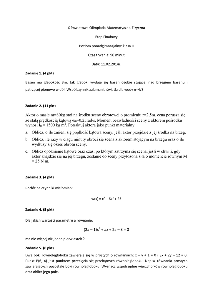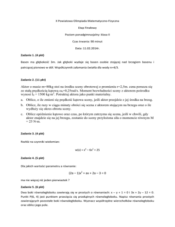 X Powiatowa Olimpiada Matematyczno‐Fizyczna Etap Finałowy Poziom ponadgimnazjalny: klasa II Czas trwania: 90 minut Data: 11.02.2014r. Zadanie 1. (4 pkt) Basen ma głębokość 3m. Jak głęboki wydaje się basen osobie stojącej nad brzegiem basenu i patrzącej pionowo w dół. Współczynnik załamania światła dla wody n=4/3. Zadanie 2. (11 pkt) Aktor o masie m=80kg stoi na środku sceny obrotowej o promieniu r=2,5m. cena porusza się ze stałą prędkością kątową 0=0,25rad/s. Moment bezwładności sceny z aktorem pośrodku wynosi I0 = 1500 kg·m2. Potraktuj aktora jako punkt materialny. a. Oblicz, o ile zmieni się prędkość kątowa sceny, jeśli aktor przejdzie z jej środka na brzeg. b. Oblicz, ile razy w ciągu minuty obróci się scena z aktorem stojącym na brzegu oraz o ile wydłuży się okres obrotu sceny. c. Oblicz opóźnienie kątowe oraz czas, po którym zatrzyma się scena, jeśli w chwili, gdy aktor znajdzie się na jej brzegu, zostanie do sceny przyłożona siła o momencie równym M = 25 N·m. Zadanie 3. (4 pkt) Rozłóż na czynniki wielomian: w(x) = x4 – 6x2 + 25 Zadanie 4. (5 pkt) Dla jakich wartości parametru a równanie: (2a – 1)x2 + ax + 2a – 3 = 0 ma nie więcej niż jeden pierwiastek ? Zadanie 5. (6 pkt) Dwa boki równoległoboku zawierają się w prostych o równaniach: x – y + 1 = 0 i 3x + 2y – 12 = 0. Punkt P(6, 4) jest punktem przecięcia się przekątnych równoległoboku. Napisz równania prostych zawierających pozostałe boki równoległoboku. Wyznacz współrzędne wierzchołków równoległoboku oraz oblicz jego pole.