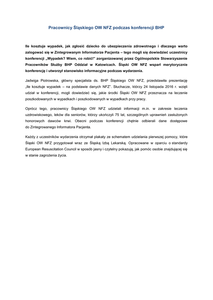 Pracownicy Śląskiego OW NFZ podczas konferencji BHP Ile kosztuje wypadek, jak zgłosić dziecko do ubezpieczenia zdrowotnego i dlaczego warto zalogować się w Zintegrowanym Informatorze Pacjenta – tego mogli się dowiedzieć uczestnicy konferencji „Wypadek? Wiem, co robić!” zorganizowanej przez Ogólnopolskie Stowarzyszenie Pracowników Służby BHP Oddział w Katowicach. Śląski OW NFZ wsparł merytorycznie konferencję i utworzył stanowisko informacyjne podczas wydarzenia. Jadwiga Piotrowska, główny specjalista ds. BHP Śląskiego OW NFZ, przedstawiła prezentację „Ile kosztuje wypadek – na podstawie danych NFZ”. Słuchacze, którzy 24 listopada 2016 r. wzięli udział w konferencji, mogli dowiedzieć się, jakie środki Śląski OW NFZ przeznacza na leczenie poszkodowanych w wypadkach i poszkodowanych w wypadkach przy pracy. Oprócz tego, pracownicy Śląskiego OW NFZ udzielali informacji m.in. w zakresie leczenia uzdrowiskowego, leków dla seniorów, którzy ukończyli 75 lat, szczególnych uprawnień zasłużonych honorowych dawców krwi. Obecni podczas konferencji chętnie odbierali dane dostępowe do Zintegrowanego Informatora Pacjenta. Każdy z uczestników wydarzenia otrzymał plakaty ze schematem udzielania pierwszej pomocy, które Śląski OW NFZ przygotował wraz ze Śląską Izbą Lekarską. Opracowane w oparciu o standardy European Resuscitation Council w sposób jasny i czytelny pokazują, jak pomóc osobie znajdującej się w stanie zagrożenia życia.