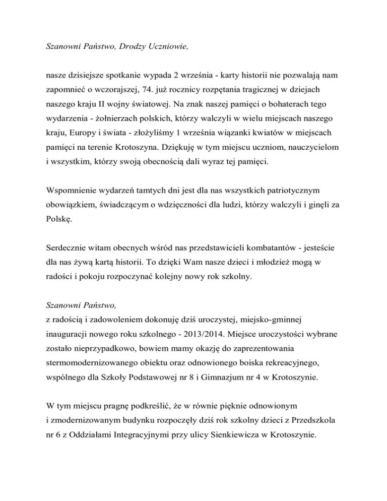 Szanowni Państwo, Drodzy Uczniowie, nasze dzisiejsze spotkanie wypada 2 września - karty historii nie pozwalają nam zapomnieć o wczorajszej, 74. już rocznicy rozpętania tragicznej w dziejach naszego kraju II wojny światowej. Na znak naszej pamięci o bohaterach tego wydarzenia - żołnierzach polskich, którzy walczyli w wielu miejscach naszego kraju, Europy i świata - złożyliśmy 1 września wiązanki kwiatów w miejscach pamięci na terenie Krotoszyna. Dziękuję w tym miejscu uczniom, nauczycielom i wszystkim, którzy swoją obecnością dali wyraz tej pamięci. Wspomnienie wydarzeń tamtych dni jest dla nas wszystkich patriotycznym obowiązkiem, świadczącym o wdzięczności dla ludzi, którzy walczyli i ginęli za Polskę. Serdecznie witam obecnych wśród nas przedstawicieli kombatantów - jesteście dla nas żywą kartą historii. To dzięki Wam nasze dzieci i młodzież mogą w radości i pokoju rozpoczynać kolejny nowy rok szkolny. Szanowni Państwo, z radością i zadowoleniem dokonuję dziś uroczystej, miejsko-gminnej inauguracji nowego roku szkolnego - 2013/2014. Miejsce uroczystości wybrane zostało nieprzypadkowo, bowiem mamy okazję do zaprezentowania stermomodernizowanego obiektu oraz odnowionego boiska rekreacyjnego, wspólnego dla Szkoły Podstawowej nr 8 i Gimnazjum nr 4 w Krotoszynie. W tym miejscu pragnę podkreślić, że w równie pięknie odnowionym i zmodernizowanym budynku rozpoczęły dziś rok szkolny dzieci z Przedszkola nr 6 z Oddziałami Integracyjnymi przy ulicy Sienkiewicza w Krotoszynie. 2 Prowadzone w ostatnim czasie prace inwestycyjne na rzecz poprawy i udoskonalenia warunków pracy we wszystkich jednostkach oświatowych sięgnęły kwoty bliskiej 3 mln złotych, w tym ponad 600 tys. stanowiły środki z budżetu gminy. Bardzo dziękuję projektantom i wykonawcom tych prac. To Państwa rzetelność i odpowiedzialność spowodowały, że dziś możemy poszczycić się tak pięknymi, i unowocześnionymi obiektami szkolnymi. W wielu placówkach przeprowadzone zostały również remonty i dokupiono sprzęt oraz pomoce naukowe. Aby zapewnić uczniom w nowym roku szkolnym solidną ofertę edukacyjną, we wszystkich szkołach podstawowych i gimnazjach organizować będziemy zajęcia dodatkowe, pozwalające na wyrównywanie szans i podnoszenie jakości nauczania. Dzieci w krotoszyńskich przedszkolach prowadzonych przez samorząd gminny będą miały możliwość systematycznego uczęszczania w zajęciach logopedycznych. Bardzo dziękuję w tym miejscu Radnym Rady Miejskiej w Krotoszynie za przychylność i akceptację przy dysponowaniu środków finansowych na określone zadania. Szanowni Państwo, dziś bramy szkół na terenie naszej gminy przekroczyło ponad 3700 uczniów, z czego blisko 1350 to gimnazjaliści. Nie można pominąć tych, którzy przekroczyli dziś próg szkoły po raz pierwszy. Wśród nich są również dzieci sześcioletnie, których rodzice zdecydowali się przyspieszyć im podjęcie obowiązku szkolnego. Niestety, mimo szerokiej akcji Ministerstwa Edukacji 3 Narodowej i działań naszych pedagogów, ta grupa uczniów jest nadal niewielka, sięga ok. 10% wszystkich sześciolatków. Życzę Wam, Drodzy Pierwszoklasiści, sukcesów i radości z wspólnego uczenia się z innymi. Pamiętajcie: "przezwyciężenie strachu to początek mądrości ". Wszystkim dzieciom, które dziś zawitały do przedszkoli i oddziałów przedszkolnych, a jest ich około 1500, życzę przede wszystkim codziennego uśmiechu i atrakcji płynących z czasu spędzonego na zabawie. Pragnę poinformować, że z dniem dzisiejszym rozpoczęło swoją działalność Publiczne Przedszkole „Bajka” przy Rzymskokatolickiej Parafii pw. św. Jana Chrzciciela w Krotoszynie. Jest to piąte już w mieście przedszkole prowadzone przez organ inny niż samorząd gminny. Gratuluję przedsięwzięcia i życzę sukcesów w działalności edukacyjnej i wychowawczej. Szanowni Państwo, organizując pracę w nowym roku szkolnym, udzieliłem na 5 lat nominacji na stanowiska dyrektorów szkół i przedszkoli osobom wyłonionym w postępowaniu konkursowym. Są to: 1.Pani Arleta Jaśkowiak – powołana na stanowisko dyrektora Przedszkola nr 1 w Krotoszynie; 2.Pani Zofia Walkowiak - powołana na stanowisko dyrektora Przedszkola nr 5 w Krotoszynie; 3.Pani Sabina Rybakowska – powołana na stanowisko dyrektora Zespołu Szkół w Benicach; 4.Pani Katarzyna Maciejewska - powołana na stanowisko dyrektora Szkoły Podstawowej nr 8 w Krotoszynie. 4 Jest wśród nas również siostra Aurelia Bartkowiak, która z dniem dzisiejszym objęła stanowisko dyrektor Publicznego Przedszkola „Słoneczko” prowadzonego przez Zgromadzenie Sióstr św. Elżbiety – Prowincję Poznańską. Witamy w Krotoszynie. Życzę wszystkim nowo powołanym dyrektorkom wielu osiągnięć, niech kierowanie placówkami będzie kontynuacją dobrych praktyk i rozwiązań oraz wniesie wiele nowego, co pozwoli podnieść jeszcze wyżej poziom dotychczasowej pracy z dziećmi i uczniami. Szanowni Państwo, po wakacyjnym odpoczynku w nowy rok szkolny wchodzimy z nadziejami, marzeniami i planami. Nauczyciele będą kontynuować działania zmierzające do osiągania przez uczniów jak najlepszych wyników w nauce i jak najbardziej oczekiwanych przez wszystkich postaw w codziennym zachowaniu. Pracownicy Urzędu, odpowiedzialni za realizację zadań oświatowych, systematycznie śledzą oferty projektowe i inne korzystne dla gminy rozwiązania, by systematycznie podnosić jakość warunków organizacyjnych szkół. Wszyscy troszczymy się o to, aby warunki do nauki były jak najlepsze, a uczniowie dobrze przygotowani do dalszego kształcenia oraz znajdowania swojego miejsca w ciekawym, lecz jakże trudnym, współczesnym świecie. Szanowni Państwo, Dostrzegam Wasze zaangażowanie i składam serdeczne podziękowania dyrektorom szkół i przedszkoli, nauczycielom, pracownikom obsługi i administracji oświatowej za 