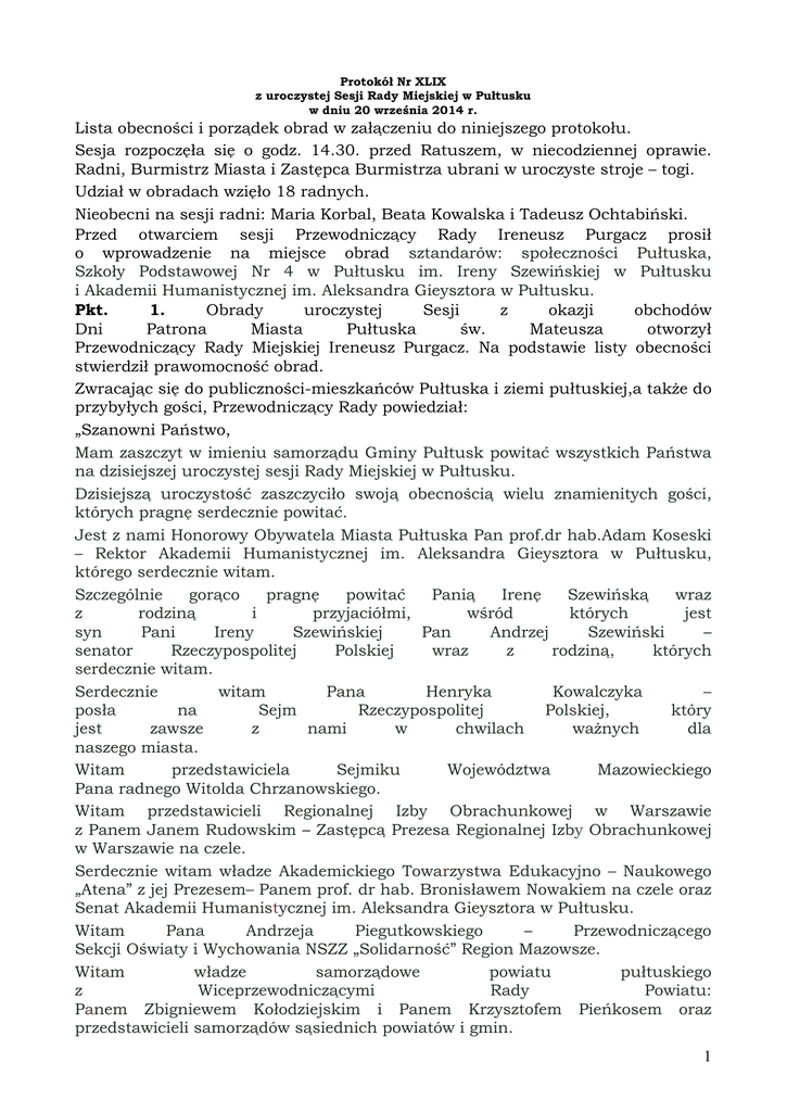Protokół Nr XLIX z uroczystej Sesji Rady Miejskiej w Pułtusku w dniu 20 września 2014 r. Lista obecności i porządek obrad w załączeniu do niniejszego protokołu. Sesja rozpoczęła się o godz. 14.30. przed Ratuszem, w niecodziennej oprawie. Radni, Burmistrz Miasta i Zastępca Burmistrza ubrani w uroczyste stroje – togi. Udział w obradach wzięło 18 radnych. Nieobecni na sesji radni: Maria Korbal, Beata Kowalska i Tadeusz Ochtabiński. Przed otwarciem sesji Przewodniczący Rady Ireneusz Purgacz prosił o wprowadzenie na miejsce obrad sztandarów: społeczności Pułtuska, Szkoły Podstawowej Nr 4 w Pułtusku im. Ireny Szewińskiej w Pułtusku i Akademii Humanistycznej im. Aleksandra Gieysztora w Pułtusku. Pkt. 1. Obrady uroczystej Sesji z okazji obchodów Dni Patrona Miasta Pułtuska św. Mateusza otworzył Przewodniczący Rady Miejskiej Ireneusz Purgacz. Na podstawie listy obecności stwierdził prawomocność obrad. Zwracając się do publiczności-mieszkańców Pułtuska i ziemi pułtuskiej,a także do przybyłych gości, Przewodniczący Rady powiedział: „Szanowni Państwo, Mam zaszczyt w imieniu samorządu Gminy Pułtusk powitać wszystkich Państwa na dzisiejszej uroczystej sesji Rady Miejskiej w Pułtusku. Dzisiejszą uroczystość zaszczyciło swoją obecnością wielu znamienitych gości, których pragnę serdecznie powitać. Jest z nami Honorowy Obywatela Miasta Pułtuska Pan prof.dr hab.Adam Koseski – Rektor Akademii Humanistycznej im. Aleksandra Gieysztora w Pułtusku, którego serdecznie witam. Szczególnie gorąco pragnę powitać Panią Irenę Szewińską wraz z rodziną i przyjaciółmi, wśród których jest syn Pani Ireny Szewińskiej Pan Andrzej Szewiński – senator Rzeczypospolitej Polskiej wraz z rodziną, których serdecznie witam. Serdecznie witam Pana Henryka Kowalczyka – posła na Sejm Rzeczypospolitej Polskiej, który jest zawsze z nami w chwilach ważnych dla naszego miasta. Witam przedstawiciela Sejmiku Województwa Mazowieckiego Pana radnego Witolda Chrzanowskiego. Witam przedstawicieli Regionalnej Izby Obrachunkowej w Warszawie z Panem Janem Rudowskim – Zastępcą Prezesa Regionalnej Izby Obrachunkowej w Warszawie na czele. Serdecznie witam władze Akademickiego Towarzystwa Edukacyjno – Naukowego „Atena” z jej Prezesem– Panem prof. dr hab. Bronisławem Nowakiem na czele oraz Senat Akademii Humanistycznej im. Aleksandra Gieysztora w Pułtusku. Witam Pana Andrzeja Piegutkowskiego – Przewodniczącego Sekcji Oświaty i Wychowania NSZZ „Solidarność” Region Mazowsze. Witam władze samorządowe powiatu pułtuskiego z Wiceprzewodniczącymi Rady Powiatu: Panem Zbigniewem Kołodziejskim i Panem Krzysztofem Pieńkosem oraz przedstawicieli samorządów sąsiednich powiatów i gmin. 1 Witam serdecznie: Panią Barbarę Polańską – Wójta Gminy Gzy, Pana Włodzimierza Kaczmarczyka – Wójta Gminy Zatory, Pana Mariusza Kowalewskiego – Wójta Gminy Winnica i Pana Jana Mroczkowskiego – Wójta Gminy Obryte. Serdecznie witam księży proboszczów pułtuskich parafii: ks. kan. Wiesława Koska – Proboszcza Parafii pw. św. Mateusza w Pułtusku – Dziekana Dekanatu Pułtuskiego, ks. kan. Józefa Gawlika – Proboszcza parafii pw. św. Józefa w Pułtusku, ks. Sławomira Stefańskiego– Proboszcza parafii pw. bł. Jana Pawła II w Pułtusku, ks. Janusza Zdunkiewicza – Proboszcza parafii pw. św. Stanisława Kostki w Pułtusku i wszystkich księży uczestniczących w dzisiejszej uroczystej sesji. Swoją obecnością zaszczycili nas również przedstawiciele organów wymiaru sprawiedliwości oraz służb mundurowych: strażacy Państwowej i Ochotniczej Straży Pożarnej, policjanci, leśnicy, których serdecznie witam. Witam: Pana Zbigniewa Matusika – Komendanta Powiatowego Policji w Pułtusku, Pana Grzegorza Baprawskiego – Zastępcę Komendanta Powiatowego Państwowej Straży Pożarnej w Pułtusku, Pana Romana Jankowskiego – Nadleśniczego Nadleśnictwa Pułtusk. Jest z nami Pan Jerzy Rosa – Dyrektor Domu Polonii w Pułtusku, którego serdecznie witam. W dzisiejszej uroczystości uczestniczą byli burmistrzowie Pułtuska i byli przewodniczący Rady Miejskiej oraz radni Rady Miejskiej w Pułtusku poprzednich kadencji, których serdecznie witam. Są z nami także dyrektorzy szkół, przedszkoli, zakładów pracy, firm i organizacji z gminy i powiatu pułtuskiego, których gorąco witam. Witam przedstawicieli jednostek pomocniczych Gminy – sołtysów Gminy Pułtusk. Witam również bardzo serdecznie przedstawicieli organizacji i osoby odznaczone medalem „Za Zasługi dla Miasta Pułtuska”. Miło jest nam powitać przedstawicieli prasy, radia i telewizji relacjonujących nasze święto. Witam wszystkich uczestników barwnego korowodu dziękując za ogromne zaangażowanie w tworzenie naszej uroczystości. Witam bardzo serdecznie współorganizatorów pułtuskiego święta: Pana Wojciecha Dębskiego – Burmistrza Miasta i jego zastępcę – Pana Zenona Kowalewskiego, radnych Rady Miejskiej oraz członków Akcji Katolickiej przy Parafii św. Mateusza w Pułtusku. Bardzo serdecznie witam mieszkańców naszego miasta i ziemi pułtuskiej, a także wszystkich gości przybyłych do naszego grodu na obchody Dni Patrona Miasta Pułtuska św. Mateusza. Cieszymy się, że jesteście Państwo z nami, że możemy Państwa gościć na XVII Dniach Patrona Pułtuska św. Mateusza”. Pkt. 2. Przedstawienie porządku obrad. Przewodniczący Rady Ireneusz Purgacz odczytał porządek obrad uroczystej sesji. Uwag do porządku obrad nie zgłoszono. 2 Pkt. 3. Oficjalne otwarcie Dni Patrona Pułtuska Św. Mateusza. Przewodniczący Rady Ireneusz Purgacz poprosił Burmistrza Miasta o oficjalne otwarcie Dni Patrona Pułtuska Św. Mateusza. Burmistrz Miasta Wojciech Dębski dokonał otwarcia Dni Patrona Pułtuska Św. Mateusza: „Szanowni Państwo, Drodzy Goście i Mieszkańcy Pułtuska, Już od szesnastu lat druga połowa września kojarzy się m