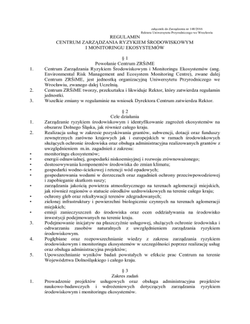 załącznik do Zarządzenia nr 140/2016 Rektora Uniwersytetu Przyrodniczego we Wrocławiu REGULAMIN CENTRUM ZARZĄDZANIA RYZYKIEM ŚRODOWISKOWYM I MONITORINGU EKOSYSTEMÓW 1. 2. 3. 1. 2. • • • • • • • • • 3. 4. 5. 1. §1 Powołanie Centrum ZRŚiME Centrum Zarządzania Ryzykiem Środowiskowym i Monitoringu Ekosystemów (ang. Environmental Risk Management and Ecosystem Monitoring Centre), zwane dalej Centrum ZRŚiME, jest jednostką organizacyjną Uniwersytetu Przyrodniczego we Wrocławiu, zwanego dalej Uczelnią. Centrum ZRŚiME tworzy, przekształca i likwiduje Rektor, który zatwierdza regulamin jednostki. Wszelkie zmiany w regulaminie na wniosek Dyrektora Centrum zatwierdza Rektor. §2 Cele działania Zarządzanie ryzykiem środowiskowym i identyfikowanie zagrożeń ekosystemów na obszarze Dolnego Śląska, jak również całego kraju. Realizacja usług w zakresie pozyskiwania grantów, subwencji, dotacji oraz funduszy zewnętrznych zarówno krajowych jak i europejskich w ramach środowiskowych służących ochronie środowiska oraz obsługa administracyjna realizowanych grantów z uwzględnieniem m.in. zagadnień z zakresu: monitoringu ekosystemów; energii odnawialnej, gospodarki niskoemisyjnej i rozwoju zrównoważonego; dostosowywania komponentów środowiska do zmian klimatu; gospodarki wodno-ściekowej i retencji wód opadowych; gospodarowania wodami w dorzeczach oraz zagadnień ochrony przeciwpowodziowej i zapobieganie skutkom suszy; zarządzania jakością powietrza atmosferycznego na terenach aglomeracji miejskich, jak również regionów o statucie ośrodków uzdrowiskowych na terenie całego kraju; ochrony gleb oraz rekultywacji terenów zdegradowanych; zielonej infrastruktury i powierzchni biologicznie czynnych na terenach aglomeracji miejskich; emisji zanieczyszczeń do środowiska oraz ocen oddziaływania na środowisko inwestycji podejmowanych na terenie kraju. Podejmowanie inicjatyw na płaszczyźnie usługowej, służących ochronie środowiska i odtwarzaniu zasobów naturalnych z uwzględnieniem zarządzania ryzykiem środowiskowym. Pogłębiane oraz rozpowszechnianie wiedzy z zakresu zarządzania ryzykiem środowiskowym i monitoringu ekosystemów w szczególności poprzez realizację usług oraz obsługa administracyjna projektów; Upowszechnianie wyników badań powstałych w efekcie prac Centrum na terenie Województwa Dolnośląskiego i całego kraju. §3 Zakres zadań Prowadzenie projektów usługowych oraz obsługa administracyjna projektów naukowo-badawczych i wdrożeniowych dotyczących zarządzania ryzykiem środowiskowym i monitoringu ekosystemów. Pomoc administracyjna przy nawiązywaniu współpracy z innymi ośrodkami naukowymi oraz podmiotami podejmującymi problematykę środowiskową na zasadach naukowych i badawczych.. Wspieranie rozwoju samorządu terytorialnego poprzez transfer wiedzy i doskonalenie umiejętności pracowników samorządowych oraz liderów lokalnych i regionalnych Inicjowanie i wspieranie działań dydaktycznych realizowanych na Uczelni poprzez: organizowanie kongresów, konferencji, wykładów, warsztatów, prelekcji oraz innego rodzaju przedsięwzięć związanych z zakresem działalności Centrum ZRŚiME. Przygotowanie oraz promowanie publikacji wynikających z działalności Centrum ZRŚiME. Budowa sieci współpracy ze środowiskiem pracowników samorządowych oraz liderów lokalnych i regionalnych. Tworzenie sieci instytucji oraz bazy ekspertów zajmujących się problematyką zarządzania ryzykiem środowiskowym i monitoringiem ekosystemów. 2. 3. 4. 6. 7. 8. 1. 2. 3. 4. 5. 1. 2. 3. 4. 5. 6. 7. §4 Gospodarka finansowa Centrum ZRŚiME funkcjonuje na zasadach samofinansowania w wyniku pozyskanych grantów oraz funduszy zewnętrznych, natomiast w pierwszym 9-ciu miesiącach działalności jest finansowana z budżetu Uczelni. Nadwyżka przychodów nad kosztami jest częścią wyniku finansowego uczelni i jest przeznaczona na fundusz zasadniczy uczelni, natomiast ujemny wynik przychodów nad kosztami pomniejsza środki finansowe Centrum roku następnego. Centrum ZRŚiME prowadzi działalność w oparciu o roczny plan rzeczowo-finansowy podlegający zatwierdzeniu przez Prorektora ds. innowacji i współpracy z gospodarką. Dyrektor Centrum ZRŚiME przedstawia plan rzeczowo-finansowy na rok następny do 31 grudnia. Centrum ZRŚiME pozyskuje środki na swą działalność ze źródeł zewnętrznych. Rozliczanie i dysponowanie pozyskanymi środkami odbywa się zgodnie z odpowiednimi procedurami i regulaminem uczelni §5 Organizacja Centrum Centrum stanowi jednostkę usługowo-administracyjną uczelni bezpośrednio podległą prorektorowi ds. innowacji i współpracy z gospodarką. Centrum ZRŚiME zarządza i reprezentuje Dyrektor Centrum ZRŚiME. Dyrektora Centrum ZRŚiME powołuje i odwołuje Rektor na wniosek Prorektora ds. innowacji i współpracy z gospodarką . W Centrum ZRŚiME zatrudniani są specjaliści na stanowisku starszego specjalisty lub głównego specjalisty, którzy wspierają realizację zadań centrum ZRŚiME . Do realizacji zadań Centrum powołuje się zespoły zadaniowe. Ich strukturę i zakres działania określa Dyrektor. W procedurze powoływania zespołów po uwzględnieniu kryteriów merytorycznych pierwszeństwo kwalifikacji do zespołu mają pracownicy, studenci i doktoranci UP we Wrocławiu, zatrudniani przy realizacji zadań zgodnie z obowiązującymi przepisami. Centrum współpracuje z Biurem pozyskiwania Projektów oraz z Działem Innowacji Wdrożeń i Komercjalizacji w zakresie pozyskiwania i realizacji projektów, usług badawczych i innej działalności w tym komercjalizacyjnej i komercyjnej. Centrum współpracuje z Centrum Kształcenia Ustawicznego w zakresie organizacji szkoleń i konferencji 1. 2. 3. 4. 5. 6. 7. §6 Obowiązki Dyrektora Centrum ZRŚiME Organizowanie i nadzorowanie działalności Centrum ZRŚiME. Planowanie działalności oraz źródeł finansowania oraz wsp