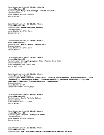 Data / Czas trwania: 04-12 09:30 / 102 min Miejsce Multikino 51 Tytuł / Reżyser: Wyspa Giovanniego / Mizuho Nishikubo Grupa wiekowa: Klasa: Dla klas 4-6 SP i 1-2 Gimn. Sekcja: Konkurs Data / Czas trwania: 04-12 09:30 / 90 min Miejsce Multikino 51 Tytuł / Reżyser: Nasza liga / Jean Beaudry Grupa wiekowa: Klasa: Dla klas 4-6 SP i 1 Gimn. Sekcja: Konkurs Data / Czas trwania: 04-12 09:30 / 95 min Miejsce Multikino 51 Tytuł / Reżyser: Sekrety wojny / Dennis Bots Grupa wiekowa: Klasa: Dla klas 5-6 SP i 1 Gimn. Sekcja: Konkurs Data / Czas trwania: 04-12 09:30 / 70 min Miejsce Multikino 51 Tytuł / Reżyser: Niezwykła przygoda Pima i Poma / Gioia Smid Grupa wiekowa: Od 5 lat Klasa: Dla przedszkoli i klas 0-3 SP Sekcja: Panorama Data / Czas trwania: 04-12 09:30 / 60 min Miejsce Nowe Kino Pałacowe Tytuł / Reżyser: Baśnie i waśnie / Piotr Paweł Lutczyn („Bitwa morska”, „Królewskie łowy”), Zofia Oraczewska („Czarodziejski eliksir”), Alina Maliszewska („Nieudane poselstwo”), Krzysztof Dębowski („Oblężenie”), Leonard Pulchny („Odwiedziny”) Grupa wiekowa: Klasa: Dla klas 1-3 SP Sekcja: Wydarzenia towarzyszące Data / Czas trwania: 04-12 12:00 / 92 min Miejsce Multikino 51 Tytuł / Reżyser: Strefa 7 / Carlo Obispo Grupa wiekowa: Klasa: Dla klas 6 SP i 1-2 Gimn. Sekcja: Konkurs Data / Czas trwania: 04-12 12:00 / 85 min Miejsce Multikino 51 Tytuł / Reżyser: Chłopiec i świat / Alê Abreu Grupa wiekowa: Klasa: Dla klas 4-6 SP i 1-2 Gimn. Sekcja: Konkurs Data / Czas trwania: 04-12 12:00 / 94 min Miejsce Multikino 51 Tytuł / Reżyser: Jack i mechanika serca / Stéphane Berla, Mathias Malzieu Grupa wiekowa: Klasa: Dla klas 6 SP i Gimn. Sekcja: Konkurs Data / Czas trwania: 04-12 12:00 / 7 min Miejsce Nowe Kino Pałacowe Tytuł / Reżyser: Mimi i Liza: Żegnajcie szarości / Katarina Kerekesova Grupa wiekowa: Od 8 lat Klasa: Dla klas 2-4 SP Sekcja: Konkurs Data / Czas trwania: 04-12 12:00 / 26 min Miejsce Nowe Kino Pałacowe Tytuł / Reżyser: Zapach marchewek / Arnaud Demuynck, Remi Durin Grupa wiekowa: Od 8 lat Klasa: Dla klas 2-4 SP Sekcja: Konkurs Data / Czas trwania: 04-12 12:00 / 9 min Miejsce Nowe Kino Pałacowe Tytuł / Reżyser: Rękawiczka / Clementine Robach Grupa wiekowa: Od 8 lat Klasa: Dla klas 2-4 SP Sekcja: Konkurs Data / Czas trwania: 04-12 12:00 / 9 min Miejsce Nowe Kino Pałacowe Tytuł / Reżyser: Trzej Królowie / Anna Błaszczyk Grupa wiekowa: Od 8 lat Klasa: Dla klas 2-4 SP Sekcja: Konkurs Data / Czas trwania: 04-12 12:00 / 13 min Miejsce Nowe Kino Pałacowe Tytuł / Reżyser: To pewna wiadomość! / Joanna Jasińska-Koronkiewicz Grupa wiekowa: Od 8 lat Klasa: Dla klas 2-4 SP Sekcja: Konkurs Data / Czas trwania: 04-12 12:00 / 13 min Miejsce Nowe Kino Pałacowe Tytuł / Reżyser: Sissy / Siri Rutlin Harildstad Grupa wiekowa: Od 8 lat Klasa: Dla klas 2-4 SP Sekcja: Konkurs Data / Czas trwania: 04-12 17:00 / 97 min Miejsce Multikino 51 Tytuł / Reżyser: Obietnica / Anna Kazejak Grupa wiekowa: Od 15 lat Klasa: Sekcja: Konkurs Data / Czas trwania: 04-12 17:00 / 108 min Miejsce Multikino 51 Tytuł / Reżyser: Sprawowanie / Ernesto Daranas Grupa wiekowa: Od 12 lat Klasa: Sekcja: Panorama Data / Czas trwania: 04-12 17:00 / 86 min Miejsce Multikino 51 Tytuł / Reżyser: Zwycięzcy / Nils Tavernier Grupa wiekowa: Od 12 lat Klasa: Sekcja: Konkurs Data / Czas trwania: 04-12 17:00 / 8 min Miejsce Nowe Kino Pałacowe Tytuł / Reżyser: Wilk i baran / Natalia Grebenkina Grupa wiekowa: Od 14 lat Klasa: Sekcja: Konkurs Data / Czas trwania: 04-12 17:00 / 17 min Miejsce Nowe Kino Pałacowe Tytuł / Reżyser: Trzecie oko / Jerome Perrillat-Collomb Grupa wiekowa: Klasa: Sekcja: Konkurs, Ale Kino! z dreszczykiem Data / Czas trwania: 04-12 17:00 / 18 min Miejsce Nowe Kino Pałacowe Tytuł / Reżyser: Strażnik tamy / Daisuke "Dice" Tsutsumi, Robert Kondo Grupa wiekowa: Od 14 lat Klasa: Sekcja: Konkurs Data / Czas trwania: 04-12 17:00 / 21 min Miejsce Nowe Kino Pałacowe Tytuł / Reżyser: Tylko nie z grubą Sophie / Philippe Arsenault Grupa wiekowa: Od 14 lat Klasa: Sekcja: Konkurs Data / Czas trwania: 04-12 19:30 / 97 min Miejsce Nowe Kino Pałacowe Tytuł / Reżyser: Tylko nie dla twoich oczu / Tali Barde Grupa wiekowa: Od 16 lat Klasa: Sekcja: Wydarzenia towarzyszące Data / Czas trwania: 04-12 19:30 / 85 min Miejsce Multikino 51 Tytuł / Reżyser: Głos pozbawionych głosu / Maximón Monihan Grupa wiekowa: Od 14 lat Klasa: Sekcja: Konkurs Data / Czas trwania: 04-12 19:30 / 91 min Miejsce Multikino 51 Tytuł / Reżyser: Oddychaj / Mélanie Laurent Grupa wiekowa: Od 16 lat Klasa: Sekcja: Konkurs Data / Czas trwania: 04-12 19:30 / 97 min Miejsce Multikino 51 Tytuł / Reżyser: Następnym razem wygramy / Mike Brett, Steve Jamison Grupa wiekowa: Od 16 lat Klasa: Sekcja: Ale Kino! z piłką Powered by TCPDF (www.tcpdf.org)