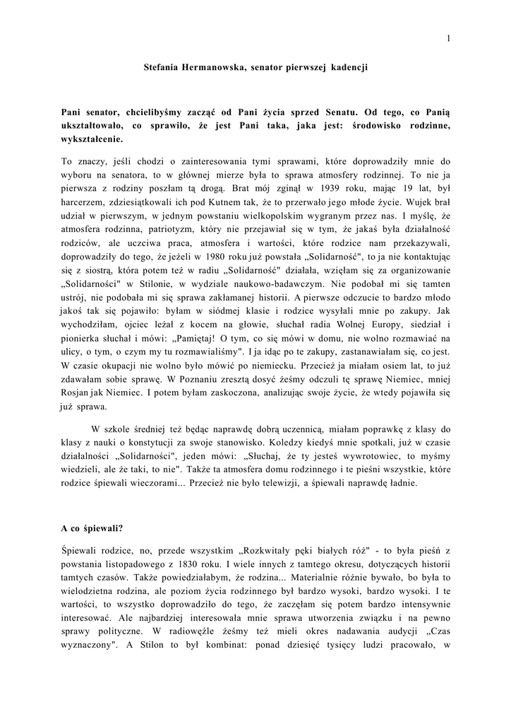 1 Stefania Hermanowska, senator pierwszej kadencji Pani senator, chcielibyśmy zacząć od Pani życia sprzed Senatu. Od tego, co Panią ukształtowało, co sprawiło, że jest Pani taka, jaka jest: środowisko rodzinne, wykształcenie. To znaczy, jeśli chodzi o zainteresowania tymi sprawami, które doprowadziły mnie do wyboru na senatora, to w głównej mierze była to sprawa atmosfery rodzinnej. To nie ja pierwsza z rodziny poszłam tą drogą. Brat mój zginął w 1939 roku, mając 19 lat, był harcerzem, zdziesiątkowali ich pod Kutnem tak, że to przerwało jego młode życie. Wujek brał udział w pierwszym, w jednym powstaniu wielkopolskim wygranym przez nas. I myślę, że atmosfera rodzinna, patriotyzm, który nie przejawiał się w tym, że jakaś była działalność rodziców, ale uczciwa praca, atmosfera i wartości, które rodzice nam przekazywali, doprowadziły do tego, że jeżeli w 1980 roku już powstała „Solidarność", to ja nie kontaktując się z siostrą, która potem też w radiu „Solidarność" działała, wzięłam się za organizowanie „Solidarności" w Stilonie, w wydziale naukowo-badawczym. Nie podobał mi się tamten ustrój, nie podobała mi się sprawa zakłamanej historii. A pierwsze odczucie to bardzo młodo jakoś tak się pojawiło: byłam w siódmej klasie i rodzice wysyłali mnie po zakupy. Jak wychodziłam, ojciec leżał z kocem na głowie, słuchał radia Wolnej Europy, siedział i pionierka słuchał i mówi: „Pamiętaj! O tym, co się mówi w domu, nie wolno rozmawiać na ulicy, o tym, o czym my tu rozmawialiśmy". I ja idąc po te zakupy, zastanawiałam się, co jest. W czasie okupacji nie wolno było mówić po niemiecku. Przecież ja miałam osiem lat, to już zdawałam sobie sprawę. W Poznaniu zresztą dosyć żeśmy odczuli tę sprawę Niemiec, mniej Rosjan jak Niemiec. I potem byłam zaskoczona, analizując swoje życie, że wtedy pojawiła się już sprawa. W szkole średniej też będąc naprawdę dobrą uczennicą, miałam poprawkę z klasy do klasy z nauki o konstytucji za swoje stanowisko. Koledzy kiedyś mnie spotkali, już w czasie działalności „Solidarności", jeden mówi: „Słuchaj, że ty jesteś wywrotowiec, to myśmy wiedzieli, ale że taki, to nie". Także ta atmosfera domu rodzinnego i te pieśni wszystkie, które rodzice śpiewali wieczorami... Przecież nie było telewizji, a śpiewali naprawdę ładnie. A co śpiewali? Śpiewali rodzice, no, przede wszystkim „Rozkwitały pęki białych róż" - to była pieśń z powstania listopadowego z 1830 roku. I wiele innych z tamtego okresu, dotyczących historii tamtych czasów. Także powiedziałabym, że rodzina... Materialnie różnie bywało, bo była to wielodzietna rodzina, ale poziom życia rodzinnego był bardzo wysoki, bardzo wysoki. I te wartości, to wszystko doprowadziło do tego, że zaczęłam się potem bardzo intensywnie interesować. Ale najbardziej interesowała mnie sprawa utworzenia związku i na pewno sprawy polityczne. W radiowęźle żeśmy też mieli okres nadawania audycji „Czas wyznaczony". A Stilon to był kombinat: ponad dziesięć tysięcy ludzi pracowało, w 2 „Solidarności" było potem ponad dziewięć tysięcy. Także nawet w sprawie Katynia to ja nadawałam tę audycję przez głośnik na cały zakład. Sprawy polityczne, sprawy zakłamanej historii. Ale sprawy poprawy życia społecznego, polityki społecznej były na pierwszym miejscu. W komisji zakładowej byłam członkiem prezydium i prowadziłam komisję spraw socjalnych, chodziło mi o warunki pracy, szczególnie kobiet, pracę nocną, poprawianie warunków pieniążkami - bo dodatek szkodliwy, a nie likwidacją tego, co się stało. Dlatego później w Senacie też byłam w Krajowej Radzie Ochrony Pracy, przekazując swoje obserwacje i dążenia do zmiany tej sytuacji w polityce społecznej. Przeglądałam teraz stenogramy z tamtego okresu. To jest ustawa, którą się szczególnie chlubię i która mi leżała bardzo na sercu: ustawa o zatrudnianiu i rehabilitacji osób niepełnosprawnych. Referowałam ją w Senacie i mogę śmiało powiedzieć, że byłam współtwórcą tej ustawy, bo wtedy w parlamencie Senat z Sejmem bardzo współpracował. Tę ustawę potem pomagałam wprowadzać w życie w Gorzowie, po pierwszej kadencji Senatu. I ta ustawa, wprawdzie do dzisiaj cztery razy już nowelizowana, ale potem na mocy tej ustawy utworzyliśmy warsztat terapii zajęciowej w Gorzowie, Stowarzyszenie Rodzin Katolickich jest organizatorem. No i gdybym była młodsza, to myślę, że niejedno w tym kierunku postarałabym się zrobić. A czasami wywalczyć, bo to różnie bywa. I to, co nie było ważne tak bardzo w tym ustroju socjalistycznym, bo właściwie pokrywało się te wszystkie schorzenia i choroby, były spółdzielnie inwalidzkie, ale t o ^ Tak nie lubię tej nazwy, ale określenie „getta" na te spółdzielnie to tak troszeczkę jest podobne, bo tam osoby niepełnosprawne pracowały na osoby niepełnosprawne. A chodziło o to, żeby pokonać tę barierę między niepełnosprawnymi, a że tak powiem, sprawnymi inaczej. I to się stało właśnie na mocy tej ustawy z 9 maja 1990 roku. No i dla mnie to był taki katechizm, rozporządzenie dotyczące tej ustawy. Mam tę ustawę, chociaż ona wtedy była... To była pierwsza w naszej ojczyźnie i na pewno nie była doskonała, ale co się udało, to się udały się właśnie te warsztaty terapii zajęciowej, pokonanie tej bariery i większe zrozumienie dla tych osób. Przecież w tej chwili na ulicach widać wózki, w życiu społecznym, kulturalnym, widać osoby niepełnosprawne. Zresztą Anna Dymna bardzo się tym zajmuje i znana jest z tego. Także to była najwspanialsza praca. Nie praca chemika, bo pracowałam w Stilonie, kochanym swoim zresztą zakładzie w naukowobadawczym, ale praca w warsztacie terapii zajęciowej dająca wielką satysfakcję. Mówię, gdybym jeszcze mogła pracować... Ale to wszystko j