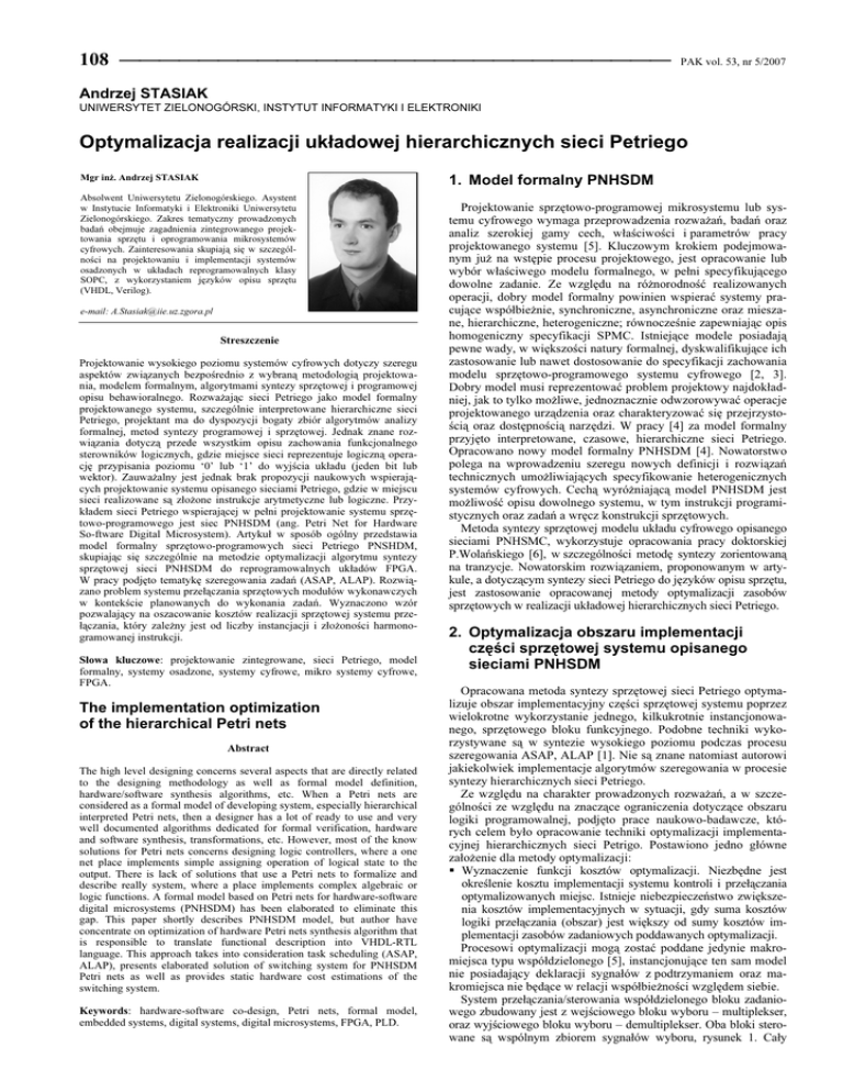 108 PAK vol. 53, nr 5/2007 Andrzej S T AS I AK UNIWERSYTET ZIELONOGÓRSKI, INSTYTUT INFORMATYKI I ELEKTRONIKI Optymalizacja realizacji układowej hierarchicznych sieci Petriego Mg r i n ż . A n d r z e j S T A S I A K A b s o lw e n t U n iw e rs y te tu Z ie lo n o g ó rs k ie g o . A s y s te n t w In s ty tu c ie In fo rm a ty k i i E le k tro n ik i U n iw e rs y te tu Z ie lo n o g ó rs k ie g o . Z a k re s te m a ty c z n y p ro w a d z o n y c h b a d a ń o b e jm u je z a g a d n ie n ia z in te g ro w a n e g o p ro je k to w a n ia s p rz ę tu i o p ro g ra m o w a n ia m ik ro s y s te m ó w c y fro w y c h . Z a in te re s o w a n ia s k u p ia ją s ię w s z c z e g ó ln o ś c i n a p ro je k to w a n iu i im p le m e n ta c ji s y s te m ó w o s a d z o n y c h w u k ła d a c h re p ro g ra m o w a ln y c h k la s y S O P C , z w y k o rz y s ta n ie m ję z y k ó w o p is u s p rz ę tu (V H D L , V e rilo g ). e-m a i l : A . S t a s i a k @ i i e. u z . z g o r a . p l S tr e s z c z e n ie Proj ek towa nie wy sok ieg o p oz iomu sy stemó w c y f rowy c h doty c z y sz ereg u a sp ek tó w z wią z a ny c h b ez p oś rednio z wy b ra ną metodolog ią p roj ek towa nia , modelem f orma lny m, a lg ory tma mi sy ntez y sp rz ę towej i p rog ra mowej op isu b eh a wiora lneg o. R oz wa ż a j ą c siec i Petrieg o j a k o model f orma lny p roj ek towa neg o sy stemu, sz c z eg ó lnie interp retowa ne h iera rc h ic z ne siec i Petrieg o, p roj ek ta nt ma do dy sp oz y c j i b og a ty z b ió r a lg ory tmó w a na liz y f orma lnej , metod sy ntez y p rog ra mowej i sp rz ę towej . J edna k z na ne roz wią z a nia doty c z ą p rz ede wsz y stk im op isu z a c h owa nia f unk c j ona lneg o sterownik ó w log ic z ny c h , g dz ie miej sc e siec i rep rez entuj e log ic z ną op era c j ę p rz y p isa nia p oz iomu ‘ 0’ lub ‘ 1 ’ do wy j ś c ia uk ł a du ( j eden b it lub wek tor) . Z a uwa ż a lny j est j edna k b ra k p rop oz y c j i na uk owy c h wsp iera j ą c y c h p roj ek towa nie sy stemu op isa neg o siec ia mi Petrieg o, g dz ie w miej sc u siec i rea liz owa ne są z ł oż one instruk c j e a ry tmety c z ne lub log ic z ne. Prz y k ł a dem siec i Petrieg o wsp iera j ą c ej w p eł ni p roj ek towa nie sy stemu sp rz ę towo-p rog ra moweg o j est siec PN H S D M ( a ng . Petri N et f or H a rdwa re S o-f twa re D ig ita l M ic rosy stem) . Arty k uł w sp osó b og ó lny p rz edsta wia model f orma lny sp rz ę towo-p rog ra mowy c h siec i Petrieg o PN S H D M , sk up ia j ą c się sz c z eg ó lnie na metodz ie op ty ma liz a c j i a lg ory tmu sy ntez y sp rz ę towej siec i PN H S D M do rep rog ra mowa lny c h uk ł a dó w F PG A. W p ra c y p odj ę to tema ty k ę sz ereg owa nia z a da ń ( AS AP, AL AP) . R oz wią z a no p rob lem sy stemu p rz eł ą c z a nia sp rz ę towy c h moduł ó w wy k ona wc z y c h w k ontek ś c ie p la nowa ny c h do wy k ona nia z a da ń . W y z na c z ono wz ó r p oz wa la j ą c y na osz a c owa nie k osz tó w rea liz a c j i sp rz ę towej sy stemu p rz eł ą c z a nia , k tó ry z a leż ny j est od lic z b y insta nc j a c j i i z ł oż onoś c i h a rmonog ra mowa nej instruk c j i. S ł o w a k l u c z o w e : p roj ek towa nie z integ rowa ne, siec i Petrieg o, model f orma lny , sy stemy osa dz one, sy stemy c y f rowe, mik ro sy stemy c y f rowe, F PG A. T h e i m p l em ent a t i o n o p t i m i za t i o n o f t h e h i era rc h i c a l P et ri net s A b str a c t T h e h ig h level desig ning c onc erns severa l a sp ec ts th a t a re direc tly rela ted to th e desig ning meth odolog y a s well a s f orma l model def inition, h a rdwa re/sof twa re sy nth esis a lg orith ms, etc . W h en a Petri nets a re c onsidered a s a f orma l model of develop ing sy stem, esp ec ia lly h iera rc h ic a l interp reted Petri nets, th en a desig ner h a s a lot of rea dy to use a nd very well doc umented a lg orith ms dedic a ted f or f orma l verif ic a tion, h a rdwa re a nd sof twa re sy nth esis, tra nsf orma tions, etc . H owever, most of th e k now solutions f or Petri nets c onc erns desig ning log ic c ontrollers, wh ere a one net p la c e imp lements simp le a ssig ning op era tion of log ic a l sta te to th e outp ut. T h ere is la c k of solutions th a t use a Petri nets to f orma liz e a nd desc rib e rea lly sy stem, wh ere a p la c e imp lements c omp lex a lg eb ra ic or log ic f unc tions. A f orma l model b a sed on Petri nets f or h a rdwa re-sof twa re dig ita l mic rosy stems ( PN H S D M ) h a s b een ela b ora ted to elimina te th is g a p . T h is p a p er sh ortly desc rib es PN H S D M model, b ut a uth or h a ve c onc entra te on op timiz a tion of h a rdwa re Petri nets sy nth esis a lg orith m th a t is resp onsib le to tra nsla te f unc tiona l desc rip tion into V H D L -R T L la ng ua g e. T h is a p p roa c h ta k es into c onsidera tion ta sk sc h eduling ( AS AP, AL AP) , p resents ela b ora ted solution of switc h ing sy stem f or PN H S D M Petri nets a s well a s p rovides sta tic h a rdwa re c ost estima tions of th e switc h ing sy stem. K e y w o r d s : h a rdwa re-sof twa re c o-desig n, Petri nets, f orma l model, emb edded sy stems, dig ita l sy stems, dig ita l mic rosy stems, F PG A, PL D . 1 . M o del f o rm a l ny P N H S D M P rojek t ow anie s p rzęt ow o-p rog ram ow ej m ik ros ys t em u l ub s ys t em u cyf row eg o w ym ag a p rzep row ad zenia rozw aż ań , b ad ań oraz anal iz s zerok iej g am y cech, w ł aś ciw oś ci i p aram et ró w p racy p rojek t ow aneg o s ys t em u [ 5 ] . K l uczow ym k rok iem p od ejm ow anym już na w s t ęp ie p roces u p rojek t ow eg o, jes t op racow anie l ub w yb ó r w ł aś ciw eg o m od el u f orm al neg o, w p eł ni s p ecyf ik ująceg o d ow ol ne zad anie. Z e w zg l ęd u na ró ż norod noś ć real izow anych op eracji, d ob ry m od el f orm al ny p ow inien w s p ier