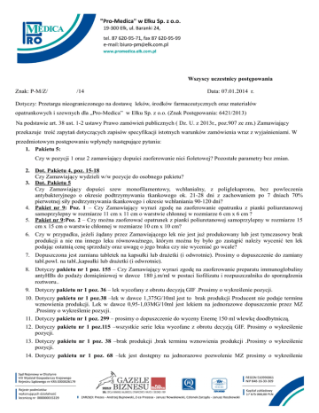 Wszyscy uczestnicy postępowania Znak: P-M/Z/ /14 Data: 07.01.2014 r. Dotyczy: Przetargu nieograniczonego na dostawę leków, środków farmaceutycznych oraz materiałów opatrunkowych i szewnych dla „Pro-Medica” w Ełku Sp. z o.o. (Znak Postępowania: 6421/2013) Na podstawie art. 38 ust. 1-2 ustawy Prawo zamówień publicznych ( Dz. U. z 2013r., poz.907 ze zm.) Zamawiający przekazuje treść zapytań dotyczących zapisów specyfikacji istotnych warunków zamówienia wraz z wyjaśnieniami. W przedmiotowym postępowaniu wpłynęły następujące pytania: 1. Pakietu 5: Czy w pozycji 1 oraz 2 zamawiający dopuści zaoferowanie nici fioletowej? Pozostałe parametry bez zmian. 2. Dot. Pakietu 4, poz. 15-18 Czy Zamawiający wydzieli w/w pozycje do osobnego pakietu? 3. Dot. Pakietu 5 Czy Zamawiający dopuści szew monofilamentowy, wchłanialny, z poliglekapronu, bez powleczenia antybakteryjnego o okresie podtrzymywania tkankowego ok. 21-28 dni z zachowaniem po 7 dniach 70% pierwotnej siły podtrzymywania tkankowego i okresie wchłaniania 90-120 dni? 4. Pakiet nr 9: Poz. 1 – Czy Zamawiający wyrazi zgodę na zaoferowanie opatrunku z pianki poliuretanowej samoprzylepny w rozmiarze 11 cm x 11 cm o warstwie chłonnej w rozmiarze 6 cm x 6 cm ? 5. Pakiet nr 9:Poz. 2 – Czy można zaoferować opatrunek z pianki poliuretanowej samoprzylepny w rozmiarze 15 cm x 15 cm o warstwie chłonnej w rozmiarze 10 cm x 10 cm? 6. Czy w przypadku, jeżeli żądany przez Zamawiającego lek nie jest już produkowany lub jest tymczasowy brak produkcji a nie ma innego leku równoważnego, którym można by było go zastąpić należy wycenić ten lek podając ostatnią cenę sprzedaży oraz uwagę o jego braku czy nie wyceniać go wcale? 7. Dopuszczona jest zamiana tabletek na kapsułki lub drażetki (i odwrotnie). Prosimy o dopuszczenie do zamiany tabl.powl. na tabl.,kapsułki lub drażetki (i odwrotnie). 8. Dotyczy pakietu nr 1 poz. 155 – Czy Zamawiający wyrazi zgodę na zaoferowanie preparatu immunoglobuliny antyHBs do podaży domięśniowej w dawce 180 j.m/ml w postaci liofilizatu i rozpuszczalnika do sporządzenia roztworu.. 9. Dotyczy pakietu nr 1 poz. 36 – lek wycofany z obrotu decyzją GIF .Prosimy o wykreślenie pozycji. 10. Dotyczy pakietu nr 1 poz.38 –lek w dawce 1,375G/10ml jest to brak produkcji Producent nie podaje terminu wznowienia produkcji. Lek w dawce 0,95-1,03MG/10ml jest lekiem na jednorazowe dopuszczenie przez MZ .Prosimy o wykreślenie pozycji. 11. Dotyczy pakietu nr 1 poz. 299 – prosimy o dopuszczenie do wyceny Enemę 150 ml wlewkę doodbytniczą. 12. Dotyczy pakietu nr 1 poz.115 –wszystkie serie leku wycofane z obrotu decyzją GIF. Prosimy o wykreślenie pozycji. 13. Dotyczy pakietu nr 1 poz. 38 –brak produkcji ,brak terminu wznowienia produkcji .Prosimy o wykreślenie pozycji. 14. Dotyczy pakietu nr 1 poz. 68 –lek jest dostępny na jednorazowe pozwolenie MZ prosimy o wykreślenie pozycji. 15. Dotyczy pakietu nr 1 poz. 75 –czasowy brak produkcji, prosimy o wykreślenie pozycji. 16. Dotyczy pakietu nr 1 poz. 148 –czasowy brak produkcji, producent nie podaje terminu wznowienia produkcji .Prosimy o wykreślenie pozycji. 17. Dotyczy pakietu nr 1 poz. 164 –lek na import docelowy .Czy Zamawiający dopuszcza lek na import docelowy. Jeśli nie to prosimy o wykreślenie pozycji. 18. Dotyczy pakietu nr 1 poz. 308 –zakończona produkcja leku .Prosimy o wykreślenie pozycji. 19. Dotyczy pakietu nr 1 poz. 316 –czasowy brak produkcji, prosimy o wykreślenie pozycji. 20. Zwracamy się z uprzejmą prośbą do Zamawiającego o udzielenie informacji czy w pakiecie nr 7 Zamawiający wymaga protez naczyń krwionośnych, poliestrowych uszczelnianych kolagenem i impregnowanych solami srebra (octan srebra) rozmiar 6 mm, dł. 40 cm? Pozostałe parametry zgodne z SIWZ. 21. Paragraf 3 ust. 5. Zwracamy się z prośbą o wykreślenie tego zapisu z umowy. Towar winien być dostarczany do godz. 14:00. Miejscem dostawy Zamówienia jest Apteka Zakładowa w „ProMedica” w Ełku Sp. z o.o., ul. Baranki 24, 19-300 Ełk. W sytuacjach pilnych dstawa nastąpi w ciągu 2 dni. 22. Paragraf 3 ust. 6. Ponieważ istnieją wątpliwości, czy dokument określony w § 3.6 Umowy spełnia wymogi przepisów podatkowych w zakresie faktury elektronicznej, w celu uiniknięcia niejasności prosimy o potwierdzenie, że wymóg określony w § 3.6 będzie spełniony poprzez dostarczenie faktury w wersji papierowej oraz specyfikacji uzupełniającej, która będzie przesłana droga elektroniczną i przygotowana w formacie stanowiącym załącznik do umowy (lub w innym formacie uzgodnionym z Działem Inforamtyki Zamawiającego). 23. Paragraf 5 ust. 1. Prosimy o modyfikację zapisu na brzmiący: Dostawa zamówionej partii materiałów opatrunkowych i szewnych winna się odbyć w czasie max. do 3 dni roboczych od momentu złożenia zamówienia przez Zamawiającego. Po tym terminie Zamawiający, po wcześniejszym poinformowaniu Wykonawcy, ma prawo do dokonywania zakupu u innego dostawcy lub producenta a różnicą w cenie zakupu obciążyć Wykonawcę. 24. Paragraf 6 ust. 2. Prosimy o mody fikację zapisu na brzmiący: W przypadku stwierdzenia braków ilościowych lub wad jakościowych Zamawiający niezwłocznie powiadomi o tym Dostawcę, który rozpatrzy reklamację dotyczącą: - braków ilościowych w ciągu 72 godzin - wad jakościowych w ciągu 14 dni Ewentualna wymiana nastąpi w ciągu 3 dni od uwzględnienia reklamacji. 25. Prosimy o dodanie do umowy zapisu: „Zamówienie jest ważne jeżeli posiada numer klienta i kody produktów” Prosimy o uwzględnienie w/w zapisu w treści umowy ponieważ nieczytelne zamówienia znacznie opóźniają dostawę produktów ważnych dla zdrowia i życia. 26. Czy Zamawiający wyrazi zgodę w Pakiecie 4 poz.1 również na nić poliamidową plecioną, pozostałe parametry bez zmian? 27. Czy Zamawiający wyłączy/wykreśli z Pakietu 4 pozycję 1? 28. Czy Zamawiający wyrazi zgod