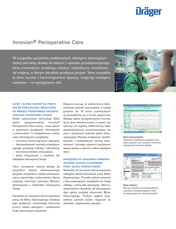 KOŁÓW ZNIECZULENIA NIEZALEŻNIE OD MIEJSCA PRZEBY WANIA PACJENTA PODCZAS INTENSY WNEJ TERAPII Dzięki zastosowaniu technologii Web, pakiet oprogramowania Innovian® Perioperative Care tworzy nową jakość w systemach zarządzania informacjami o znieczuleniu. To kompleksowe rozwiązanie informatyczne uwzględnia: – tworzenie harmonogramów zabiegów, – dokumentowanie wywiadu przedoperacyjnego, przebiegu indukcji i wybudzenia, – tworzenie protokołu znieczulenia, – pełną integralność z modułem dla Oddziałów Intensywnej Terapii. Takie rozwiązanie ułatwia dostęp do wszystkich danych obserwowanego pacjenta, związanych z opieką okołooperacyjną, zapewniając jednocześnie płynny przebieg informacji pomiędzy Blokiem Operacyjnym a Oddziałem Intensywnej Terapii. Narzędzie do tworzenia harmonogramów pracy dla Bloku Operacyjnego zwiększa jego wydajność, umożliwiając skrócenie przerw między zabiegami i zwiększenie liczby operowanych pacjentów. Eksperci szacują, że elektroniczna dokumentacja pozwala zaoszczędzić w każdej godzinie do 10 minut poświęcanych na prowadzenie jej w formie papierowej. Dlatego pakiet oprogramowania Innovian łączy dane zbierane przed, w czasie i po operacji we wspólny elektroniczny zapis anestezjologiczny, przemieszczający się wraz z pacjentem podczas opieki okołooperacyjnej. Pozwala zredukować nieefektywność i niedokładność ręcznej dokumentacji i pomaga zapewnić pacjentowi lepszą opiekę w oparciu o łatwo dostępne dane. Ekran karty pacjenta Zapewnia kompleksowy przegląd zmian stanu pacjenta oraz wszystkich informacji zapisywanych podczas zabiegu. NARZĘDZIE DO UKŁADANIA HARMONO- GRAMÓW: UŁATWIA PLANOWANIE PRACY BLOKU OPERACYJNEGO Narzędzie do tworzenia harmonogramów zabiegów ułatwia planowanie pracy Bloku Operacyjnego. Pozwala wybrać pacjenta z listy oczekujących i przydzielić mu rodzaj zabiegu i wolną salę operacyjną. Tablica z zestawieniem wszystkich sal operacyjnych daje ogólny podgląd aktywności Bloku Operacyjnego. Funkcja nagłych przypadków pozwala szybko reagować na zaistniałe, nieplanowane sytuacje. MT-1915-2008 ŁATWY I SZYBKI DOSTĘP DO PROTO- MT-1914-2008 W przypadku pacjentów poddawanych zabiegom operacyjnym, istotny jest łatwy dostęp do danych z wywiadu przedoperacyjnego, karty znieczulenia, przebiegu indukcji i wybudzania, niezależnie od miejsca, w którym aktualnie przebywa pacjent. Teraz wszystkie te dane, łącznie z harmonogramem operacji, mogą być dostępne wszędzie – na wyciągnięcie ręki. MT-1830-2008 Innovian® Perioperative Care Ekran badania Oferuje narzędzie do przeprowadzania wywiadów przedoperacyjnych, łatwe do dopasowania do własnych potrzeb. INNOvIAN PERIOPERATIvE CARE FORMULARZE PRZEDOPERACYJNE: WY WIAD DAJĄCY INFORMACJE Pakiet Innovian Perioperative Care pozwala na tworzenie formularzy do przeprowadzania i dokumentowania wywiadów przedoperacyjnych zgodnie z lokalnymi wymaganiami szpitala, uwzględniających historię zabiegów, informacje o alergiach, aktualne wyniki badań i wiele innych. Mogą zawierać również informacje o wynikach badań laboratoryjnych, dając pełną informację o stanie pacjenta przed zabiegiem. SALA OPERACYJNA: K ARTA ZNIECZULENIA, ELEKTRONICZNA I UKIERUNKOWANA Anestezjolog na sali operacyjnej zawsze musi być o krok do przodu. Karta znieczulenia stanowi oficjalny protokół z operacji, dlatego przypisanie do poszczególnych zdarzeń czasu ich wystąpienia jest tak istotne. Ponieważ wiele zdarzeń zachodzi jednocześnie, niemożliwe jest zapisanie ich wszystkich w momencie wystąpienia. Moduł opieki operacyjnej systemu Innovian pomaga anestezjologom w tych szczególnych sytuacjach dzięki automatycznemu zapisywaniu parametrów mierzonych oraz kalkulacji zużycia leków. Pomocne są również listy szybkiego wyboru oraz programowalne przyciski funkcyjne ze znacznikami czasu. SALA WYBUDZEŃ: PIERWSZY KROK POWROTU DO ZDROWIA Lekarze i pielęgniarki z Sali wybudzeń mogą podejrzeć dokumentację przebiegu operacji, aby lepiej przygotować się na przybycie pacjenta. Automatyczna kontynuacja protokołów znieczulenia eliminuje przerwy w dokumentacji, a automatyczny zapis danych z urządzeń medycznych oszczędza czas i pozwala skupić się na pacjencie. ROZWIĄZANIE, KTÓRE POMAGA PERSONELOWI, UŁATWIA PRZEPŁY W PRACY, CHRONI ŚRODOWISKO I BUDŻET Otwarty, modułowy i w pełni konfigurowalny pakiet Innovian został stworzony tak, aby można było dopasować go do istniejącego przepływu pracy i aby pozwalał na jego optymalizację w przyszłości. System można wdrożyć w pełnym zakresie od razu, lub stopniowo uzupełniać go o kolejne moduły. Dzięki zastosowanej technologii Innovian jest zarejestrowanym znakiem towarowym firmy Dräger CENTRALA Drägerwerk AG & Co. KGaA Moislinger Allee 53–55 23558 Lubeka, Niemcy www.draeger.com Producent: Draeger Medical Systems, Inc. 3135 Quarry Road Telford, PA 18969, USA System zarządzania jakością firmy Draeger Medical Systems, Inc. jest zgodny z normami ISO 13485, ISO 9001 i aneksem II.3 Dyrektywy 93/42/EWG (Urządzenia medyczne). POLSK A Dräger Polska Sp. z o.o. ul. Sułkowskiego 18a 85 - 655 Bydgoszcz Tel +48 52 346 14-33 (-34, -35) Fax +48 52 346 14-37 [email protected] Web system można wdrażać, konfigurować i zarządzać nim centralnie. Ten sam intuicyjny interfejs użytkownika w wszystkich modułach ogranicza konieczność przeprowadzania dodatkowych szkoleń i stres związany z pracą na różnych oddziałach. INTEGRACJA I WDROŻENIE Firma Dräger pomaga maksymalizować wykorzystanie zasobów ludzkich i sprzętowych szpitala oferując szeroki zakres globalnych usług, uwzględniający zarządzanie projektem, szkolenia i edukację. Wiemy, jak dostarczyć personelowi klinicznemu informacji, których potrzebuje. 90 68 592 | 09.10-2 | Communications & Sales Marketing | PL | PJ | Zastrzegamy prawo zmian | © 2014 Drägerwerk AG & Co. KGaA 02 |