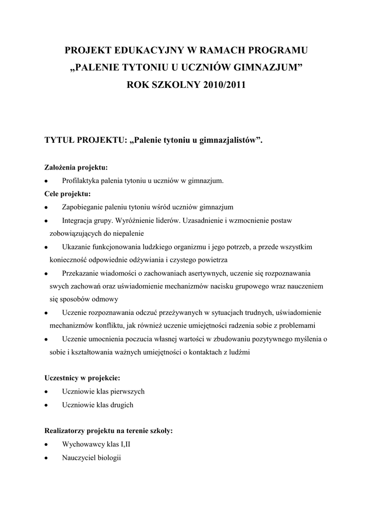 PROJEKT EDUKACYJNY W RAMACH PROGRAMU „PALENIE TYTONIU U UCZNIÓW GIMNAZJUM” ROK SZKOLNY 2010/2011 TYTUŁ PROJEKTU: „Palenie tytoniu u gimnazjalistów”. Założenia projektu: Profilaktyka palenia tytoniu u uczniów w gimnazjum. Cele projektu: Zapobieganie paleniu tytoniu wśród uczniów gimnazjum Integracja grupy. Wyróżnienie liderów. Uzasadnienie i wzmocnienie postaw zobowiązujących do niepalenie Ukazanie funkcjonowania ludzkiego organizmu i jego potrzeb, a przede wszystkim konieczność odpowiednie odżywiania i czystego powietrza Przekazanie wiadomości o zachowaniach asertywnych, uczenie się rozpoznawania swych zachowań oraz uświadomienie mechanizmów nacisku grupowego wraz nauczeniem się sposobów odmowy Uczenie rozpoznawania odczuć przeżywanych w sytuacjach trudnych, uświadomienie mechanizmów konfliktu, jak również uczenie umiejętności radzenia sobie z problemami Uczenie umocnienia poczucia własnej wartości w zbudowaniu pozytywnego myślenia o sobie i kształtowania ważnych umiejętności o kontaktach z ludźmi Uczestnicy w projekcie: Uczniowie klas pierwszych Uczniowie klas drugich Realizatorzy projektu na terenie szkoły: Wychowawcy klas I,II Nauczyciel biologii HARMONOGRAM ZADAŃ W RAMACH PROJEKTU W ROKU SZKOLNYM 2010/2011 SFERA INFORMACYJNA Termin Zadanie Osoby odpowiedzialne Marzec 2011 Zapoznanie szkolnego koordynatora z Pedagog szolny programem „ Palenie tytoniu u gimnazjalistów” Kwiecień Zapoznanie uczniów z programem „ Palenie 2011 tytoniu u gimnazjalistów”– ekspozycja gazetki Koordynator programu na korytarzu Kwiecień Zapoznanie wychowawców klas I,II z 2011 programem i omówienie zadań realizowanych Koordynator programu w ramach projektu. Maj 2011 Realizacja zadań w ramach projektu „Palenie Wychowawca klasy tytoniu u gimnazjalistów” Nauczyciel biologii SFERA ORGANIZACYJNA Uczniowie w projekcie: Realizacja godziny wychowawczej w klasach pierwszych pt. „Przebieg procesu uzależnienia od nikotyny” Nauczyciele w projekcie: Wychowawcy klas I realizują poszczególne tematy na godzinach wychowawczych.: „Skutki palenia tytoniu, Co nam daje nie palenie, Nauka asertywności”. Wychowawcy klas II realizują temat na godzinie wychowawczej: „Stop narkotykom” Koordynator programu na terenie szkoły – p. M. Zbyryt