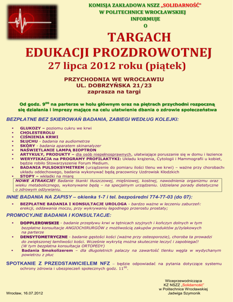 KOMISJA ZAKŁADOWA NSZZ „SOLIDARNOŚĆ” W POLITECHNICE WROCŁAWSKIEJ INFORMUJE O Od godz. 900 na parterze w holu głównym oraz na piętrach przychodni rozpoczną się działania i imprezy mające na celu ułatwienie dbania o zdrowie społeczeństwa BEZPŁATNE BEZ SKIEROWAŃ BADANIA, ZABIEGI WEDŁUG KOLEJKI: GLUKOZY – poziomu cukru we krwi CHOLESTEROLU CIŚNIENIA KRWI SŁUCHU - badania na audiometrze SKÓRY - badania aparatem skinanalyzer NAŚWIETLANIE LAMPĄ BIOPTRON ARTYKUŁY, PRODUKTY – dla osób niepełnosprawnych, ułatwiające poruszanie się w domu i łazience WERYFIKACJA na PROGRAMY PROFILAKTYKI: Układu krążenia, Cytologii i Mammografii u kobiet, będzie robiło Stowarzyszenie Forum Medium. BADANIA PULSOKSYMETREM (urządzenie do pomiaru ilości tlenu we krwi) – ważne przy chorobachch układu oddechowego, badania wykonywać będą pracownicy Uzdrowisk Kłodzkich STOPY – wkładki na miarę NOWE ATRAKCJE! Badanie tkanki tłuszczowej, mięśniowej, kostnej, nawodnienia organizmu oraz wieku metabolicznego, wykonywane będą – na specjalnym urządzeniu. Udzielane porady dietetyczne o zdrowym odżywianiu. INNE BADANIA NA ZAPISY – okienka 1-7 i tel. bezpośredni 774-77-03 (do 07): BEZPŁATNE BADANIA I KONSULTACJE UROLOGA - bardzo ważne w leczeniu zaburzeń: erekcji, oddawania moczu, przy wykrywaniu łagodnego przerostu prostaty; PROMOCYJNE BADANIA I KONSULTACJE: DOPPLEROWSKIE - badanie przepływu krwi w tętnicach szyjnych i kończyn dolnych w tym bezpłatne konsultacje ANGIOCHIRURGÓW z możliwością zakupów produktów p/żylakowych na parterze DENSYTOMETRYCZNE - badanie gęstości kości (ważne przy osteoporozie), choroba ta prowadzi do zwiększonej łamliwości kości. Wcześnie wykrytą można skutecznie leczyć i zapobiegać! (W tym bezpłatna konsultacja ORTOPEDY) Badania Smokolizerem – dla długoletnich palaczy na zawartość tlenku węgla w wydychanym powietrzu z płuc – będzie odpowiadać na pytania dotyczące systemu ochrony zdrowia i ubezpieczeń społecznych godz. 1100. SPOTKANIE Z PRZEDSTAWICIELEM NFZ Wrocław, 16.07.2012 Wiceprzewodnicząca KZ NSZZ „Solidarność” w Politechnice Wrocławskiej Jadwiga Szymonik