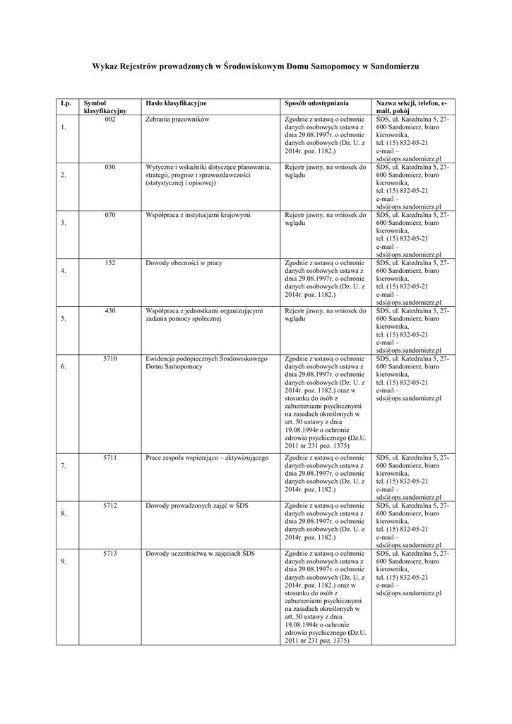 Wykaz Rejestrów prowadzonych w Środowiskowym Domu Samopomocy w Sandomierzu Lp. Hasło klasyfikacyjne Sposób udostępniania Zebrania pracowników Zgodnie z ustawą o ochronie danych osobowych ustawa z dnia 29.08.1997r. o ochronie danych osobowych (Dz. U. z 2014r. poz. 1182.) 030 Wytyczne i wskaźniki dotyczące planowania, strategii, prognoz i sprawozdawczości (statystycznej i opisowej) Rejestr jawny, na wniosek do wglądu 070 Współpraca z instytucjami krajowymi Rejestr jawny, na wniosek do wglądu 152 Dowody obecności w pracy Zgodnie z ustawą o ochronie danych osobowych ustawa z dnia 29.08.1997r. o ochronie danych osobowych (Dz. U. z 2014r. poz. 1182.) 430 Współpraca z jednostkami organizującymi zadania pomocy społecznej Rejestr jawny, na wniosek do wglądu 5710 Ewidencja podopiecznych Środowiskowego Domu Samopomocy Zgodnie z ustawą o ochronie danych osobowych ustawa z dnia 29.08.1997r. o ochronie danych osobowych (Dz. U. z 2014r. poz. 1182.) oraz w stosunku do osób z zaburzeniami psychicznymi na zasadach określonych w art. 50 ustawy z dnia 19.08.1994r o ochronie zdrowia psychicznego (Dz.U. 2011 nr 231 poz. 1375) 5711 Prace zespołu wspierająco – aktywizującego Zgodnie z ustawą o ochronie danych osobowych ustawa z dnia 29.08.1997r. o ochronie danych osobowych (Dz. U. z 2014r. poz. 1182.) 5712 Dowody prowadzonych zajęć w ŚDS Zgodnie z ustawą o ochronie danych osobowych ustawa z dnia 29.08.1997r. o ochronie danych osobowych (Dz. U. z 2014r. poz. 1182.) 5713 Dowody uczestnictwa w zajęciach ŚDS Zgodnie z ustawą o ochronie danych osobowych ustawa z dnia 29.08.1997r. o ochronie danych osobowych (Dz. U. z 2014r. poz. 1182.) oraz w stosunku do osób z zaburzeniami psychicznymi na zasadach określonych w art. 50 ustawy z dnia 19.08.1994r o ochronie zdrowia psychicznego (Dz.U. 2011 nr 231 poz. 1375) Symbol klasyfikacyjny 002 1. 2. 3. 4. 5. 6. 7. 8. 9. Nazwa sekcji, telefon, email, pokój ŚDS, ul. Katedralna 5, 27600 Sandomierz, biuro kierownika, tel. (15) 832-05-21 e-mail – [email protected] ŚDS, ul. Katedralna 5, 27600 Sandomierz, biuro kierownika, tel. (15) 832-05-21 e-mail – [email protected] ŚDS, ul. Katedralna 5, 27600 Sandomierz, biuro kierownika, tel. (15) 832-05-21 e-mail – [email protected] ŚDS, ul. Katedralna 5, 27600 Sandomierz, biuro kierownika, tel. (15) 832-05-21 e-mail – [email protected] ŚDS, ul. Katedralna 5, 27600 Sandomierz, biuro kierownika, tel. (15) 832-05-21 e-mail – [email protected] ŚDS, ul. Katedralna 5, 27600 Sandomierz, biuro kierownika, tel. (15) 832-05-21 e-mail – [email protected] ŚDS, ul. Katedralna 5, 27600 Sandomierz, biuro kierownika, tel. (15) 832-05-21 e-mail – [email protected] ŚDS, ul. Katedralna 5, 27600 Sandomierz, biuro kierownika, tel. (15) 832-05-21 e-mail – [email protected] ŚDS, ul. Katedralna 5, 27600 Sandomierz, biuro kierownika, tel. (15) 832-05-21 e-mail – [email protected] Ewidencja prowadzonych rejestrów w sekcji świadczeń Lp. Symbol klasyfikacji zgodnie z instrukcją kancelaryjną Nazwa ewidencji 1. 5011 zasiłki okresowe 2. 5012 zasiłki celowe 3. 5012.1. zasiłek celowy specjalny 4. 5012.2. zasiłek celowy- pomoc państwa w zakresie dożywiania 5. 5010 zasiłki stałe 6. 5013 Zasiłki i pożyczki w celu ekonomicznego usamodzielnienia 7. 5014 Zasiłki celowe w związku z klęską żywiołową lub ekologiczną 8. 5023 dożywianie 9. 5022 Udzielenie schronienia 10. 5024 Rejestr. spraw- udzielenie posiłku potrzebującym 11. 5020 Rejestr. spraw- udzielanie pomocy rzeczowej 12. 5026 kierowanie do domu pomocy społecznej 13. 5025 usługi opiekuńcze 14. 5025.1. usługi opiekuńcze zwykłe 15. 5025.2. specjalistyczne usługi opiekuńcze 16. 560 Informowanie jednostek zewnętrznych o osobach korzystających ze świadczeń lub dodatków 17. 430 Współpraca z jednostkami realizującymi zadania pomocy społecznej Sposób udostępniania Nazwa sekcji, telefon nr. pokoju Zgodnie z ustawą z dnia 29.08.1997r. o ochronie danych osobowych oraz art. 100 ust.1 ustawy z dnia 12.03.2004 o pomocy społecznej Sekcja świadczeń pok. nr. 7 i pok. nr. 10 ul. Słowackiego 17a tel. 15 832 29 04 wew.17 Sekcja świadczeń pok. nr. 7 i pok. 10 ul. Słowackiego 17a tel. 15 832 29 04 wew.17 Sekcja świadczeń pok. nr. 7 i pok. 10 ul. Słowackiego 17a tel. 15 832 29 04 wew.17 Sekcja świadczeń pok. nr. 7 i pok. 10 ul. Słowackiego 17a tel. 15 832 29 04 wew.17 Sekcja świadczeń pok. nr. 7 i pok. 10 ul. Słowackiego 17a tel. 15 832 29 04 Sekcja świadczeń pok. nr. 7 i pok. 10 ul. Słowackiego 17a tel. 15 832 29 04 Sekcja świadczeń pok. nr. 7 i pok. 10 ul. Słowackiego 17a tel. 15 832 29 04 Sekcja świadczeń pok. nr. 7 i pok. 10 ul. Słowackiego 17a tel. 15 832 29 04 Sekcja świadczeń pok. nr. 7 i pok. 10 ul. Słowackiego 17a tel. 15 832 29 04 Sekcja świadczeń pok. nr. 7 i pok. 10 ul. Słowackiego 17a tel. 15 832 29 04 Sekcja świadczeń pok. nr. 7 i pok. 10 ul. Słowackiego 17a tel. 15 832 29 04 Sekcja świadczeń pok. nr. 7 i pok. 10 ul. Słowackiego 17a tel. 15 832 29 04 Sekcja świadczeń pok. nr. 7 i pok. 10 ul. Słowackiego 17a tel. 15 832 29 04 Sekcja świadczeń pok. nr. 7 i pok. 10 ul. Słowackiego 17a tel. 15 832 29 04 Sekcja świadczeń pok. nr. 7 i pok. 10 ul. Słowackiego 17a tel. 15 832 29 04 Sekcja świadczeń pok. nr. 7 i pok. 10 ul. Słowackiego 17a tel. 15 832 29 04 Sekcja świadczeń pok. nr. 7 i pok. 10 ul. Słowackiego 17a tel. 15 832 29 04 18. 5810 Wspieranie rodziny 19. 5810.1. rejestr wniosków o przydzielenie asystenta rodziny 20. 5810.2. rejestr wydanych opinii 21. 5810.3. Kontakt z osobami i rodzinami 22. 5810.4. Spis teczek rodzin objętych wsparciem 23. 5810.5. Protokoły ze spotkań zespołu ds. Asysty Rodzinnej 24. 5810.6. Wydarzenia i imprezy w ramach pomocy rodzinie 25. 64 Zwalczanie alkoholizmu, narkomanii i przemocy w rodzinie 26. 64.1. Zwalczanie alkoholizmu i narkomanii 27. 64.2. Zwalczanie zjawiska przemocy w rodzinie 28. 434 Praca socjalna 29. 62 Posiedzenia zespołu Interd