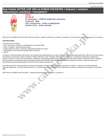 Informacje o produkcie Utworzono 07-03-2017 Nuk Kubek ACTIVE CUP 300 ml KUBUŚ PUCHATEK z klipsem i miękkim silikonowym ustnikiem "niekapkiem" Cena : 25,50 zł Nr katalogowy : 750413 kubeczek czerwony Producent : Nuk Stan magazynowy : brak w magazynie Średnia ocena : brak recenzji pl NUK Active Cup DISNEY Kubuś Puchatek 300 ml z klipsem i miękkim silikonowym ustnikiem "niekapkiem", dla aktywnych maluchów w wieku od 12 miesięcy. Charakterystyka ● ● ● ● ● dla dzieci od 12 miesięcy lekki i wytrzymały, wykonany z polipropylenu (nie zawiera BPA) kubek "niekapek", doskonały poza domem miękki silikonowy ustnik z systemem odpowietrzania NUK Air System kompatybilny z akcesoriami do butelek NUK First Choice 300 ml zk a. ● ec Im większe i bardziej aktywne jest dziecko, tym większe jego zapotrzebowanie na płyny. NUK Active Cup dzięki dużej pojemności (300 ml) jest przeznaczony dla aktywnych maluchów o dużym pragnieniu. Miękki silikonowy ustnik "niekapek" NUK First Choice sprawia, że kubek jest doskonałym towarzyszem dziecka na spacerze. Active Cup jest wykonany z lekkiego i wytrzymałego polipropylenu (PP) i ma atrakcyjne wzory ozdobne. Silikonowy ustnik "niekapek" jest wyposażony w antykolkowy system odpowietrzania NUK AIR SYSTEM. Kubek posiada także klips do przypięcia do paska, torebki lub wózka oraz przymocowaną przezroczystą osłonkę, aby chronić ustnik przed zabrudzeniem. in Inną zaletą są urocze motywy ozdobne z Kubusiem Puchatkiem. Kubuś Puchatek to najlepszy przyjaciel na świecie - uważa tak nie tylko Prosiaczek, Tygrysek i Kłapouchy, lecz także wszystkie dzieci. Tym bardziej więc będą szczęśliwe, gdy znajdą swoich ulubionych bohaterów na butelkach i smoczkach NUK. w w w .c al NUK Active Cup DISNEY Kubuś Puchatek - zaspokaja pragnienie podczas zabawy i na spacerze. Wygenerowano w programie www.oscGold.com