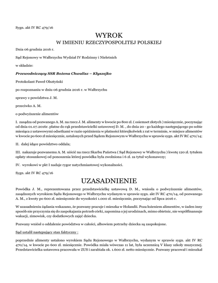 Sygn. akt IV RC 479/16 WYROK W IMIENIU RZECZYPOSPOLITEJ POLSKIEJ Dnia 06 grudnia 2016 r. Sąd Rejonowy w Wałbrzychu Wydział IV Rodzinny i Nieletnich w składzie: Przewodniczący SSR Bożena Chwalisz – Kłyszejko Protokolant Paweł Olsztyński po rozpoznaniu w dniu 06 grudnia 2016 r. w Wałbrzychu sprawy z powództwa J. M. przeciwko A. M. o podwyższenie alimentów I. zasądza od pozwanego A. M. na rzecz J. M. alimenty w kwocie po 800 zł. ( osiemset złotych ) miesięcznie, poczynając od dnia 01.07.2016r. płatne do rąk przedstawicielki ustawowej D. M. , do dnia 20 - go każdego następującego po sobie miesiąca z ustawowymi odsetkami w razie opóźnienia w płatności którejkolwiek z rat w terminie, w miejsce alimentów w kwocie po 600 zł miesięcznie, ustalonych przed Sądem Rejonowym w Wałbrzychu w sprawie sygn. akt IV RC 470/14; II. dalej idące powództwo oddala; III. nakazuje pozwanemu A. M. uiścić na rzecz Skarbu Państwa ( Sąd Rejonowy w Wałbrzychu ) kwotę 120 zł. tytułem opłaty stosunkowej od ponoszenia której powódka była zwolniona i 6 zł. za tytuł wykonawczy; IV. wyrokowi w pkt I nadaje rygor natychmiastowej wykonalności. Sygn. akt IV RC 479/16 UZASADNIENIE Powódka J. M., reprezentowana przez przedstawicielkę ustawową D. M., wniosła o podwyższenie alimentów, zasądzonych wyrokiem Sądu Rejonowego w Wałbrzychu wydanym w sprawie sygn. akt IV RC 470/14, od pozwanego A. M., z kwoty po 600 zł. miesięcznie do wysokości 1.000 zł. miesięcznie, poczynając od lipca 2016 r. W uzasadnieniu żądania wskazano, że pozwany pracuje i mieszka w Holandii. Poza łożeniem alimentów, w żaden inny sposób nie przyczynia się do zaspokajania potrzeb córki, zapomina o jej urodzinach, mimo obietnic, nie współfinansuje wakacji, zimowisk, czy dodatkowych zajęć dziecka. Pozwany wniósł o oddalenie powództwa w całości, albowiem potrzeby dziecka są zaspokojone. Sąd ustalił następujący stan faktyczny : poprzednie alimenty ustalono wyrokiem Sądu Rejonowego w Wałbrzychu, wydanym w sprawie sygn. akt IV RC 470/14, w kwocie po 600 zł. miesięcznie. Powódka miała wówczas 11 lat, była uczennicą V klasy szkoły muzycznej. Przedstawicielka ustawowa pracowała w ZUS i zarabiała ok. 1.600 zł. netto miesięcznie. Pozwany pracował i mieszkał w Holandii wraz z partnerką oraz dwójką dzieci z tego związku. Wynagrodzenie miesięczne pozwanego wynosiło 1.765 euro netto miesięcznie. Dowód : - akta Sądu Rejonowego w Wałbrzychu sygn. akt IV RC 470/14 Obecnie powódka ma 13 lat, kontynuuje naukę w szkole muzycznej, uczęszcza do I klasy Ogólnokształcącej Szkoły (...) stopnia w Zespole Szkół (...) w W.. Roczne opłaty wynoszą 150 zł. za wypożyczenie instrumentu, 300 zł. warsztaty orkiestrowe, 250 zł. fundusz muzyczny, 60 zł. rada rodziców, 53 zł. ubezpieczenie szkolne (...), a 5 zł. dziennie stawka za obiad. Powódka uczy się gry na wiolonczeli, jest jedną z najzdolniejszych uczennic, mimo, że jest dopiero uczennicą I klasy gimnazjum dostała się do orkiestry szkolnej, ma też dodatkowe zajęcia u profesora instrumentu we W.. Oprócz tych osiągnięć muzycznych, jest też bardzo dobrą uczennicą z innych przedmiotów, otrzymuje świadectwa z czerwonym paskiem. Bilet miesięczny kosztuje 50 zł. dojazdy do W. na lekcje 100-150 zł. miesięcznie, obiady w szkole 100-110 zł. miesięcznie, wyżywienie 600 zł. miesięcznie, rozrywka – 100 zł. miesięcznie, basen – ok. 30 zł. tygodniowo, odzież i obuwie – 700 zł. kwartalnie, kosmetyki związane ze skazą białkową – 200 zł. kwartalnie, wizyty u dentysty i ortodonty 250 zł. kwartalnie, wypoczynek letni – 2.000 zł. ferie zimowe 700-800 zł., podręczniki i wyprawka szkolna – 500 zł. rocznie. Wyjazd z orkiestrą na warsztaty – 350 zł. Kieszonkowe powódki, jakie otrzymuje od matki to 30-50 zł. miesięcznie. Małoletnia jest alergikiem – koszt leków w sezonie letnim od 60 do 100 zł. miesięcznie. Przedstawicielka ustawowa nadal pracuje w ZUS i zarabia ok. 1.900 zł. netto miesięcznie, nie korzysta z programu 500+. Mieszka tylko z córką. Czynsz za mieszkanie wynosi 500 zł. miesięcznie, energia elektryczna – 70 zł. miesięcznie, 500 zł. rocznie dopłaty za zużycie wody, telefony komórkowe powódki i przedstawicielki ustawowej – ok. 100 zł. miesięcznie. Dowód : - zaświadczenie o dochodach przedst. ustawowej - zaświadczenie Zespołu Szkół (...) z dn. 03.10.2016 r. oraz 21.08.2016 r. - decyzja prezydenta Miasta W. - zaświadczenia lekarskie - przesłuchanie stron Pozwany A. M. od 2009 r. mieszka w Holandii. Zarabia 1.800-1.900 euro miesięcznie. Pozostaje w związku z A. K., która pracuje w wymiarze ½ etatu i zarabia ok. 800 euro miesięcznie. Pozwany posiada z obecnego związku dwie córki – I. w wieku 6 lat oraz dwuletnią Z.. Pozwany otrzymuje zasiłki kwartalne na dzieci – po 197 euro dla Z. oraz 239 euro na I.. Pozwany zamieszkuje wraz z rodziną we własnościowym mieszkaniu. Spłaca kredyt hipoteczny po 781 euro miesięcznie, opłata za śmieci i ścieki – 100 euro miesięcznie, energia elektryczna i gaz – 150 euro miesięcznie, podatek od nieruchomości – 120 euro rocznie, telefony – ok. 100 euro miesięcznie, ubezpieczenie zdrowotne pozwanego – 114 euro miesięcznie, zaś jego partnerki – 120 euro miesięcznie. Pozwany posiada dwa samochody – A. (...) rok prod. 2000 oraz P. (...) rok prod. 2006. Pozwany nie łoży alimentów regularnie, utrzymuje sporadyczny kontakt z powódką. Dowód : - przesłuchanie stron Sąd zważył, co następuje : powództwo jest zasadne w części. Podstawą dochodzonego przez powódkę roszczenia jest przepis art. 138 k.r.o., zgodnie z którym w razie zmiany stosunków można żądać zmiany orzeczenia lub umowy dotyczącej obowiązku alimentacyjnego. Zmiany te należy jednak rozpatrywać biorąc również pod uwagę przepis art. 135 § 1 k.r.o., który stanowi, że zakres świadczeń alime