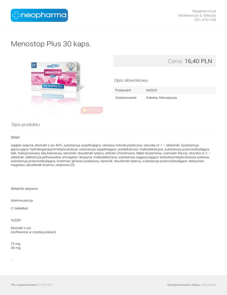 Neopharma.pl Mickiewicza 5, Mikstat 531-470-109 Menostop Plus 30 kaps. Cena: 16,40 PLN Opis słownikowy Producent HASCO Zastosowanie Kobieta, Menopauza Opis produktu Skład: węglan wapnia, ekstrakt z soi 40%, substancja wypełniająca: celuloza mikrokrystaliczna; otoczka nr 1 – składniki: (substancja glazurująca: hydroksypropylometyloceluloza; substancja wypełniająca: polidekstroza; maltodekstryna, substancja przeciwzbrylająca: talk; frakcjonowany olej kokosowy, barwniki: dwutlenek tytanu, żółcień chinolinowa, błękit brylantowy, czerwień Allura), otoczka nr 2 – składniki: (dekstroza jednowodna, emulgator: lecytyna; maltodekstryna, substancja zagęszczająca: karboksymetyloceluloza sodowa; substancja przeciwzbrylająca: krzemian glinowo-potasowy; barwnik: dwutlenek tytanu), substancje przeciwzbrylające: stearynian magnezu, dwutlenek krzemu; witamina D3. Składniki aktywne dzienna porcja (1 tabletka) %ZDS* Ekstrakt z soi (izoflawony w czystej postaci) 75 mg 30 mg - Plik wygenerowano: 07-03-2017 Oprogramowanie sklepu: AptusShop Neopharma.pl Mickiewicza 5, Mikstat 531-470-109 Witamina D3 2,5 µg 50 Wapń 182 mg 23 * zalecane dzienne spożycie Właściwości i zastosowanie: Izoflawony są naturalnymi związkami roślinnymi o strukturze podobnej do budowy żeńskich hormonów - estrogenów. Izoflawony sojowe przyczyniają się do równowagi hormonalnej w czasie klimakterium oraz pomagają łagodzić objawy związanych z okresem przekwitania. Zawarte w preparacie wapń i witamina D3 wpływają korzystnie na stan układu kostnego kobiet w okresie menopauzy. Wapń ma istotne znaczenie w procesie przebudowy układu kostnego, a witamina D3, zwiększa wchłanianie wapnia z przewodu pokarmowego. Menostop Plus jest przeznaczony dla kobiet w okresie okołomenopauzalnym do uzupełniania diety w składniki: izoflawony sojowe - o działaniu zbliżonym do hormonów żeńskich, wapń i witamina D3 - ułatwiające prawidłowy metabolizm tkanki kostnej Sposób użycia: 1 tabletka dziennie. Nie należy przekraczać zalecanej porcji do spożycia w ciągu dnia. Produkt nie może być stosowany jako substytut zróżnicowanej diety. Ważne jest prowadzenie zdrowego trybu życia i zrównoważonego sposobu żywienia. Plik wygenerowano: 07-03-2017 Powered by TCPDF (www.tcpdf.org) Oprogramowanie sklepu: AptusShop