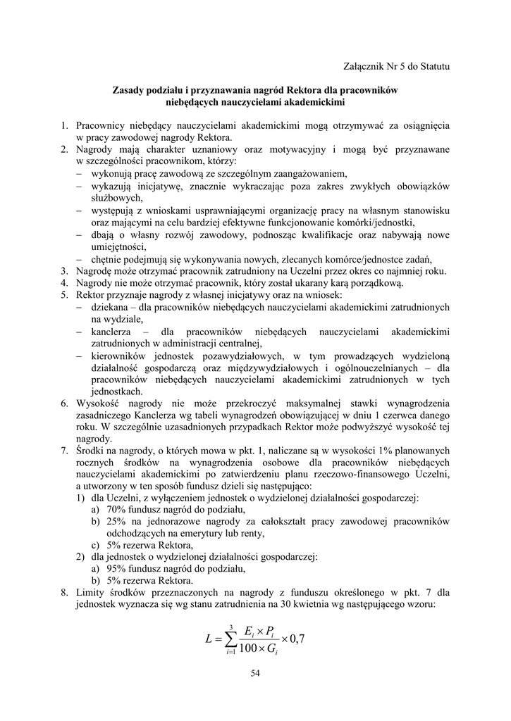 Załącznik Nr 5 do Statutu Zasady podziału i przyznawania nagród Rektora dla pracowników niebędących nauczycielami akademickimi 1. Pracownicy niebędący nauczycielami akademickimi mogą otrzymywać za osiągnięcia w pracy zawodowej nagrody Rektora. 2. Nagrody mają charakter uznaniowy oraz motywacyjny i mogą być przyznawane w szczególności pracownikom, którzy: − wykonują pracę zawodową ze szczególnym zaangażowaniem, − wykazują inicjatywę, znacznie wykraczając poza zakres zwykłych obowiązków służbowych, − występują z wnioskami usprawniającymi organizację pracy na własnym stanowisku oraz mającymi na celu bardziej efektywne funkcjonowanie komórki/jednostki, − dbają o własny rozwój zawodowy, podnosząc kwalifikacje oraz nabywają nowe umiejętności, − chętnie podejmują się wykonywania nowych, zlecanych komórce/jednostce zadań, 3. Nagrodę może otrzymać pracownik zatrudniony na Uczelni przez okres co najmniej roku. 4. Nagrody nie może otrzymać pracownik, który został ukarany karą porządkową. 5. Rektor przyznaje nagrody z własnej inicjatywy oraz na wniosek: − dziekana – dla pracowników niebędących nauczycielami akademickimi zatrudnionych na wydziale, − kanclerza – dla pracowników niebędących nauczycielami akademickimi zatrudnionych w administracji centralnej, − kierowników jednostek pozawydziałowych, w tym prowadzących wydzieloną działalność gospodarczą oraz międzywydziałowych i ogólnouczelnianych – dla pracowników niebędących nauczycielami akademickimi zatrudnionych w tych jednostkach. 6. Wysokość nagrody nie może przekroczyć maksymalnej stawki wynagrodzenia zasadniczego Kanclerza wg tabeli wynagrodzeń obowiązującej w dniu 1 czerwca danego roku. W szczególnie uzasadnionych przypadkach Rektor może podwyższyć wysokość tej nagrody. 7. Środki na nagrody, o których mowa w pkt. 1, naliczane są w wysokości 1% planowanych rocznych środków na wynagrodzenia osobowe dla pracowników niebędących nauczycielami akademickimi po zatwierdzeniu planu rzeczowo-finansowego Uczelni, a utworzony w ten sposób fundusz dzieli się następująco: 1) dla Uczelni, z wyłączeniem jednostek o wydzielonej działalności gospodarczej: a) 70% fundusz nagród do podziału, b) 25% na jednorazowe nagrody za całokształt pracy zawodowej pracowników odchodzących na emerytury lub renty, c) 5% rezerwa Rektora, 2) dla jednostek o wydzielonej działalności gospodarczej: a) 95% fundusz nagród do podziału, b) 5% rezerwa Rektora. 8. Limity środków przeznaczonych na nagrody z funduszu określonego w pkt. 7 dla jednostek wyznacza się wg stanu zatrudnienia na 30 kwietnia wg następującego wzoru: Ei × Pi × 0,7 × 100 G i =1 i 3 L=∑ 54 gdzie: Gi - liczba etatów w i-tej grupie pracowników Uczelni: 1. administracyjno-ekonomicznych 2. inżynieryjno-technicznych 3. obsługi Pi - planowane roczne wynagrodzenie i-tej grupy w Uczelni, Ei - liczba etatów i-tej grupy pracowniczej danej jednostki. 9. Limity ustalane są przez Dział Wynagrodzeń i przesyłane do jednostek organizacyjnych do 15 czerwca. 10. Wnioski o nagrodę Rektora należy składać do 15 września każdego roku w Dziale Wynagrodzeń. 11. Nagrody wypłacane są w październiku. 55