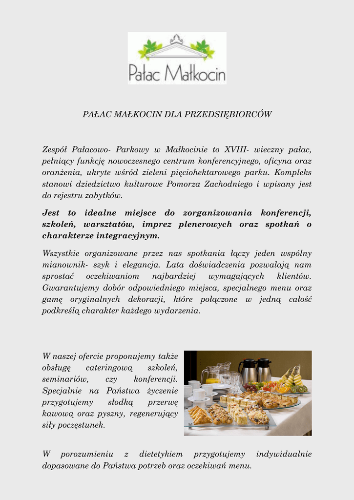 PAŁAC MAŁKOCIN DLA PRZEDSIĘBIORCÓW Zespół Pałacowo- Parkowy w Małkocinie to XVIII- wieczny pałac, pełniący funkcję nowoczesnego centrum konferencyjnego, oficyna oraz oranżenia, ukryte wśród zieleni pięciohektarowego parku. Kompleks stanowi dziedzictwo kulturowe Pomorza Zachodniego i wpisany jest do rejestru zabytków. Jest to idealne miejsce do zorganizowania konferencji, szkoleń, warsztatów, imprez plenerowych oraz spotkań o charakterze integracyjnym. Wszystkie organizowane przez nas spotkania łączy jeden wspólny mianownik- szyk i elegancja. Lata doświadczenia pozwalają nam sprostać oczekiwaniom najbardziej wymagających klientów. Gwarantujemy dobór odpowiedniego miejsca, specjalnego menu oraz gamę oryginalnych dekoracji, które połączone w jedną całość podkreślą charakter każdego wydarzenia. W naszej ofercie proponujemy także obsługę cateringową szkoleń, seminariów, czy konferencji. Specjalnie na Państwa życzenie przygotujemy słodką przerwę kawową oraz pyszny, regenerujący siły poczęstunek. W porozumieniu z dietetykiem przygotujemy indywidualnie dopasowane do Państwa potrzeb oraz oczekiwań menu. Zapraszamy do siedziby w okolicach Stargardu. W niezwykle urokliwym zespole pałacowo- parkowym w Małkocinie świadczymy wszelkie usługi cateringowe. Osobom urzeczonym klimatem XVIII- wiecznych wnętrz pałacu, oferujemy możliwość zorganizowania wszelkich imprez okolicznościowych, szkoleń, konferencji czy seminariów z możliwością noclegów i wyżywienia. Baza hotelowa to 60 miejsc w pokojach 1, 2, 3 i 4 osobowych. Nowoczesna kuchnia i personel są w stanie przygotować potrawy w różnych technologiach, wersjach kalorycznych oraz smakach. Osoby zainteresowane serdecznie zachęcamy do kontaktu! KONTAKT dr Magdalena Bihun tel. 608 332 178
