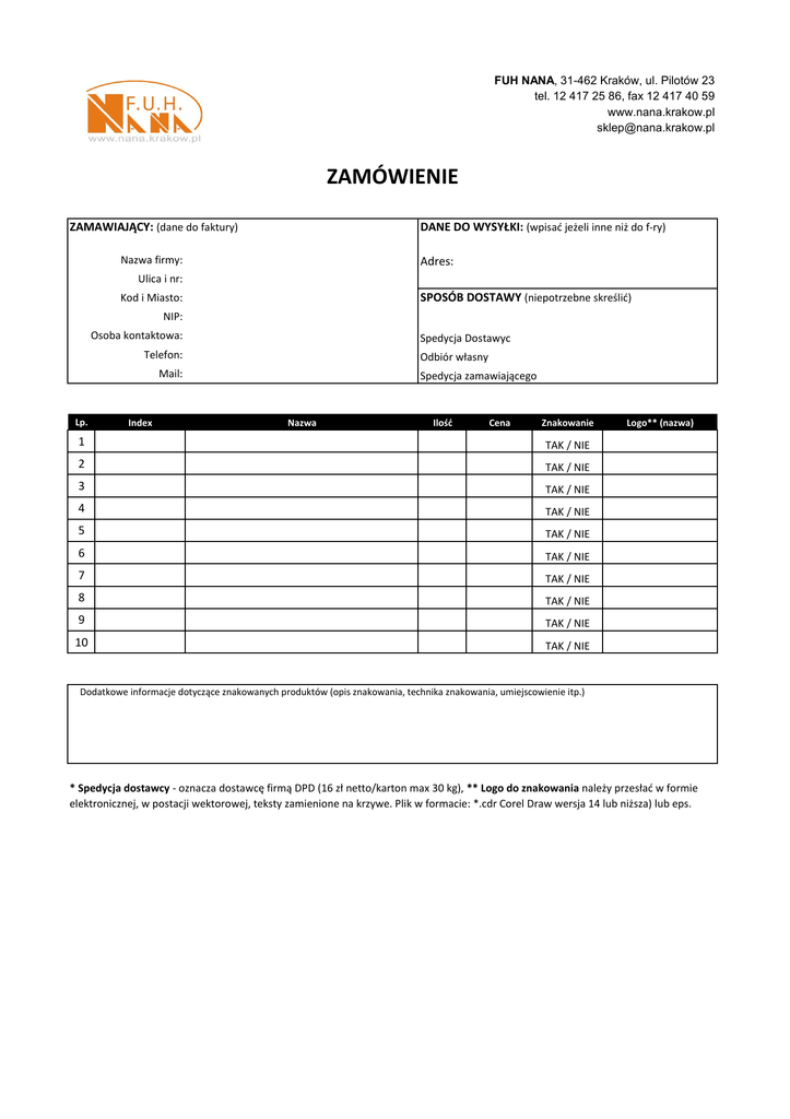 FUH NANA, 31-462 Kraków, ul. Pilotów 23 tel. 12 417 25 86, fax 12 417 40 59 www.nana.krakow.pl [email protected] ZAMÓWIENIE ZAMAWIAJĄCY: (dane do faktury) DANE DO WYSYŁKI: (wpisać jeżeli inne niż do f-ry) Nazwa firmy: Adres: Ulica i nr: SPOSÓB DOSTAWY (niepotrzebne skreślić) Kod i Miasto: NIP: Osoba kontaktowa: Spedycja Dostawyc Telefon: Odbiór własny Mail: Lp. Index Spedycja zamawiającego Nazwa Ilość Cena Znakowanie 1 TAK / NIE 2 TAK / NIE 3 TAK / NIE 4 TAK / NIE 5 TAK / NIE 6 TAK / NIE 7 TAK / NIE 8 TAK / NIE 9 TAK / NIE 10 TAK / NIE Logo** (nazwa) Dodatkowe informacje dotyczące znakowanych produktów (opis znakowania, technika znakowania, umiejscowienie itp.) * Spedycja dostawcy - oznacza dostawcę firmą DPD (16 zł netto/karton max 30 kg), ** Logo do znakowania należy przesłać w formie elektronicznej, w postacji wektorowej, teksty zamienione na krzywe. Plik w formacie: *.cdr Corel Draw wersja 14 lub niższa) lub eps.