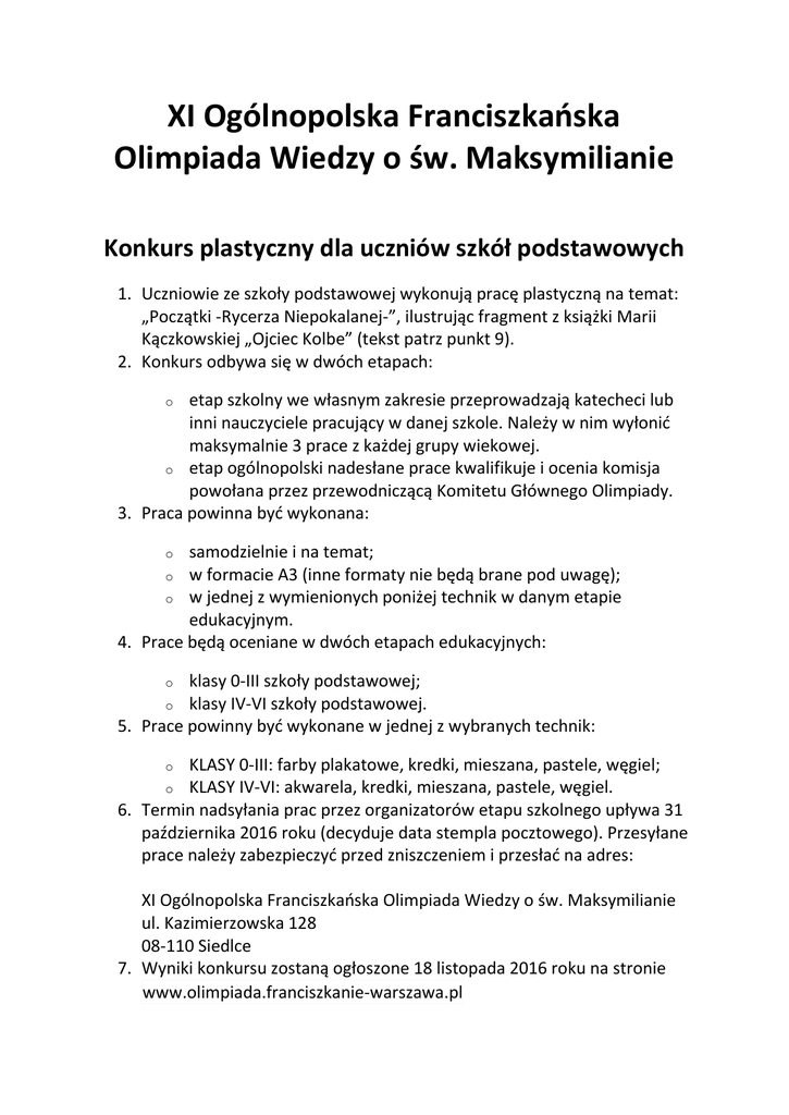 XI Ogólnopolska Franciszkańska Olimpiada Wiedzy o św. Maksymilianie Konkurs plastyczny dla uczniów szkół podstawowych 1. Uczniowie ze szkoły podstawowej wykonują pracę plastyczną na temat: „Początki -Rycerza Niepokalanej-”, ilustrując fragment z książki Marii Kączkowskiej „Ojciec Kolbe” (tekst patrz punkt 9). 2. Konkurs odbywa się w dwóch etapach: etap szkolny we własnym zakresie przeprowadzają katecheci lub inni nauczyciele pracujący w danej szkole. Należy w nim wyłonić maksymalnie 3 prace z każdej grupy wiekowej. o etap ogólnopolski nadesłane prace kwalifikuje i ocenia komisja powołana przez przewodniczącą Komitetu Głównego Olimpiady. 3. Praca powinna być wykonana: o samodzielnie i na temat; o w formacie A3 (inne formaty nie będą brane pod uwagę); o w jednej z wymienionych poniżej technik w danym etapie edukacyjnym. 4. Prace będą oceniane w dwóch etapach edukacyjnych: o klasy 0-III szkoły podstawowej; o klasy IV-VI szkoły podstawowej. 5. Prace powinny być wykonane w jednej z wybranych technik: o KLASY 0-III: farby plakatowe, kredki, mieszana, pastele, węgiel; o KLASY IV-VI: akwarela, kredki, mieszana, pastele, węgiel. 6. Termin nadsyłania prac przez organizatorów etapu szkolnego upływa 31 października 2016 roku (decyduje data stempla pocztowego). Przesyłane prace należy zabezpieczyć przed zniszczeniem i przesłać na adres: o XI Ogólnopolska Franciszkańska Olimpiada Wiedzy o św. Maksymilianie ul. Kazimierzowska 128 08-110 Siedlce 7. Wyniki konkursu zostaną ogłoszone 18 listopada 2016 roku na stronie www.olimpiada.franciszkanie-warszawa.pl 8. Na odwrocie każdej pracy należy umieścić dane według wzoru zawartego w punkcie 10. Regulaminu (tabelkę wypełniamy drukowanymi literami). 9. Fragment z książki Marii Kączkowskiej pt. „Ojciec Kolbe”: „5 listopada 1921 roku ojciec Maksymilian powrócił do Krakowa. Wprawdzie z pisemkiem (- Rycerzem Niepokalanej - ) jeszcze nic nie wiadomo, ale ojciec prowincjał jest przychylny. (...) Najgorzej z pieniędzmi. Na zakon nie ma co liczyć, bo w biedzie. Ojciec Maksymilian sam musi się starać o wszystko. (...)Pewnego dnia [ojciec Maksymilian] przyszedł do kościoła odprawić Mszę świętą. Na ołtarzu leżała koperta z napisem - Dla Ciebie, Matko Niepokalana - . Jakie było jego zdumienie, gdy znalazł w niej sumę potrzebną na opłacenie drukarni. Ni mniej, ni więcej. Właśnie tyle. Powstała jednak wątpliwość, co z tym zrobić. Czy ma prawo wziąć pieniądze na pisemko, czy też może zakon inaczej rozporządzi. W imię świętego posłuszeństwa ojciec Maksymilian poszedł do ojca gwardiana. Ależ tak, niech ojciec bierze. To pieniądze na pewno przeznaczone na pisemko. I niech ojciec podziękuje Niepokalanej powiedział gwardian życzliwie. To wszystko Jej dzieło pomyślał ojciec Maksymilian z dziecięcą ufnością i poszedł do drukarni zapłacić dług”. 10. Wzór tabelki z danymi ucznia do umieszczenia na odwrocie pracy (* WYPEŁNIĆ DRUKOWANYMI LITERAMI): Prace przynosimy do nauczycieli religii: P. Marty Florkiewicz-Kowalczyk oraz P. Michała Laskowskiego