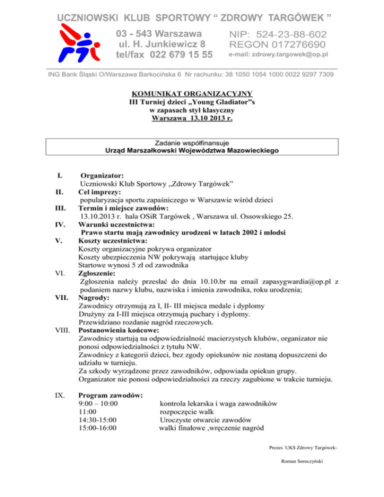 e-mail: [email protected] ING Bank Śląski O/Warszawa Barkocińska 6 Nr rachunku: 38 1050 1054 1000 0022 9297 7309 KOMUNIKAT ORGANIZACYJNY III Turniej dzieci ,,Young Gladiator”s w zapasach styl klasyczny Warszawa 13.10 2013 r. Zadanie współfinansuje Urząd Marszałkowski Województwa Mazowieckiego I. II. III. IV. V. VI. VII. VIII. IX. Organizator: Uczniowski Klub Sportowy „Zdrowy Targówek” Cel imprezy: popularyzacja sportu zapaśniczego w Warszawie wśród dzieci Termin i miejsce zawodów: 13.10.2013 r. hala OSiR Targówek , Warszawa ul. Ossowskiego 25. Warunki uczestnictwa: Prawo startu mają zawodnicy urodzeni w latach 2002 i młodsi Koszty uczestnictwa: Koszty organizacyjne pokrywa organizator Koszty ubezpieczenia NW pokrywają startujące kluby Startowe wynosi 5 zł od zawodnika Zgłoszenie: Zgłoszenia należy przesłać do dnia 10.10.br na email [email protected] z podaniem nazwy klubu, nazwiska i imienia zawodnika, roku urodzenia; Nagrody: Zawodnicy otrzymują za I, II- III miejsca medale i dyplomy Drużyny za I-III miejsca otrzymują puchary i dyplomy. Przewidziano rozdanie nagród rzeczowych. Postanowienia końcowe: Zawodnicy startują na odpowiedzialność macierzystych klubów, organizator nie ponosi odpowiedzialności z tytułu NW. Zawodnicy z kategorii dzieci, bez zgody opiekunów nie zostaną dopuszczeni do udziału w turnieju. Za szkody wyrządzone przez zawodników, odpowiada opiekun grupy. Organizator nie ponosi odpowiedzialności za rzeczy zagubione w trakcie turnieju. Program zawodów: 9:00 – 10:00 11:00 14:30-15:00 15:00-16:00 kontrola lekarska i waga zawodników rozpoczęcie walk Uroczyste otwarcie zawodów walki finałowe ,wręczenie nagród Prezes UKS Zdrowy TargówekRoman Soroczyński KOMUNIKAT ORGANIZACYJNY III Turniej Dzieci Yuong Gladiators w zapasach stylu klasycznym Warszawa 13 październik 2013 ORGANIZATORZY C E L I M P R E Z Y: Popularyzacja sportu zapaśniczego w środowisku warszawskim; T E R M I N I M I E J S C E: 13.10.2013 /niedziela/, sala sportowa OSiR Dzielnicy Targówek m. st. Warszawy, ul. Ossowskiego 25; W A R U N K I U C Z E S T N I C T W A: Warszawsko-Mazowiecki Okręgowy Związek Zapaśniczy W zawodach mają prawo startu zawodnicy urodzeni w latach 1999–2001; Kategorie wagowe: 35, 38, 42, 47, 53, 59, 66, 73, 85, 100 kg Z G Ł O S Z E N I E: Zgłoszenia należy przesłać do dnia 10.10.br na email [email protected] z podaniem nazwy klubu, nazwiska i imienia zawodnika, roku urodzenia oraz kategorii wagowej; UKS Zdrowy Targówek K O S Z T Y: Koszty organizacyjne pokrywają organizatorzy; Kluby ponoszą koszta z tytułu NW dla swoich zawodników; Startowe wynosi 10 zł od zawodnika N A G R O D Y: Zawodnicy otrzymują za I, II- III miejsca medale, dyplomy; Drużyny za I-III miejsca otrzymują puchary i dyplomy; Przewidziano rozdanie nagród rzeczowych. UKS Zapasy Gwardia P O S T A N O W I E N I A K O Ń C O W E: Zawodnicy startują na odpowiedzialność klubów macierzystych; Organizatorzy nie ponoszą odpowiedzialności z tytułu NW; Za szkody wyrządzone przez zawodników, odpowiada opiekun grupy. Organizatorzy nie ponoszą odpowiedzialności za rzeczy zagubione w trakcie turnieju. PROGRAM ZAWODÓW 9:oo – 10:oo – waga i kontrola lekarska zawodników 11:00 – 14;3o - rozpoczęcie walk 14:3o-15:oo - uroczyste otwarcie zawodów 15:oo-16:oo - walki finałowe, dekoracja W imieniu organizatorów SKARBNIK UKS Zapasy Gwardia /-/ Jan Czerniawski PREZES UKS Zdrowy Targówek /-/ Roman Soroczyński