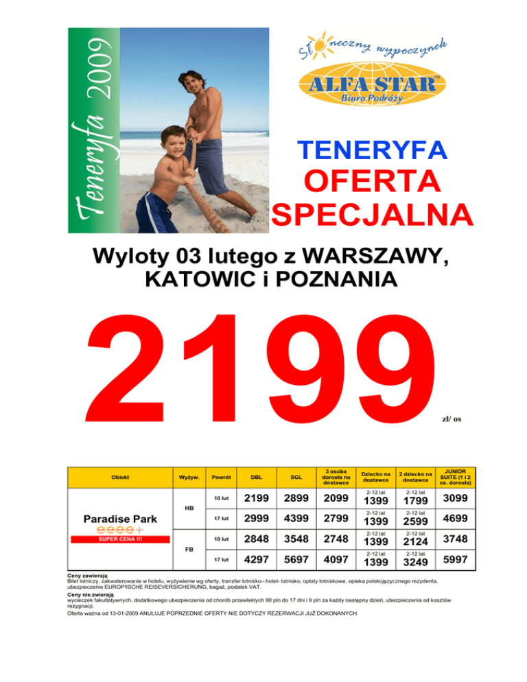 TENERYFA OFERTA SPECJALNA Wyloty 03 lutego z WARSZAWY, KATOWIC i POZNANIA 2199 Powrót DBL SGL 3 osoba dorosła na dostawce 10 lut 2199 2899 2099 Paradise Park 17 lut 2999 4399 2799 3548 2748 2-12 lat 10 lut 2848 2-12 lat SUPER CENA !!! 1399 2124 4297 5697 4097 2-12 lat 2-12 lat 17 lut 1399 3249 Obiekt Wyżyw. HB FB Dziecko na dostawce 2 dziecko na dostawce 2-12 lat 2-12 lat 1399 1799 2-12 lat 2-12 lat 1399 2599 zł/ os JUNIOR SUITE (1 i 2 os. dorosła) 3099 4699 3748 5997 Ceny zawierają Bilet lotniczy, zakwaterowanie w hotelu, wyżywienie wg oferty, transfer lotnisko– hotel- lotnisko, opłaty lotniskowe, opieka polskojęzycznego rezydenta, ubezpieczenie EUROP!ISCHE REISEVERSICHERUNG, bagaż, podatek VAT. Ceny nie zwierają wycieczek fakultatywnych, dodatkowego ubezpieczenia od chorób przewlekłych 90 pln do 17 dni i 9 pln za każdy następny dzień, ubezpieczenia od kosztów rezygnacji. Oferta ważna od 13-01-2009 ANULUJE POPRZEDNIE OFERTY NIE DOTYCZY REZERWACJI JUŻ DOKONANYCH
