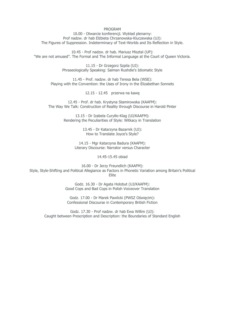 PROGRAM 10.00 - Otwarcie konferencji. Wykład plenarny: Prof nadzw. dr hab Elżbieta Chrzanowska-Kluczewska (UJ): The Figures of Suppression. Indeterminacy of Text-Worlds and Its Reflection in Style. 10.45 - Prof nadzw. dr hab. Mariusz Misztal (UP): “We are not amused”. The Formal and The Informal Language at the Court of Queen Victoria. 11.15 - Dr Grzegorz Szpila (UJ): Phraseologically Speaking: Salman Rushdie's Idiomatic Style 11.45 - Prof. nadzw. dr hab Teresa Bela (WSE): Playing with the Convention: the Uses of Irony in the Elizabethan Sonnets 12.15 - 12.45 przerwa na kawę 12.45 - Prof. dr hab. Krystyna Stamirowska (KAAFM): The Way We Talk: Construction of Reality through Discourse in Harold Pinter 13.15 - Dr Izabela Curyłło-Klag (UJ/KAAFM): Rendering the Peculiarities of Style: Witkacy in Translation 13.45 - Dr Katarzyna Bazarnik (UJ): How to Translate Joyce's Style? 14.15 - Mgr Katarzyna Badura (KAAFM): Literary Discourse: Narrator versus Character 14.45-15.45 obiad 16.00 - Dr Jerzy Freundlich (KAAFM): Style, Style-Shifting and Political Allegiance as Factors in Phonetic Variation among Britain's Political Elite Godz. 16.30 - Dr Agata Holobut (UJ/KAAFM): Good Cops and Bad Cops in Polish Voiceover Translation Godz. 17.00 - Dr Marek Pawlicki (PWSZ Oświęcim): Confessional Discourse in Contemporary British Fiction Godz. 17.30 - Prof nadzw. dr hab Ewa Willim (UJ): Caught between Prescription and Description: the Boundaries of Standard English
