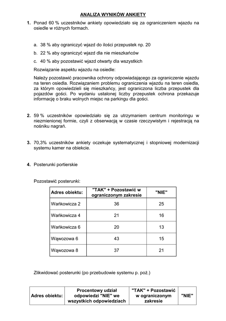 ANALIZA WYNIKÓW ANKIETY 1. Ponad 60 % uczestników ankiety opowiedziało się za ograniczeniem wjazdu na osiedle w róŜnych formach. a. 38 % aby ograniczyć wjazd do ilości przepustek np. 20 b. 22 % aby ograniczyć wjazd dla nie mieszkańców c. 40 % aby pozostawić wjazd otwarty dla wszystkich Rozwiązanie aspektu wjazdu na osiedle: NaleŜy pozostawić pracownika ochrony odpowiadającego za ograniczenie wjazdu na teren osiedla. Rozwiązaniem problemu ograniczenia wjazdu na teren osiedla, za którym opowiedzieli się mieszkańcy, jest ograniczona liczba przepustek dla pojazdów gości. Po wydaniu ustalonej liczby przepustek ochrona przekazuje informację o braku wolnych miejsc na parkingu dla gości. 2. 59 % uczestników opowiedziało się za utrzymaniem centrum monitoringu w niezmienionej formie, czyli z obserwacją w czasie rzeczywistym i rejestracją na nośniku nagrań. 3. 70,3% uczestników ankiety oczekuje systematycznej i stopniowej modernizacji systemu kamer na obiekcie. 4. Posterunki portierskie Pozostawić posterunki: Adres obiektu: "TAK" + Pozostawić w ograniczonym zakresie "NIE" Wańkowicza 2 36 25 Wańkowicza 4 21 16 Wańkowicza 6 20 13 Wąwozowa 6 43 15 Wąwozowa 8 37 21 Zlikwidować posterunki (po przebudowie systemu p. poŜ.) Adres obiektu: Procentowy udział odpowiedzi "NIE" we wszystkich odpowiedziach "TAK" + Pozostawić w ograniczonym zakresie "NIE" Wąwozowa 2 Wąwozowa 4 51,72% 59,65% 14 23 15 34 Zorganizować posterunek: Adres obiektu: Dembego 23B "TAK" 6 "NIE" 1 W wyniku analizy i zdecydowanej odpowiedzi mieszkańców bloku przy ulicy Dembego 23 B o woli zorganizowania posterunku portierskiego w ich budynku oraz świadomości Zarządu co do kosztów szacowanych na poziomie około 100 000zł za nowe stanowisko pracy rozliczanych wyłącznie na budynku (tj. 21 lokali mieszkalnych w tym wypadku) opłata z tytułu dodatkowej ochrony na tym budynku obciąŜyła by kaŜdy lokal kwotą wielkości około 400 zł/miesięcznie, co nie jest akceptowalne. W wyniku tej decyzji rozwiązaniem, bardziej ekonomicznym i w opinii Zarządu zasadnym, jest wykonanie nowej instalacji kamer na obiekcie (garaŜ, klatka schodowa, wejście do budynku) i podłączenie jej do istniejącego systemu monitoringu jako elementu umoŜlwiającego poprawę bezpieczeństwa i weryfikację w czasie rzeczywistym osób dostających się do tego budynku. Koszt wykonania instalacji niewątpliwie będzie rozwiązaniem tańszym, mającym wpływ na znaczącą poprawę bezpieczeństwa i moŜliwość weryfikacji ewentualnych sprawców wykroczeń niŜ wykonanie posterunku portierskiego w budynku, który takowego nie posiadał oraz ponoszenia comiesięcznych kosztów pracy ochrony przy uwzględnieniu tak małej ilości lokali, na które rozkłada się koszt ochrony. 5. 55,04% respondentów opowiedziało się za podtrzymaniem decyzji o braku patrolu pieszego obchodowego. 6. Dla budynku Wąwozowa 2 - 72,41 % osób opowiedziało się za zmianą istniejącego systemu przeciw poŜarowego z obsługą przez pracownika ochronny na inny tańszy w eksploatacji (~16% właścicieli lokali) Dla budynku Wąwozowa 4 - 82,14 % osób opowiedziało się za zmianą istniejącego systemu przeciw poŜarowego z obsługą przez pracownika ochronny na inny tańszy w eksploatacji (~26% właścicieli lokali) W powiązaniu tych oczekiwań z przekazanymi opiniami mieszkańców obydwóch w/w budynków o likwidacji posterunków portierskich podjęte zostaną działania w celu ograniczenia konieczności weryfikacji alarmów poŜarowych przez pracownika ochrony poprzez koincydencję czujek p.poŜ z automatycznym powiadamianiem straŜy poŜarnej. ZARZĄD SMB „Osiedle Kabaty”