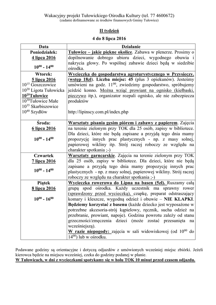 Wakacyjny projekt Tułowickiego Ośrodka Kultury (tel. 77 4600672) (zadanie dofinansowane ze środków finansowych Gminy Tułowice) II tydzień 4 do 8 lipca 2016 Działanie Tułowice – jakie piękne okolice. Zabawa w plenerze. Prosimy o dopilnowanie dobrego ubioru dzieci, wygodnego obuwia i nakrycia głowy. Po wspólnej zabawie dzieci będą w siedzibie 1000 - 1400 ośrodka. Wtorek: Wycieczka do gospodarstwa agroturystycznego w Przysieczy. (wstęp 18zł). Liczba miejsc: 45 (plus 3 opiekunów). Jesteśmy 5 lipca 2016 15 10 Goszczowice umówieni na godz. 1100, zwiedzimy gospodarstwo, spróbujemy 1020 Ligota Tułowicka jeździć konno. Można wziąć prowiant na ognisko (kiełbaski, pieczywo itp.), organizator rozpali ognisko, ale nie zabezpiecza 1025Tułowice 1030Tułowice Małe produktów 35 10 Skarbiszowice 1040 Szydłów http://lipinscy.com.pl/index.php Data Poniedziałek: 4 lipca 2016 Środa: 6 lipca 2016 1000 - 1400 Czwartek 7 lipca 2016 1000 - 1400 Piątek 8 lipca 2016 1000 - 1600 Warsztaty pisania gęsim piórem i zabawy z papierem. Zajęcia na terenie zielonym przy TOK dla 25 osób, zapisy w bibliotece. Dla dzieci, które nie będą zapisane a przyjdą tego dnia mamy propozycję innych prac plastycznych - np. z masy solnej, papierowej wikliny itp. Strój raczej roboczy ze względu na charakter spotkania ;-) Warsztaty garncarskie. Zajęcia na terenie zielonym przy TOK dla 25 osób, zapisy w bibliotece. Dla dzieci, które nie będą zapisane a przyjdą tego dnia mamy propozycję innych prac plastycznych - np. z masy solnej, papierowej wikliny. Strój raczej roboczy ze względu na charakter spotkania ;-) Wycieczka rowerowa do Lipna na basen (5zł). Ruszamy całą grupą spod ośrodka. Każdy uczestnik ma sprawny rower (sprawdzony przed wycieczką), czapkę, preparat odstraszający komary i kleszcze, wygodną odzież i obuwie – NIE KLAPKI. Będziemy korzystać z basenu (każde dziecko jest wyposażone w potrzebne akcesoria-strój kąpielowy, ręcznik, sucha odzież na przebranie, prowiant, napoje). Godzina powrotu zależy od stanu grzeczności/zmęczenia dzieci (może zostać przesunięta na wcześniejszą). W razie niepogody: zajęcia w sali widowiskowej (od 1000 do 1400) lub w ośrodku. Podawane godziny są orientacyjne i dotyczą odjazdów z umówionych wcześniej miejsc zbiórki. Jeżeli kierowca będzie na miejscu wcześniej, czeka do godziny podanej w planie. W Tułowicach, w dni z wycieczkami spotykamy się w holu TOK 10 minut przed czasem odjazdu.