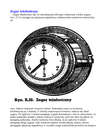Zegar telefoniczny Zegar zbudowany tak, że naciśnięciem dźwigni widocznej z boku zegara (rys. Z.31) naciąga się sprężynę napędową i jednocześnie nastawia wskazówkę na zero. Zakres wskazań wynosi 6 minut. Jednostką czasu za rozmowę telefoniczną są 3 minuty. Z chwilą rozpoczęcia rozmowy włącza się chód zegara. Po upływie 3 minut następuje sygnał dzwonkowy. Jest to ostrzeżenie, że jedna jednostka minęła i należy kończyć rozmowę, jeśli nie chce się płacić za następną jednostkę. Jeżeli rozmowa trwa dłużej, to po upływie 6 minut następuje drugi sygnał. Gdy rozmowa będzie trwała dłużej, należy znowu naciągnąć sprężynę napędową, w wyniku czego wskazówka powróci na miejsce zerowe i za trzecią jednostkę będzie się liczyć od początku. Po skończonej rozmowie naciąga się sprężynę i nastawia wskazówkę na zero. Istnieją też takie zegary telefoniczne, w których sprężynę naciąga się naciśnięciem tłoczka znajdującego się na wierzchu obudowy. źródło: Bartnik i Podwapiński "Ilustrowany słownik zegarmistrzowski"