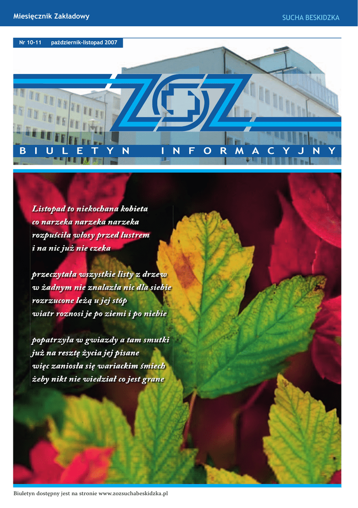 Miesięcznik Zakładowy Nr 10-11 SUCHA BESKIDZKA październik-listopad 2007 B I U L E T Y N I N F O R M A C Y J N Y Listopad to niekochana kobieta co narzeka narzeka narzeka rozpuściła włosy przed lustrem i na nic już nie czeka przeczytała wszystkie listy z drzew w żadnym nie znalazła nic dla siebie rozrzucone leżą u jej stóp wiatr roznosi je po ziemi i po niebie popatrzyła w gwiazdy a tam smutki już na resztę życia jej pisane więc zaniosła się wariackim śmiech żeby nikt nie wiedział co jest grane Biuletyn dostępny jest na stronie www.zozsuchabeskidzka.pl nr 10-11 październik-listopad 2008 B i u l e t y n i n f o r m a c y j n y POŻEGNANIE PANI DOKTOR MARII RAUCH Śpieszmy się kochać ludzi tak szybko odchodzą zostaną po nich buty i telefon głuchy... Z głębokim żalem i smutkiem informujemy że w dniu 16 października 2008 roku, odeszła od nas śp lek. med. MARIA RAUCH Koordynator Oddziału Neonatologicznego, Pełnomocnik Zintegrowanego Systemu Zarządzania osoba skromna i dobra, zawsze życzliwa, wrażliwa, służąca pomocą innym ludziom. Łączymy się w bólu z Rodziną i Najbliższymi. Dyrekcja oraz pracownicy Zespołu Opieki Zdrowotnej w Suchej Beskidzkiej Spis treści: POŻEGNANIE PANI DOKTOR MARII RAUCH ........................................................................................... 2-4 Informacje z życia Szpitala .................................................................................................................................. 4-5 Dział Służb Pracowniczych przypomina ...................................................................................................... 6 Ranking Szpitali „Bezpieczny Szpital” – wyniki ............................................................................................... 6 Biała Sobota w Makowie Podhalańskim – rak wcześnie wykryty to większa szansa na wyleczenie ! ....... 6 Biała Sobota w Jordanowie - podsumowanie .................................................................................................. 6-7 Badanie satysfakcji pacjentów w roku 2008 – podsumowanie wyników ....................................................... 7-9 Żywienie w alergii pokarmowej .......................................................................................................................... 9-10 Informacje z Działu Prawnego ........................................................................................................................... 10 Informacje w ochronie zdrowia .......................................................................................................................... 11 Wycieczka zakładowa do Paryża ........................................................................................................................ 12 MECZ PIŁKARSKI Administracja i Obsługa – Lekarze ................................................................................. 12 2 B i u l e t y n W imieniu własnym, Dyrektora/Ministra Marka Habera, Dyrektora Andrzeja Barałkiewicza, obecnych dyrektorów Zespołu Opieki Zdrowotnej w Suchej Beskidzkiej chciałbym przekazać kilku słów o Pani Doktor Marii Rauch. Dla mnie Pani Doktor pracowała w suskim szpitalu od zawsze. Pracowała i żyła „życiem” całego szpitala. W Zespole Opieki Zdrowotnej w Suchej Beskidzkiej pracowała przez 23 lata. Od roku 1994 kierowała Oddziałem Neonatologicznym naszego Szpitala. Dzięki Jej zaangażowaniu powstał jeden z najlepszych oddziałów neonatologicznych w szpitalach powiatowych Małopolski. Ileż to razy przekonywała mnie oraz inne osoby do swoich pomysłów, które wydawały się na początku wręcz niemożliwe do realizacji. Potrafiła jednak swoją pasję zaszczepić u innych. Pamiętam jak namawiała mnie do sfinansowania zakupów sprzętu medycznego na swój oddział. Sądząc, że jest to kolejna prośba wymagająca dużych nakładów finansowych patrzyłem na to sceptycznie. Ale nie mogłem użyć żadnego argumentu, który w sposób fachowy i rzeczowy nie zostałby przez Panią Doktor podważony. Zawsze potrafiła przekonać mnie do swoich racji. W 2000 roku otrzymaliśmy po raz pierwszy certyfikat akredytacyjny. Ileż w to, aby go uzyskać, było zaangażowania Pani Doktor, naszej Marysi. Nie sposób tego opisać. To dzięki Twojej, Marysiu, sile przekonywania personelu – lekarzy, pielęgniarek, i nie tylko, udało się to osiągnąć. Byłaś osobą, która potrafiła to zrobić, bo głęboko w to wierzyłaś. Kolejne certyfikaty, ISO to też Twoja zasługa. Gdy wiosną 2003 r. dowiedziałem się o Twoich planach starania o jego uzyskanie, to tylko wątpiąco pokiwałem głową. Ale poprowadziłaś nasz szpital wraz ze swoim zespołem ds. jakości do tego celu i osiągnęliśmy go. To właśnie między innymi dzięki Twojej osobie nasz szpital cieszy się dobra opinią i wypracował silną pozycję w Małopolsce. Przed operacją zaglądnęłaś do mnie. Pocieszałem Cię i mówiłem: „wracaj szybko; jak bez Ciebie poradzę sobie z kolejnym audytem?”. Tak bardzo wszyscy wierzyliśmy, że pokonasz chorobę, że operacja, której musiałaś się poddać powiedzie się i wrócisz do naszego zespołu w pełni zdrowia, dalej leczyć, dalej z nami pracować i być z nami. Los chciał inaczej. Rzadko się zdarza, aby z naszego grona odszedł Ordynator pełniący swoją funkcję do ostatnich dni swojego życia. Jeszcze miesiąc temu pracowałaś w oddziale, kierowałaś zespołem, ustalałaś kolejną wizytę audytorów jakości, zaglądałaś do naszych dyrektorskich gabinetów coś przedyskutować, ustalić, pogwarzyć. Trudno będzie pogodzić się z myślą, że już nigdy tego nie zrobisz. Żegnaj Marysiu! Żegnam Cię w imieniu Wszystkich z którymi pracowałaś, z którymi tworzyłaś wspólne dobro jakim jest suski Szpital. Żegnam Cię 3 i n f o r m a c y j n y w imieniu poprzedniej i obecnej Dyrekcji Zespołu Opieki Zdrowotnej w Suchej Besk