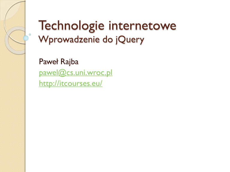 Technologie internetowe Wprowadzenie do jQuery Paweł Rajba [email protected] http://itcourses.eu/ Plan wykładu Wprowadzenie Składnia No conflict Selektory Zdarzenia Efekty Operowanie na HTML i CSS Wprowadzenie Co to jest i dlaczego jQuery? ◦ ◦ ◦ ◦ ◦ Biblioteka JavaScript Łatwa do nauczenia Łatwa w użyciu Znacznie upraszcza programowanie w JavaScript Jest mnóstwo już napisanego kodu w jQuery, który można dalej rozwijać dzięki różnorodności pozwala zachować spójność i całość rozwiązania oprzeć tylko na jednej bibliotece (jQuery) ◦ Strona domowa: http://jquery.com/ Wprowadzenie Skrypt jQuery osadzamy wskazując ◦ lokalizację lokalną ◦ lokalizację na jednym z serwerów CDN Korzystamy przez zmienną: jQuery lub $ Niniejsze wprowadzenie na podstawie: ◦ http://learn.jquery.com/ ◦ http://api.jquery.com/ ◦ http://www.w3schools.com/jquery/ Wprowadzenie Gdzie jest void main()? ◦ $(document).ready(function() { … }); ◦ $(window).load(function() { … }); window.onload = function() { … }; ◦ ready() vs window.onload ready() – tylko DOM (bez obrazków, ramek, itd.) window.onload – wszystko Ważne, aby użyć jednego z powyższych Pozwala uniknąć operowania na jeszcze nieistniejących obiektach Składnia Podstawowa składnia: $(selektor).akcja1().akcja2().akcjaN() Przykład: hello-jquery.html No conflict Do korzystania z funkcjonalności jQuery korzystamy z aliasu $ ◦ jest krótki i wygodny ◦ jednak czasami niepożądany, gdy korzystamy z innych bibliotek również korzystających z tego skrótu. ◦ Rozwiązanie: możemy użyć mechanizmu nonConflict Przykład: noconflict.html Pod adresem: http://api.jquery.com/jQuery.noConflict/ mamy szereg jeszcze innych konstrukcji tego mechanizmu Selektory Ich rola jest analogiczna jak np. w CSS: służą do wyszukiwania odpowiednich węzłów w drzewie DOM Składnia jest odo tej używanej w CSS i XPath Kilka przykładów: ◦ Selektory typu element: $("p") $("p.intro") $ ("#demo") Selektory Przykłady c.d. ◦ Selektory typu atrybut $("[href]") $("[href='#']") $("[href!='#']") $("[href$='.jpg']") [wartość kończy się na .jpg] ◦ Selektor typu CSS (pozwala on na zmianę wartości właściwości) $("p").css("background-color","yellow"); Traversing Mając wybrane elementy przez selektor, możemy je dalej przeglądać, filtrować, itp. ◦ ◦ ◦ ◦ each() – iteracja po elementach filter() – filtruje bieżącą listę find() – wyszukuje podelementów w DOM end() – wyłącza filtr i przywraca oryginalną listę elementów ◦ first(), next(), etc. Selektory & Traversing Przykład ◦ selectors-traversing.html Więcej ◦ selektorów: W3Schools, jQuery Docs ◦ o ich przeglądaniu (traversing): jQuery Docs Operowanie na HTML i CSS Mamy konstrukcje: ◦ $(selector).append(content), ◦ $(selector).prepend(content) dopisuje za/przed każdym znalezionym elementem ◦ $(selector).after(content), ◦ $(selector).before(content) ◦ ◦ ◦ ◦ ◦ dopisuje za/przed wszystkimi znalezionymi elementami $(selector).css(name) $(selector).css(name,value) $(selector).css({properties}) $(selector).height(value) $(selector).width(value) Operowanie na HTML i CSS Przykłady: ◦ $("p").css("background-color","yellow"); ◦ $("p").css({ "background-color":"yellow", "font-size":"200%"}); ◦ $("#div1").height("200px"); Więcej: ◦ http://www.w3schools.com/jquery/jquery_ref_html.asp Zdarzenia Dla wybranego elementu umożliwiają „podpięcie” funkcji pod pewną akcję Pojęcia bubbling i capturing/trickling ◦ Do zapamiętania: bubble up, trickle down Przykład ◦ bubbling.html Zdarzenia Najprościej skorzystać z następującej konstrukcji: ◦ $("button").click(function() { ... } ) Przykładowe zdarzenia: ◦ ◦ ◦ ◦ ◦ ◦ $(selector).click(function) $(selector).blur(function) $(selector).dblclick(function) $(selector).focus(function) $(selector).mouseover(function) $(selector).keydown(function) Więcej zdarzeń pod adresami: ◦ W3Schools, JQuery Docs ◦ Przeglądamy kilka zdarzeń z dokumentacji Zdarzenia Bardziej ogólnie, podpinanie funkcji pod zdarzenia jest realizowane przez on() i off() W starszych wersjach bind() i unbind() Przykłady ◦ ◦ ◦ ◦ $(selektor).on('click',function() { … }); $(selektor).off(); $(selektor).off('click'); $(selektor).on('mouseenter mouseleave', function() { $(this).toggleClass('entered'); }); Zdarzenia Jaki jest problem w następującym przypadku: ◦ Mamy tablicę: <table> <tr><td>Jan</td></tr> <tr><td>Albert</td></tr> </table> ◦ Do każdego tr podpięte jest zdarzenie click ◦ Za pomocą skryptu dodajemy: <tr><td>Gerwazy</td></tr> Zdarzenia Typy zdarzeń: direct i delegated Obsługa delegated ◦ Wykorzystywany jest mechanizm bubbling ◦ Realizacja przez on() ◦ Dawniejsze wersje live() i die() delegate() i undelegate() Zdarzenia Oba warianty można zrealizować za pomocą odpowiednich składni on() jQuery Maps Więcej rozważań na stronach jQuery Zdarzenia Na koniec ciekawa funkcja: hover Można też przekazać jedną funkcję, która będzie wywoływana przy obu zdarzeniach Efekty jQuery ma zaimplementowany szereg różnych efektów. Przykładowe: ◦ Zwykłe pojawianie się i znikanie $(selector).hide(speed,callback) $(selector).show(speed,callback) $(selector).toggle(speed,callback) ◦ Zwijanie i rozwijanie $(selector).slideDown(speed,callback) $(selector).slideUp(speed,callback) $(selector).slideToggle(speed,callback) Efekty Przykłady c.d. ◦ Przenikanie $(selector).fadeIn(speed,callback) $(selector).fadeOut(speed,callback) $(selector).fadeToggle(speed,callback) $(selector).fadeTo(speed,opacity,callback) ◦ Wartości w miejsce speed: "slow", "fast", "normal" lub liczba milisekund Efekty Przykład: ◦ effects.html Więcej efektów: ◦ http://api.jquery.com/category/effects/ ◦ http://www.w3schools.com/jquery/jquery_ref _effects.asp JQuery Source Viewier DEMO ◦ Google „JQuery Source Viewer” Biblioteka jQueryUI Strona domowa ◦ w