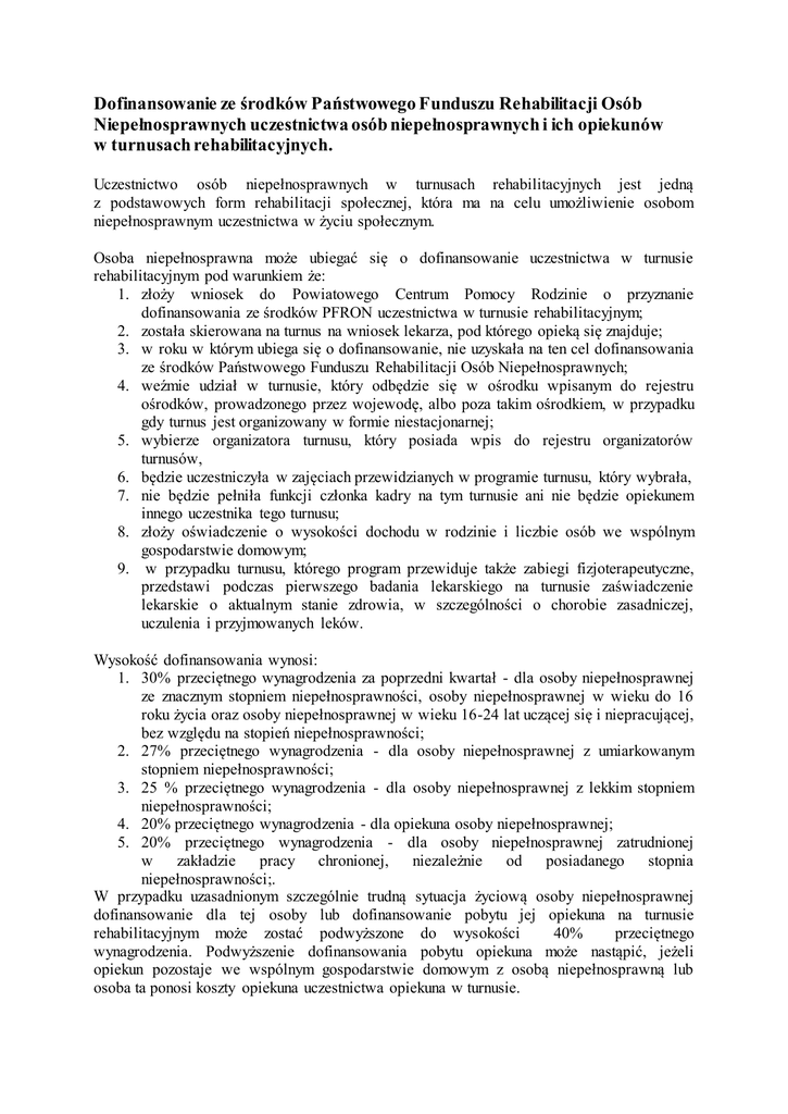 Dofinansowanie ze środków Państwowego Funduszu Rehabilitacji Osób Niepełnosprawnych uczestnictwa osób niepełnosprawnych i ich opiekunów w turnusach rehabilitacyjnych. Uczestnictwo osób niepełnosprawnych w turnusach rehabilitacyjnych jest jedną z podstawowych form rehabilitacji społecznej, która ma na celu umożliwienie osobom niepełnosprawnym uczestnictwa w życiu społecznym. Osoba niepełnosprawna może ubiegać się o dofinansowanie uczestnictwa w turnusie rehabilitacyjnym pod warunkiem że: 1. złoży wniosek do Powiatowego Centrum Pomocy Rodzinie o przyznanie dofinansowania ze środków PFRON uczestnictwa w turnusie rehabilitacyjnym; 2. została skierowana na turnus na wniosek lekarza, pod którego opieką się znajduje; 3. w roku w którym ubiega się o dofinansowanie, nie uzyskała na ten cel dofinansowania ze środków Państwowego Funduszu Rehabilitacji Osób Niepełnosprawnych; 4. weźmie udział w turnusie, który odbędzie się w ośrodku wpisanym do rejestru ośrodków, prowadzonego przez wojewodę, albo poza takim ośrodkiem, w przypadku gdy turnus jest organizowany w formie niestacjonarnej; 5. wybierze organizatora turnusu, który posiada wpis do rejestru organizatorów turnusów, 6. będzie uczestniczyła w zajęciach przewidzianych w programie turnusu, który wybrała, 7. nie będzie pełniła funkcji członka kadry na tym turnusie ani nie będzie opiekunem innego uczestnika tego turnusu; 8. złoży oświadczenie o wysokości dochodu w rodzinie i liczbie osób we wspólnym gospodarstwie domowym; 9. w przypadku turnusu, którego program przewiduje także zabiegi fizjoterapeutyczne, przedstawi podczas pierwszego badania lekarskiego na turnusie zaświadczenie lekarskie o aktualnym stanie zdrowia, w szczególności o chorobie zasadniczej, uczulenia i przyjmowanych leków. Wysokość dofinansowania wynosi: 1. 30% przeciętnego wynagrodzenia za poprzedni kwartał - dla osoby niepełnosprawnej ze znacznym stopniem niepełnosprawności, osoby niepełnosprawnej w wieku do 16 roku życia oraz osoby niepełnosprawnej w wieku 16-24 lat uczącej się i niepracującej, bez względu na stopień niepełnosprawności; 2. 27% przeciętnego wynagrodzenia - dla osoby niepełnosprawnej z umiarkowanym stopniem niepełnosprawności; 3. 25 % przeciętnego wynagrodzenia - dla osoby niepełnosprawnej z lekkim stopniem niepełnosprawności; 4. 20% przeciętnego wynagrodzenia - dla opiekuna osoby niepełnosprawnej; 5. 20% przeciętnego wynagrodzenia - dla osoby niepełnosprawnej zatrudnionej w zakładzie pracy chronionej, niezależnie od posiadanego stopnia niepełnosprawności;. W przypadku uzasadnionym szczególnie trudną sytuacja życiową osoby niepełnosprawnej dofinansowanie dla tej osoby lub dofinansowanie pobytu jej opiekuna na turnusie rehabilitacyjnym może zostać podwyższone do wysokości 40% przeciętnego wynagrodzenia. Podwyższenie dofinansowania pobytu opiekuna może nastąpić, jeżeli opiekun pozostaje we wspólnym gospodarstwie domowym z osobą niepełnosprawną lub osoba ta ponosi koszty opiekuna uczestnictwa opiekuna w turnusie. Dofinansowanie ze środków Funduszu nie przysługuje, jeżeli wnioskodawca ubiegający się o dofinansowanie ma zaległości wobec Funduszu lub podmiot ten był, w ciągu trzech lat przed złożeniem wniosku, stroną umowy zawartej z Funduszem i rozwiązanej z przyczyn leżących po stronie tego podmiotu. Aktualne informacje o ośrodkach i organizatorach turnusów rehabilitacyjnych, posiadających wpisy do rejestrów wojewody dostępne są na Portalu Informacyjno-Usługowym EMPATIA. Podstawa prawna: Ustawa o rehabilitacji zawodowej i społecznej oraz zatrudnianiu osób niepełnosprawnych (tekst jednolity Dz. U z 2011 r. Nr 127 poz.721 z późn. zm.) . Rozporządzenie Ministra Pracy i Polityki Społecznej z dnia 15 listopada 2007 r. w sprawie turnusów rehabilitacyjnych (Dz. U. Nr 230 z 2007r. poz. 1694 z późn.zm).