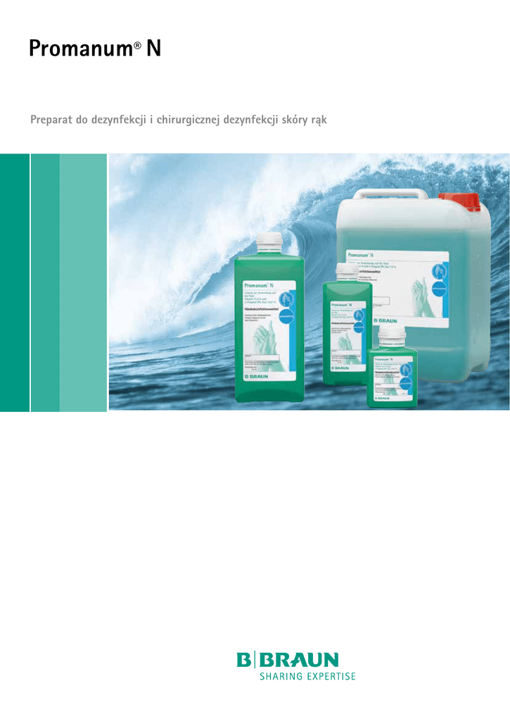Promanum® N Preparat do dezynfekcji i chirurgicznej dezynfekcji skóry rąk Promanum® N Preparat do dezynfekcji i chirurgicznej dezynfekcji skóry rąk Nazwa produktu leczniczego i substancje aktywne Promanum N- Preparat do dezynfekcji i chirurgicznej dezynfekcji skóry rąk , zawiera w 100g preparatu: 78,1g alkoholu etylowego 96% i 10g alkoholu izopropylowego. Substancje pomocnicze: sorbitol, powidon, mirystynian izopropylu, cetearyloetyloheksenin, błękit patentowy, żółcień chinolinowa, kompozycja zapachowa Flair PH 799893. Grupa farmakologiczna Leki dermatologiczne, pozostałe antyseptyki i środki do dezynfekcji, kod ATC: D08AX Postać farmaceutyczna Płyn do stosowania na skórę. Opakowania Pojemniki z polietylenu o zawartości i 100ml, 500ml i 1000ml oraz kanister 5000ml. Wskazania do stosowania Dezynfekcja skóry rąk i chirurgiczna dezynfekcja skóry rąk Przeciwwskazania Nadwrażliwość na etanol, alkohol izopropylowy, lub na którąkolwiek z substancji pomocniczych produktu leczniczego. Nie stosować doustnie ani na zraniona skórę Specjalne środki ostrożności podczas przechowywania Lek łatwopalny, przechowywać w temperaturze poniżej 250C Pojemnik powinien być szczelnie zamknięty. Stosowanie produktu leczniczego Higieniczna dezynfekcja skóry rąk -Wcierać w dłonie przez 30 sekund 3 ml nierozcieńczonego produktu leczniczego Promanum N, aż do wyschnięcia skóry Chirurgiczna dezynfekcją skóry rąk -Wcierać w suche i umyte dłonie i przedramiona przez 90 sekund 2 razy po 3 ml nierozcieńczony produkt leczniczy Promanum N, tak aby skóra była cały czas zwilżona podczas aplikacji a po zakończeniu procesu skóra musi być sucha. Właściwości i skuteczność produktu leczniczego Wyjątkowa kombinacja alkoholowych substancji aktywnych doskonałe właściwości: - bakteriobójcze / w tym MRSA/ -prątkobójcze -wirusobójcze /HIV, Rotavirus, Herpes Simplex, HBV, HCV, Adenovirus, Norwalk/ -grzybobójcze optymalnie dobrane składniki pielęgnujące skórę własności hipoalergiczne i przyjemny zapach efekt przedłużonego działania /do min. 3 godzin/ dermatologicznie przebadany Okres ważności Okres ważności w nienaruszonym opakowaniu 5 lat., po pierwszym otwarciu opakowania12 miesięcy (nie dłużej niż okres ważności podany na etykiecie) Podmiot odpowiedzialny i wytwórca B. Braun Melsungen AG Carl-Braun Strasse 1 D-34212 Melsungen ,Niemcy Numer pozwolenia na dopuszczenie do obrotu Świadectwo Rejestracji nr 11415/M/99 Pozwolenie nr 13023 AESCULAP CHIFA Sp. z o.o. | ul. Tysi¹clecia 14 | 64-300 Nowy Tomyœl, tel. (61) 44 20 100 | fax (61) 44 23 936 | www.chifa.com.pl AESCULAP CHIFA - firma grupy B. Braun OPM-IC-003 23.11.2011
