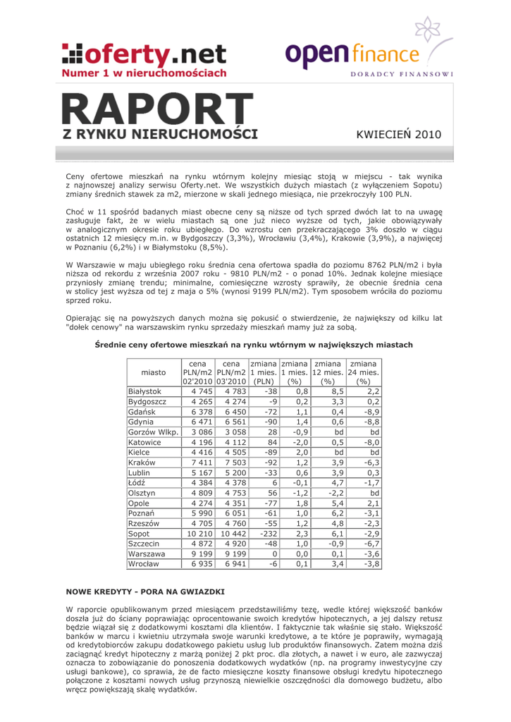 Ceny ofertowe mieszkań na rynku wtórnym kolejny miesiąc stoją w miejscu - tak wynika z najnowszej analizy serwisu Oferty.net. We wszystkich dużych miastach (z wyłączeniem Sopotu) zmiany średnich stawek za m2, mierzone w skali jednego miesiąca, nie przekroczyły 100 PLN. Choć w 11 spośród badanych miast obecne ceny są niższe od tych sprzed dwóch lat to na uwagę zasługuje fakt, że w wielu miastach są one już nieco wyższe od tych, jakie obowiązywały w analogicznym okresie roku ubiegłego. Do wzrostu cen przekraczającego 3% doszło w ciągu ostatnich 12 miesięcy m.in. w Bydgoszczy (3,3%), Wrocławiu (3,4%), Krakowie (3,9%), a najwięcej w Poznaniu (6,2%) i w Białymstoku (8,5%). W Warszawie w maju ubiegłego roku średnia cena ofertowa spadła do poziomu 8762 PLN/m2 i była niższa od rekordu z września 2007 roku - 9810 PLN/m2 - o ponad 10%. Jednak kolejne miesiące przyniosły zmianę trendu; minimalne, comiesięczne wzrosty sprawiły, że obecnie średnia cena w stolicy jest wyższa od tej z maja o 5% (wynosi 9199 PLN/m2). Tym sposobem wróciła do poziomu sprzed roku. Opierając się na powyższych danych można się pokusić o stwierdzenie, że największy od kilku lat "dołek cenowy" na warszawskim rynku sprzedaży mieszkań mamy już za sobą. Średnie ceny ofertowe mieszkań na rynku wtórnym w największych miastach cena cena zmiana zmiana zmiana zmiana PLN/m2 PLN/m2 1 mies. 1 mies. 12 mies. 24 mies. 02'2010 03'2010 (PLN) (%) (%) (%) Białystok 4 745 4 783 -38 0,8 8,5 2,2 Bydgoszcz 4 265 4 274 -9 0,2 3,3 0,2 Gdańsk 6 378 6 450 -72 1,1 0,4 -8,9 Gdynia 6 471 6 561 -90 1,4 0,6 -8,8 Gorzów Wlkp. 3 086 3 058 28 -0,9 bd bd Katowice 4 196 4 112 84 -2,0 0,5 -8,0 Kielce 4 416 4 505 -89 2,0 bd bd Kraków 7 411 7 503 -92 1,2 3,9 -6,3 Lublin 5 167 5 200 -33 0,6 3,9 0,3 Łódź 4 384 4 378 6 -0,1 4,7 -1,7 Olsztyn 4 809 4 753 56 -1,2 -2,2 bd Opole 4 274 4 351 -77 1,8 5,4 2,1 Poznań 5 990 6 051 -61 1,0 6,2 -3,1 Rzeszów 4 705 4 760 -55 1,2 4,8 -2,3 Sopot 10 210 10 442 -232 2,3 6,1 -2,9 Szczecin 4 872 4 920 -48 1,0 -0,9 -6,7 Warszawa 9 199 9 199 0 0,0 0,1 -3,6 Wrocław 6 935 6 941 -6 0,1 3,4 -3,8 miasto NOWE KREDYTY - PORA NA GWIAZDKI W raporcie opublikowanym przed miesiącem przedstawiliśmy tezę, wedle której większość banków doszła już do ściany poprawiając oprocentowanie swoich kredytów hipotecznych, a jej dalszy retusz będzie wiązał się z dodatkowymi kosztami dla klientów. I faktycznie tak właśnie się stało. Większość banków w marcu i kwietniu utrzymała swoje warunki kredytowe, a te które je poprawiły, wymagają od kredytobiorców zakupu dodatkowego pakietu usług lub produktów finansowych. Zatem można dziś zaciągnąć kredyt hipoteczny z marżą poniżej 2 pkt proc. dla złotych, a nawet i w euro, ale zazwyczaj oznacza to zobowiązanie do ponoszenia dodatkowych wydatków (np. na programy inwestycyjne czy usługi bankowe), co sprawia, że de facto miesięczne koszty finansowe obsługi kredytu hipotecznego połączone z kosztami nowych usług przynoszą niewielkie oszczędności dla domowego budżetu, albo wręcz powiększają skalę wydatków. O rozluźnieniu rynku można mówić już nie w kontekście cen, ale dostępności kredytów. W ostatnim czasie coraz więcej banków udostępnia kredyty na 100 proc. wartości nieruchomości, a nawet powyżej tego progu. Liderem zmian pod tym względem jest Alior Bank, który zdecydował się na wypłaty kredytów nawet do 120 proc. kupowanej nieruchomości, pod warunkiem, że nadwyżka zostanie wykorzystana na uregulowanie kosztów dodatkowych (np. prowizji bankowej, aktu notarialnego czy wpisu do hipoteki) lub remont czy też urządzenie kupowanej nieruchomości, wedle ściśle przestrzeganego harmonogramu i kosztorysu takiej inwestycji. Jednak za sprawą zmian, jakie dokonują się na rynku pieniężnym, który staje się coraz bardziej płynny, za sprawą spadku oprocentowania lokat bankowych i rynkowych stóp procentowych można spodziewać się, że część banków postara się jeszcze uatrakcyjnić swoją ofertę kredytową by przyciągnąć klientów. Dlatego nie wykluczone, że przed końcem półrocza zobaczymy jeszcze spadek średnich marż kredytów hipotecznych, a obniżone - przynajmniej czasowo - mogą być także koszty prowizji bankowych. KREDYTY SPŁACANE - RATY W DÓŁ Tym razem to zadłużeni w złotych mają lepsze powody do zacierania rąk. Od naszego poprzedniego raportu wartość euro wzrosła z 3,87 do 3,91 PLN, a franka z 2,67 do 2,71 PLN, co - przy utrzymaniu stóp procentowych w strefie euro i w Szwajcarii na rekordowo niskich poziomach - oznacza wzrost rat kredytów odpowiednio o 1-1,5 proc. W tym samym czasie w przeciwnym kierunku poruszały się raty kredytów złotowych, które co prawda nie są wrażliwe na zmiany kursów walutowych, ale na stopę procentową - jak najbardziej. A przez ostatni miesiąc trzymiesięczna stopa WIBOR, o której wysokość opiera się oprocentowanie większości złotowych kredytów hipotecznych spadła z 4,12 do 3,89 proc. Taki ruch przekłada się na spadek rat kredytów o ok. 2,5 proc., lub licząc inaczej ratę niższą o ok. 15 PLN dla każdych pożyczonych 100 tys. PLN. Jedyny problem polega na tym, że banki ustalają oprocentowanie większości kredytów na początku kolejnego kwartału, zatem spadek stóp procentowych w rzeczywistości daje w tej chwili niewiele spłacającym kredyty. Z aktualizacją oprocentowania i liczeniem oszczędności trzeba będzie poczekać do końca czerwca. Są jednak spore szanse na to, że niskie stopy procentowe utrzymają się do tego czasu. Na pocieszenie warto dodać, że raty płacone w II kwartale obliczane były na podstawie wysokości WIBOR z końca I kwartału, a i wówczas należał on do najniższych w historii. Zatem tak czy owak, raty płaconych obecnie kredytów są niższe niż kiedykolwiek wcześniej i prawdopodobnie uda się je nieco obniżyć w III kwartale. STAGNACJA NA RYNKU 
